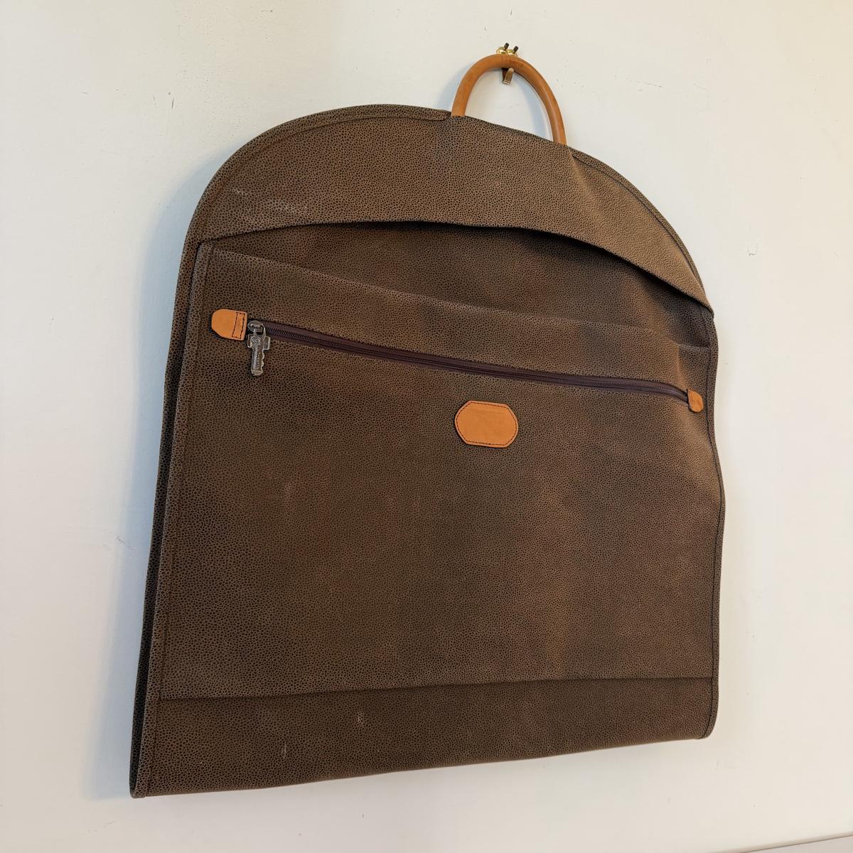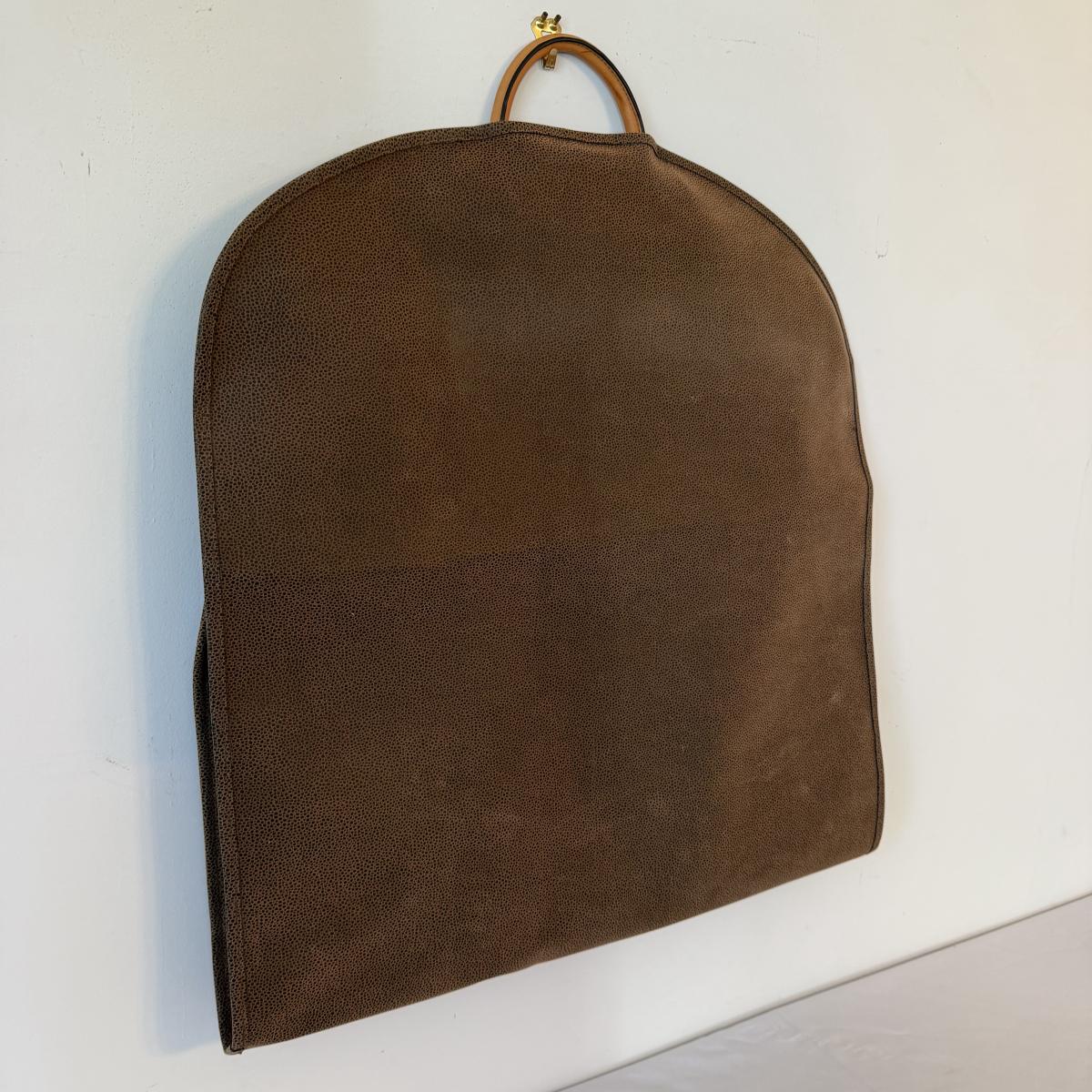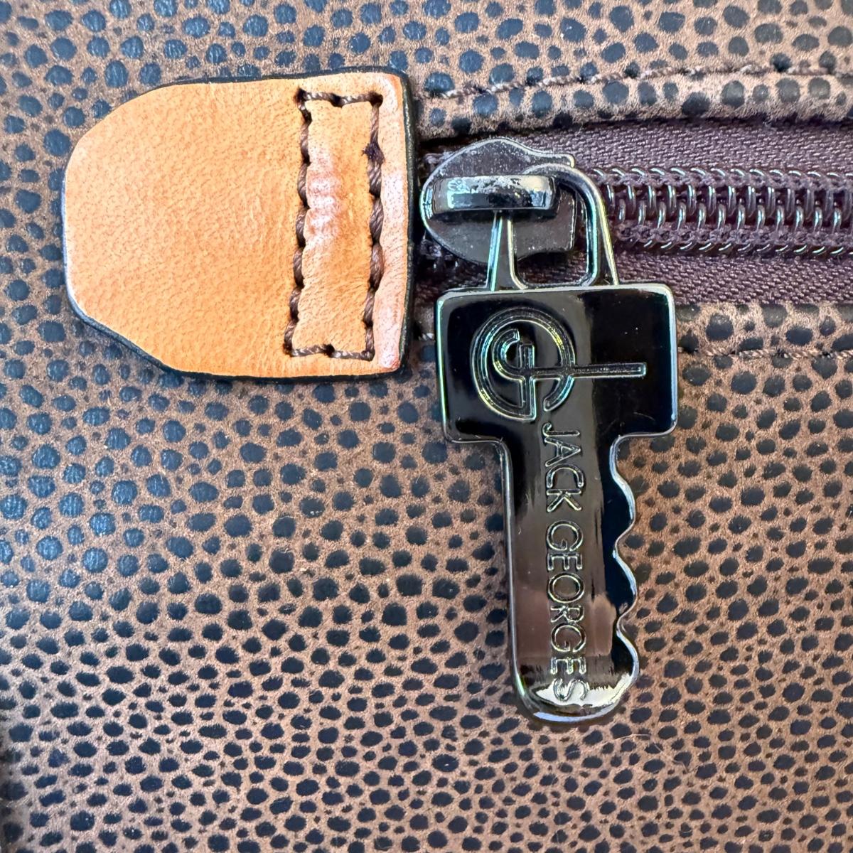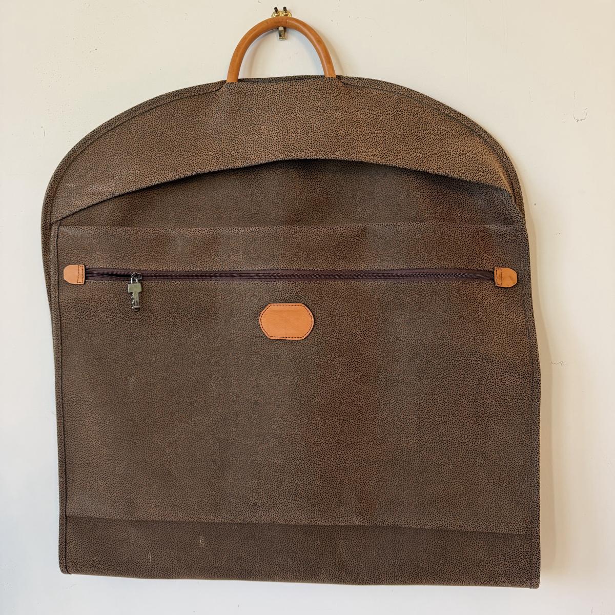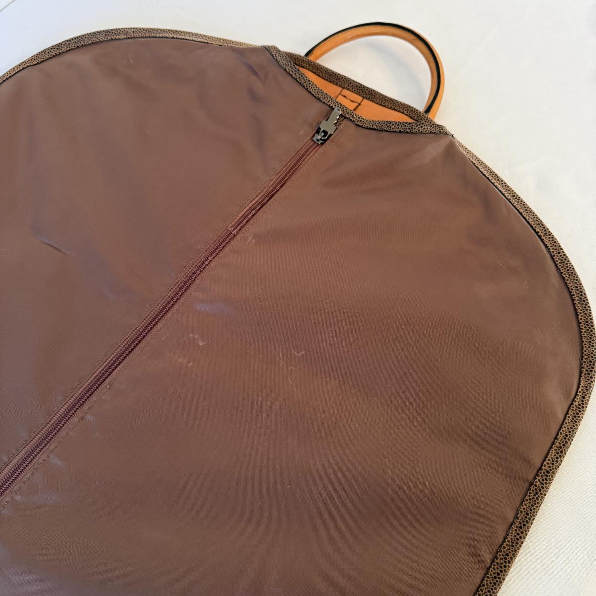 This is a Jack Georges brand garment cover bag, made from what appears to be shagreen-patterned leather. It has one large zippered pocket on the exterior, with an interior compartment for your garment plus two smaller zippered pockets. Unfolded the item measures 23” x 48.5”, not including the handle. A few areas of discoloration are shown in the photos.