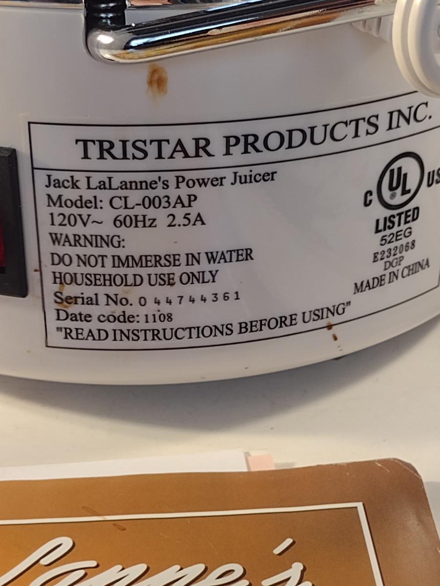 Jack La Lanne's Power Juicer. All parts appear to be present, but item is untested.