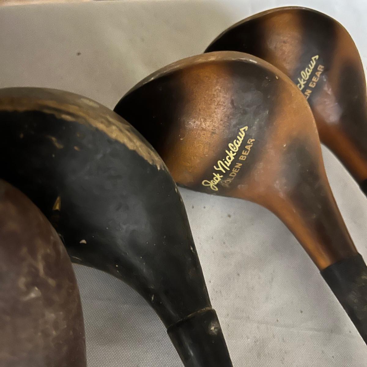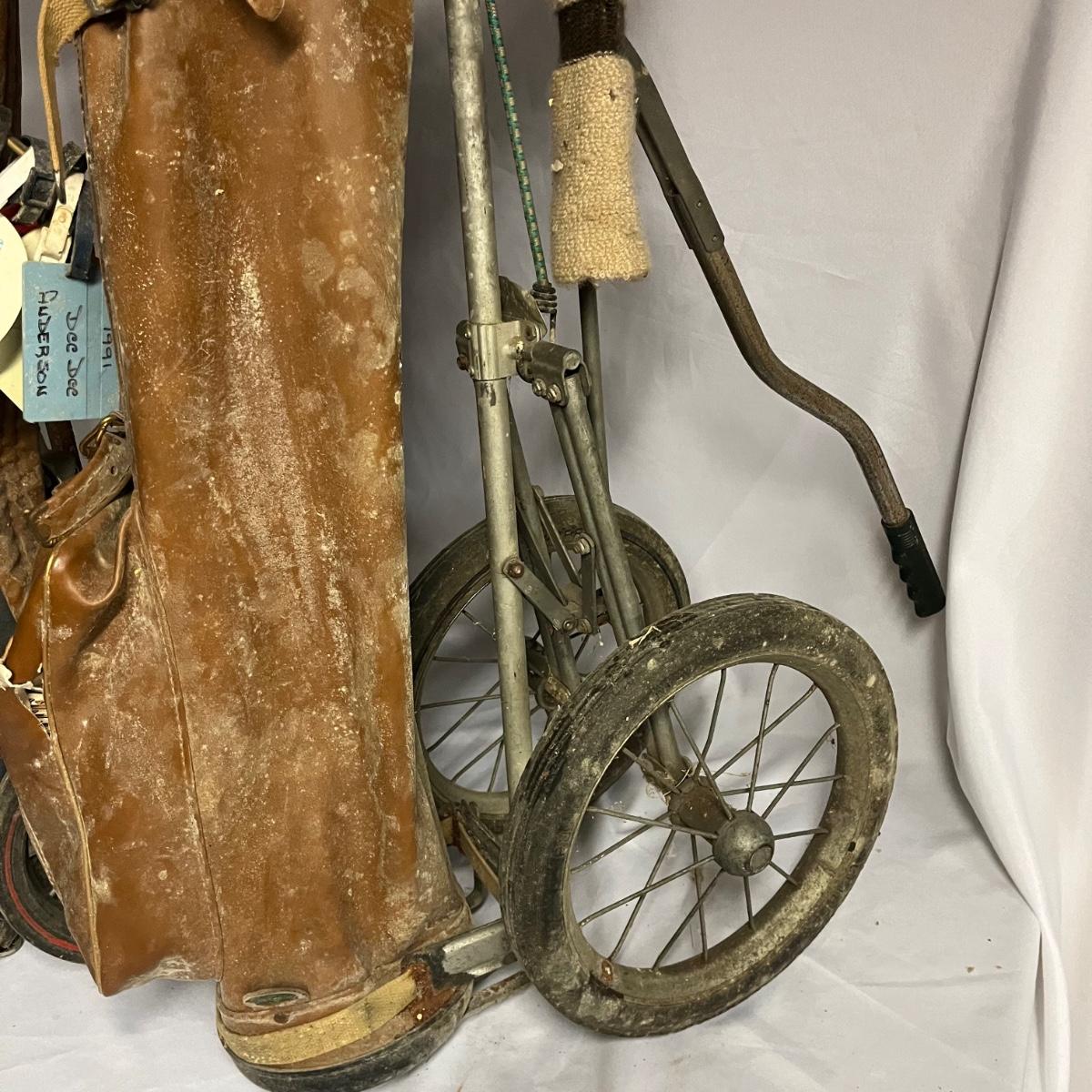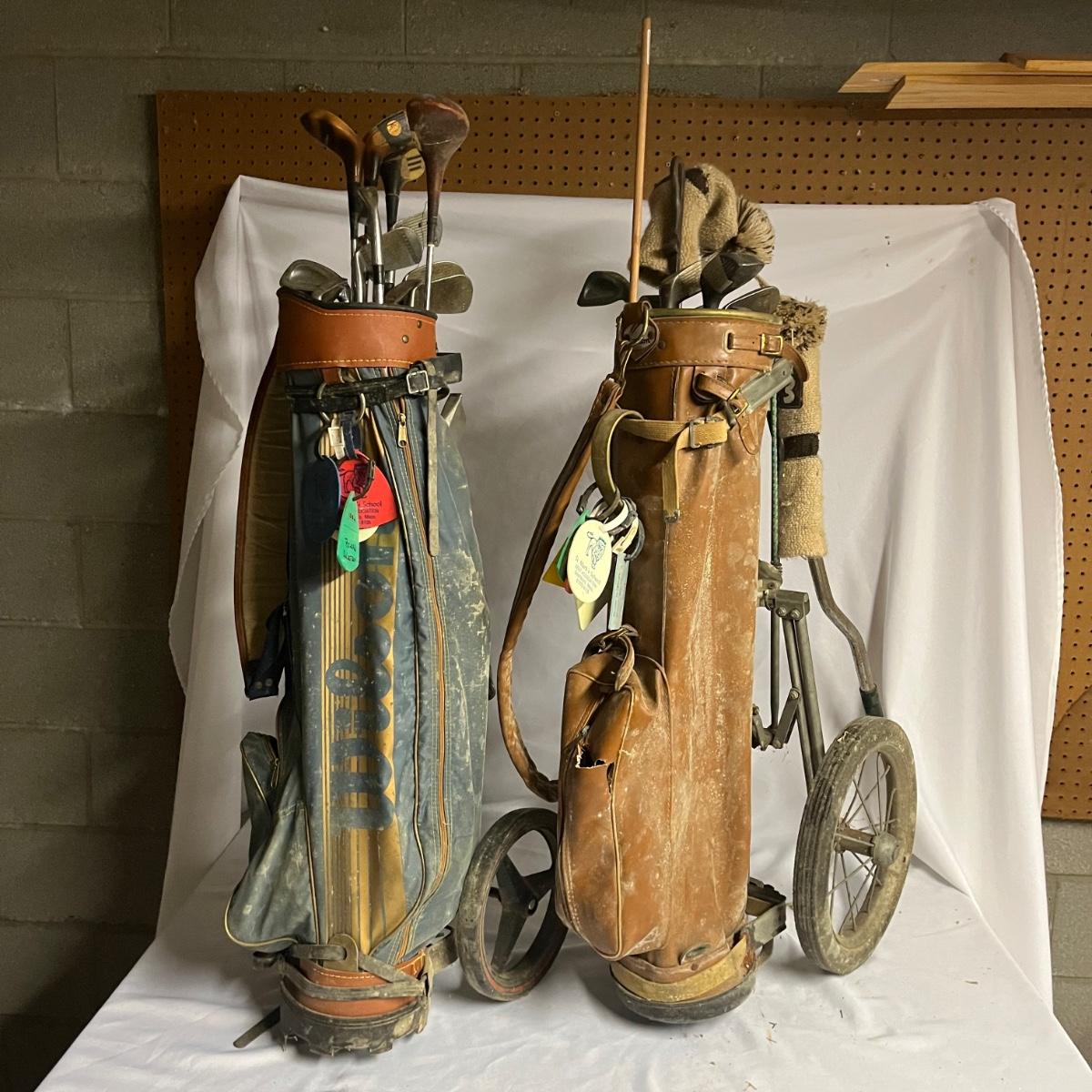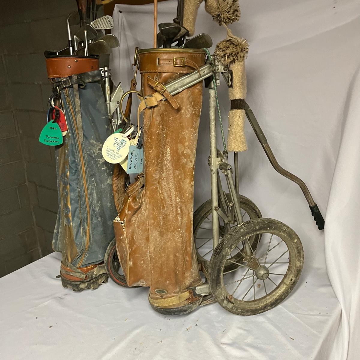 Lot includes 3 and 5 wood Jack Nicklaus MacGregor woods, Wilson Irons, Spalding irons, vintage bags and wheeled bag caddy.