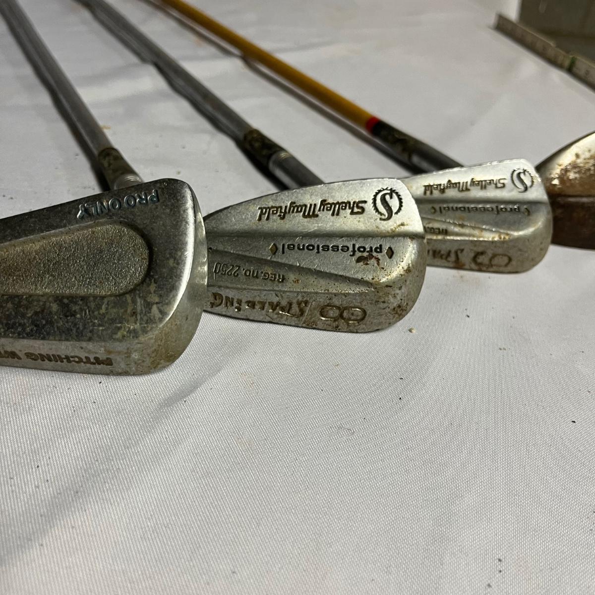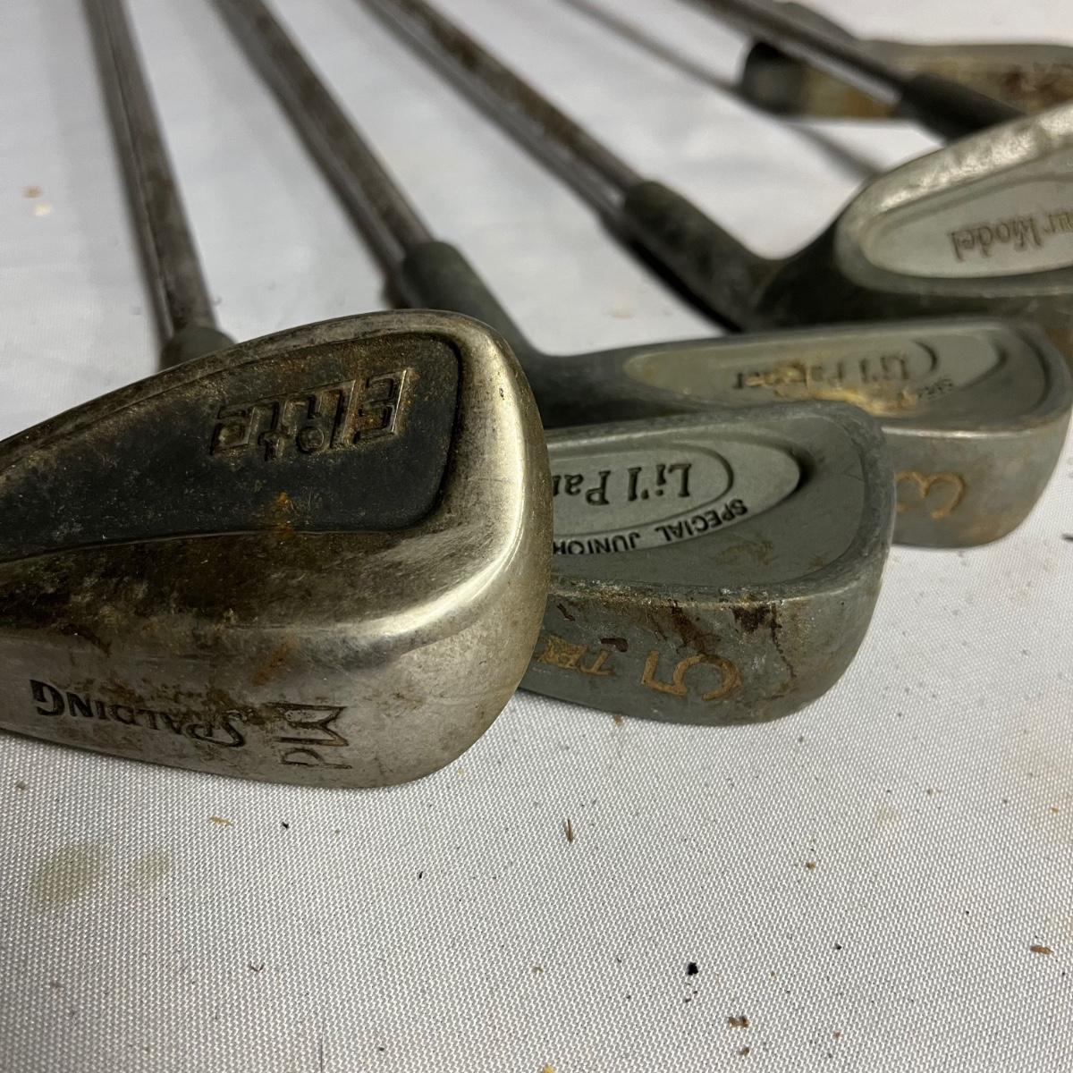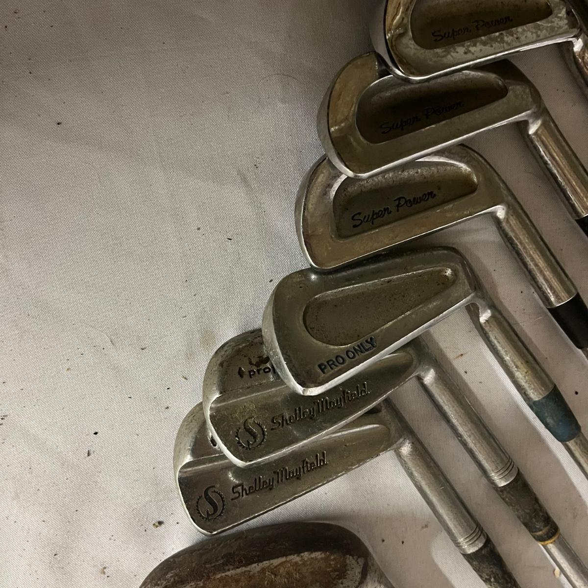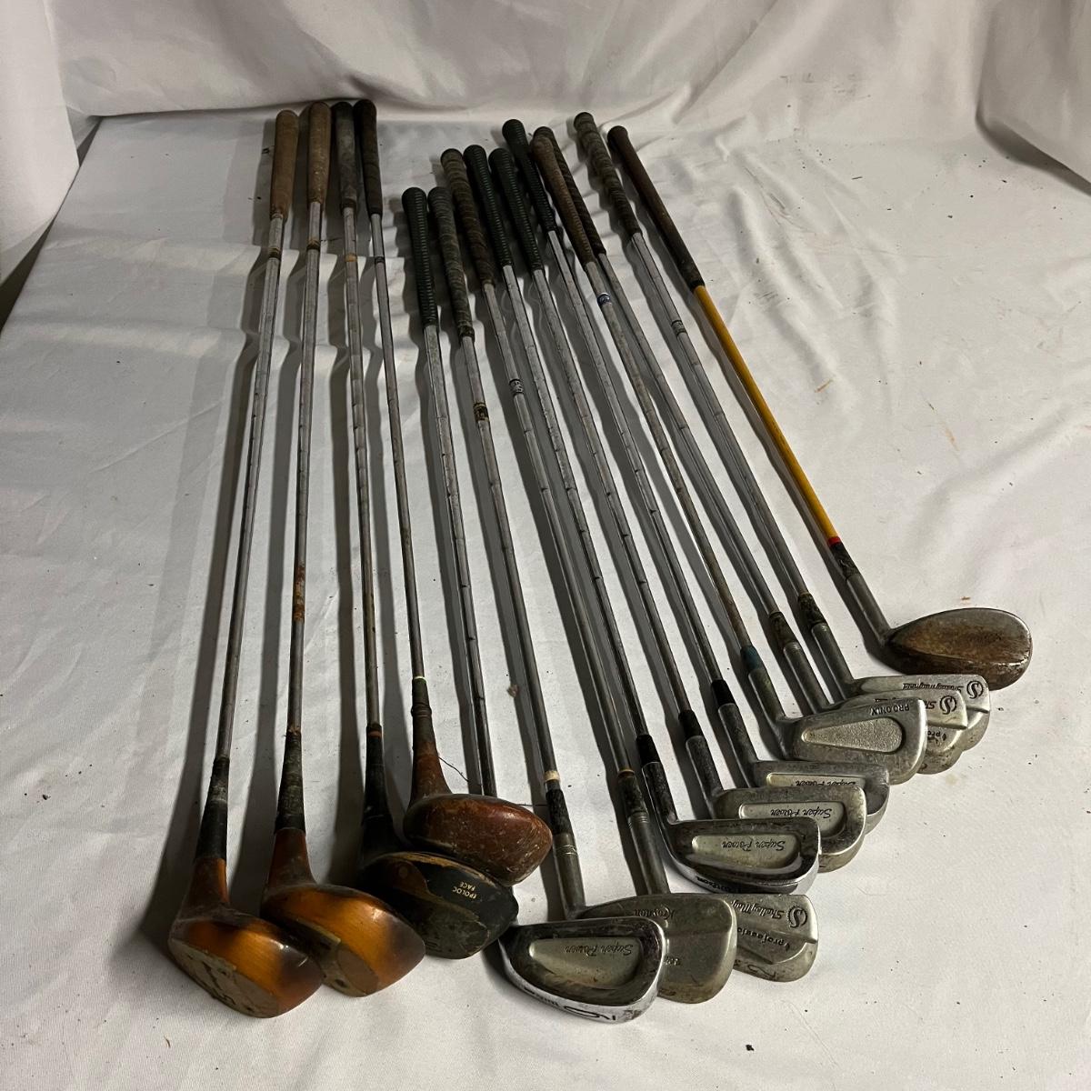 Lot includes 3 and 5 wood Jack Nicklaus MacGregor woods, Wilson Irons, Spalding irons, vintage bags and wheeled bag caddy.
