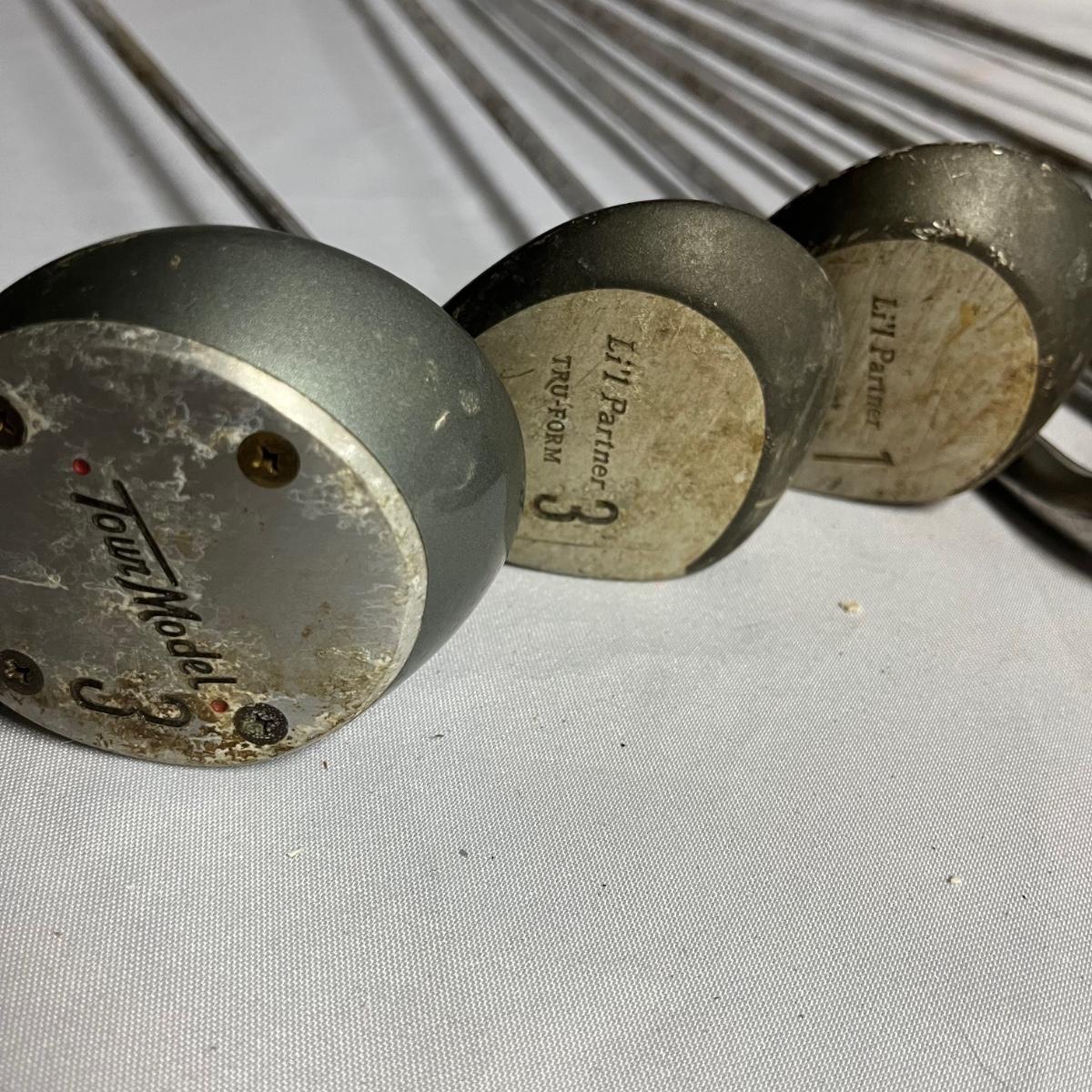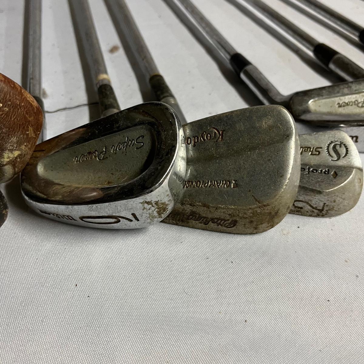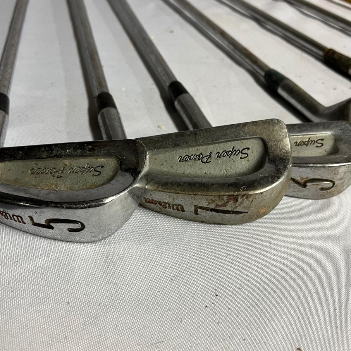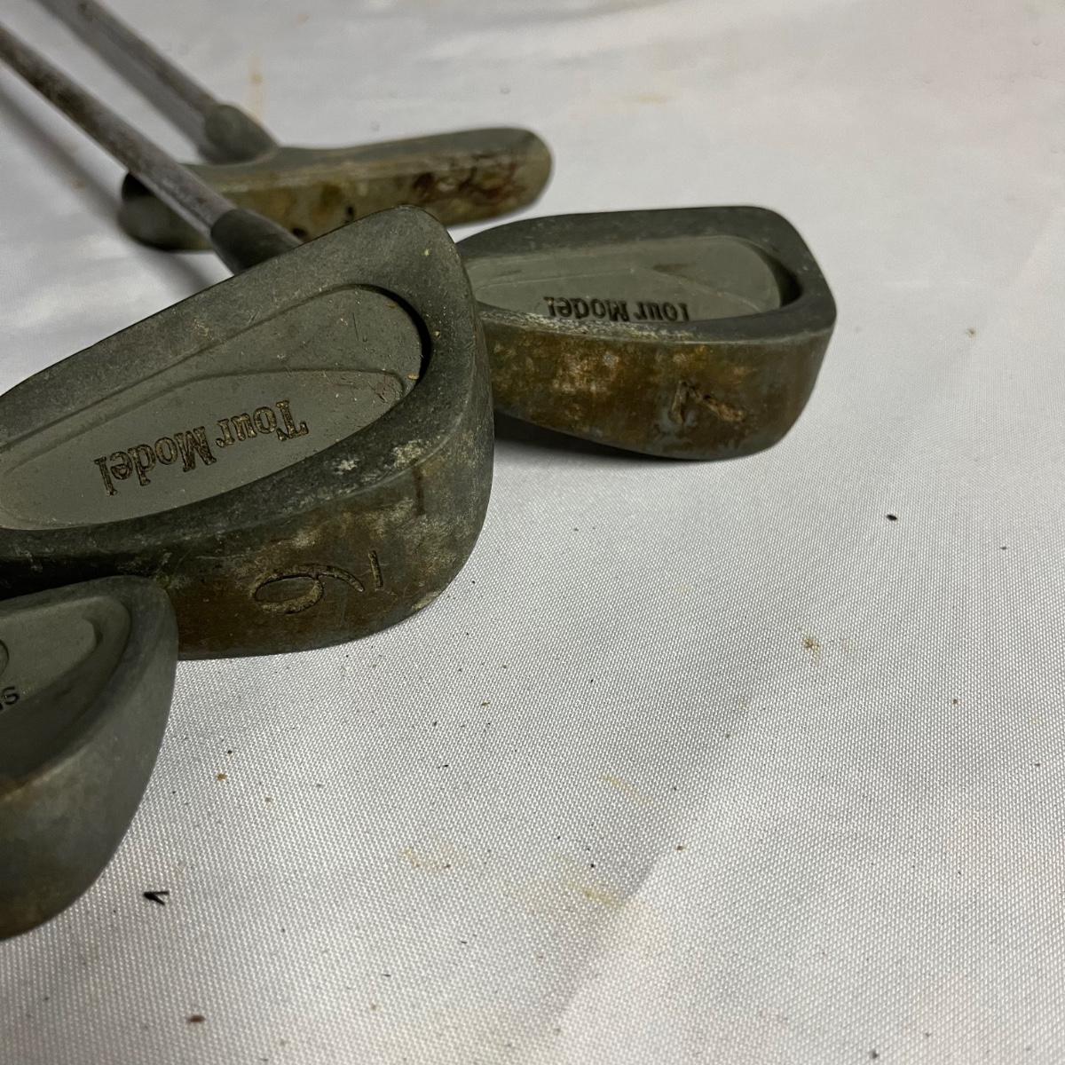 Lot includes 3 and 5 wood Jack Nicklaus MacGregor woods, Wilson Irons, Spalding irons, vintage bags and wheeled bag caddy.