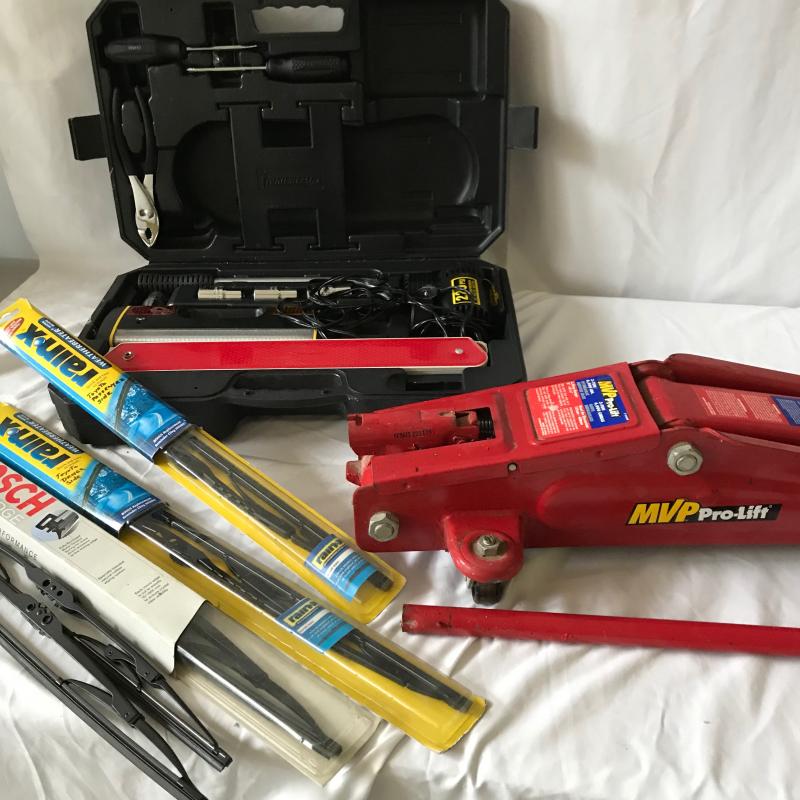 Lot includes 3-ton MVP Pro-Lift jack, Michelin roadside kit, and various windshield wiper replacements. No shipping available. Local pickup only in Hendersonville, NC.