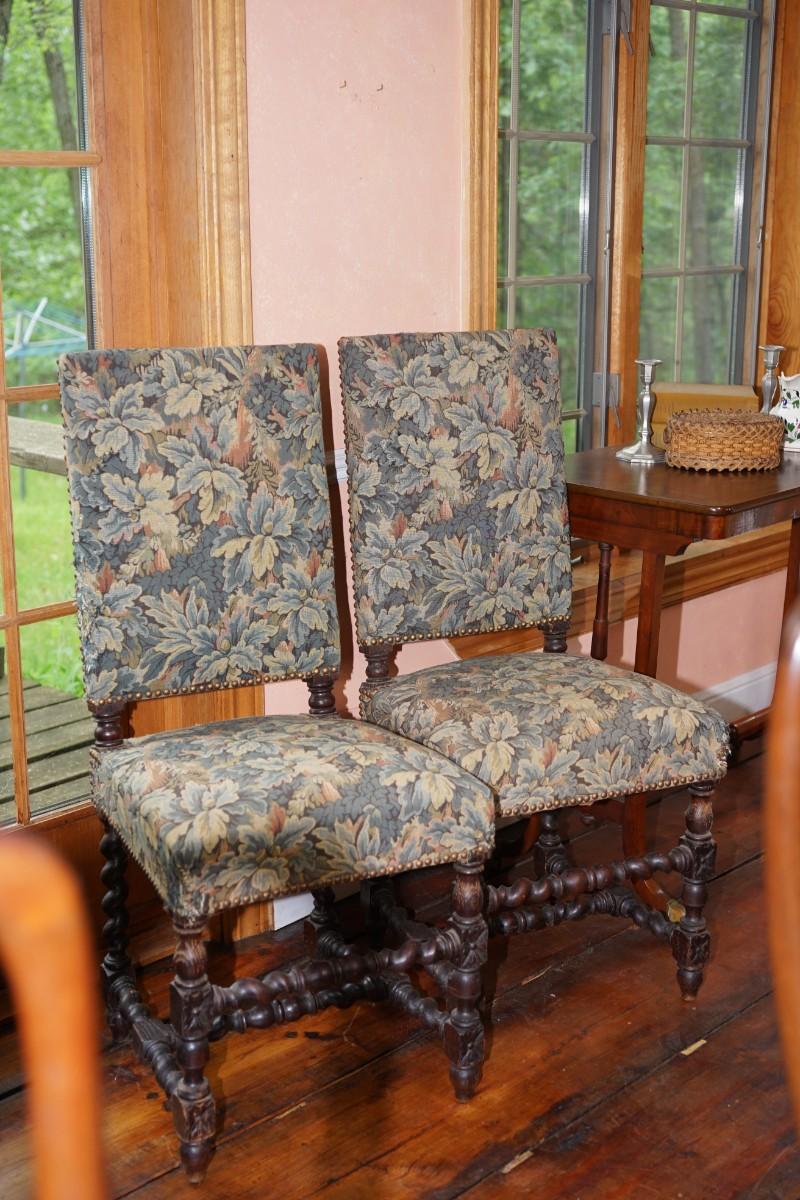 In the style of the Jacobean period a pair of English early 1900's side chairs.