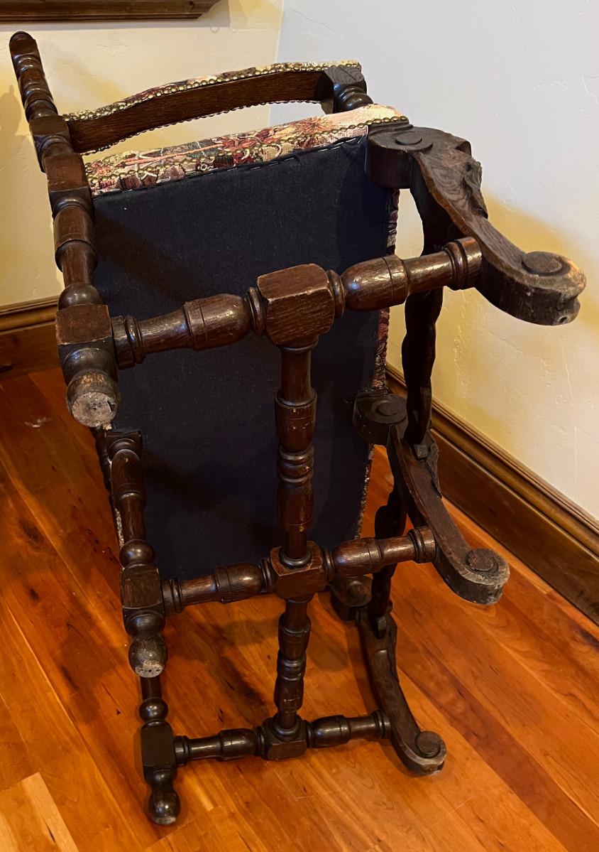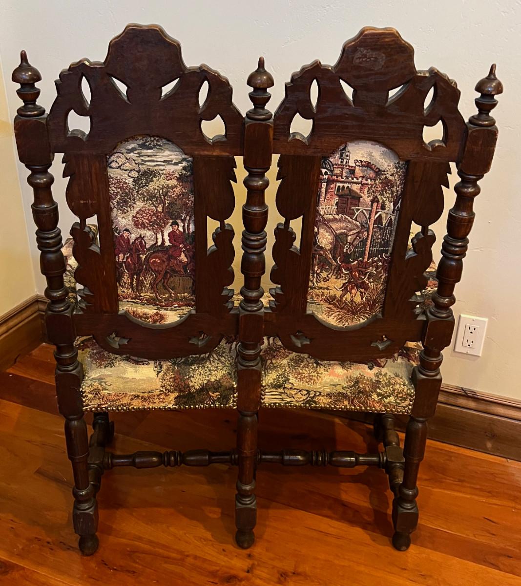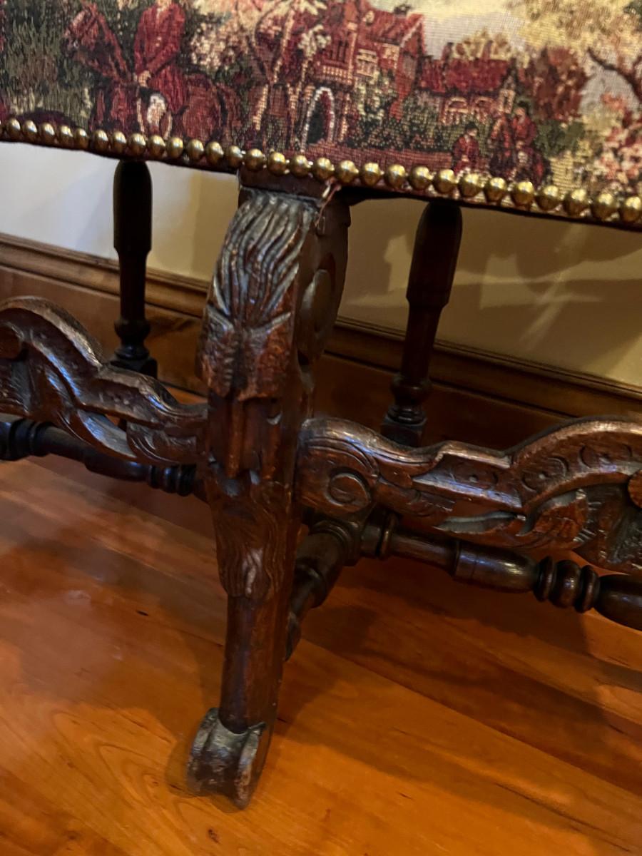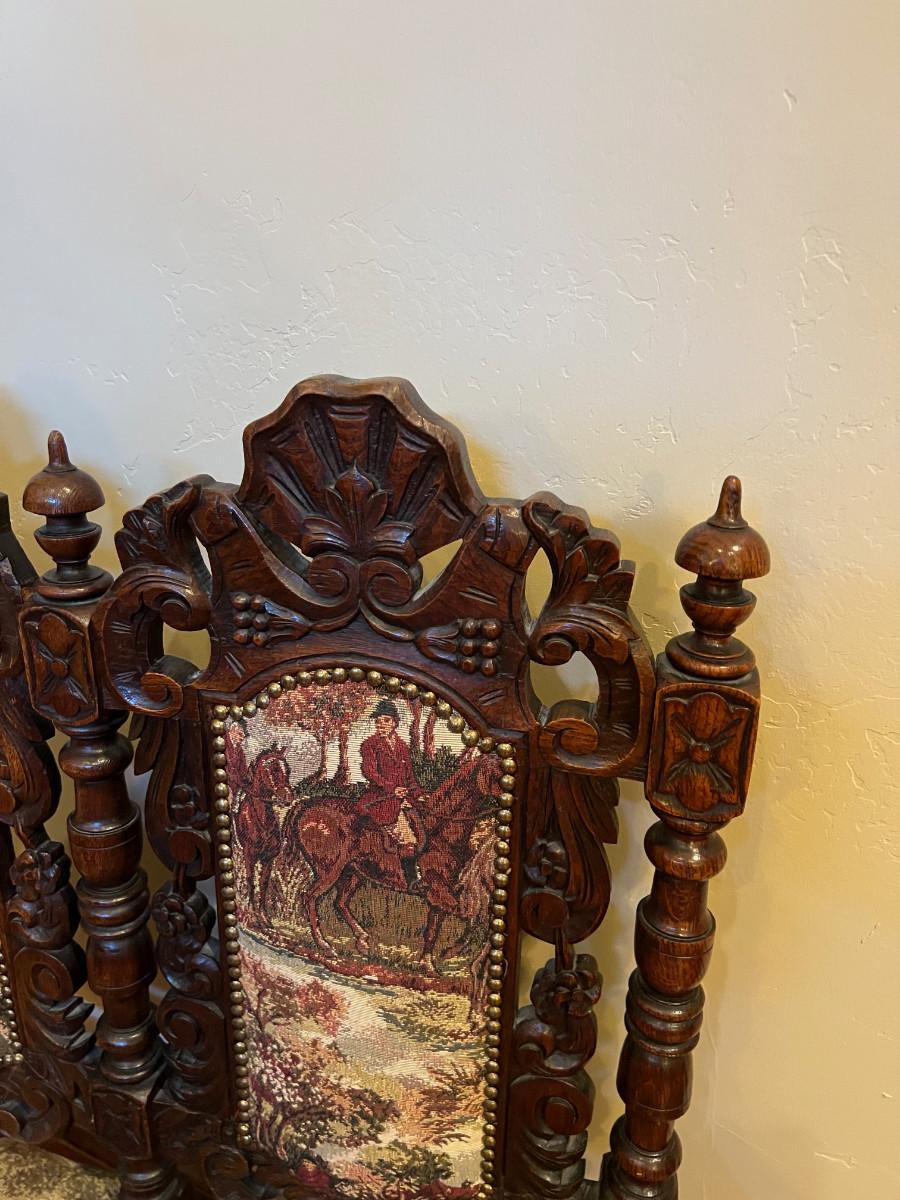 Jacobean/Gothic English Oak Parsons Bench Carved, Turned wood, English hunt and farm scene tapestry style fabric. Good condition, 36" wide, 20" deep, seat at 18" back is 45" off the ground. Antique item circa 1870.