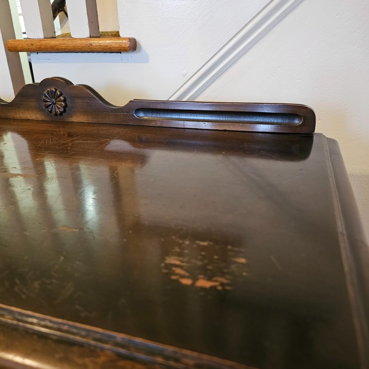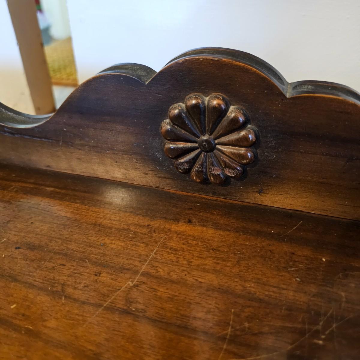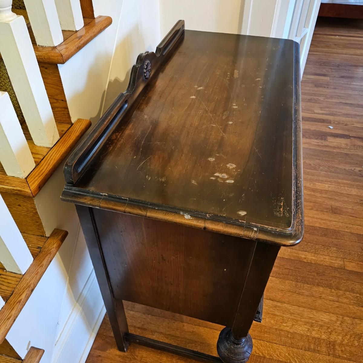 Wooden sideboard/server in the Jacobean revival style made popular in the 1930's. Piece has double opening doors on front, full space for storage inside. Small backset piece on top has rosette decoration. Item measures 38" x 17.5" x 37.5"H. Top, sides and legs have numerous blemishes and nicks. See photos for details. Local pickup only. This item is located on the main floor of the house and will not need to be moved up or down any stairs.