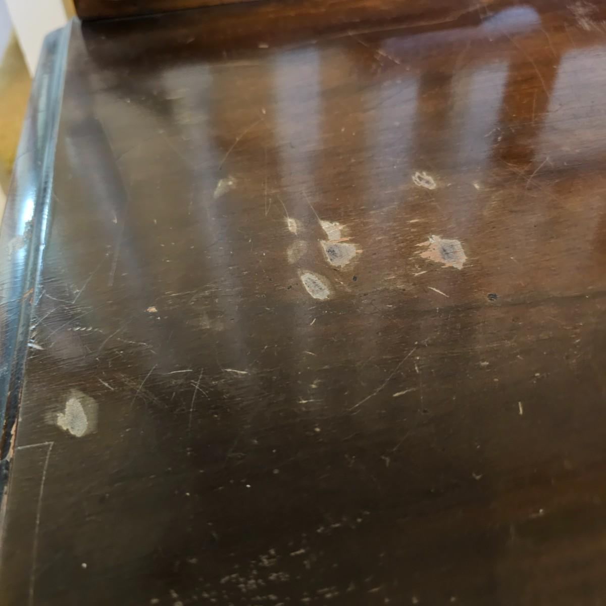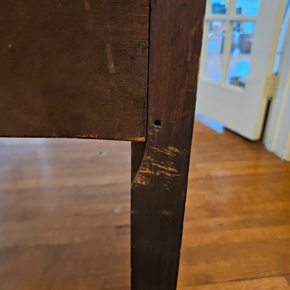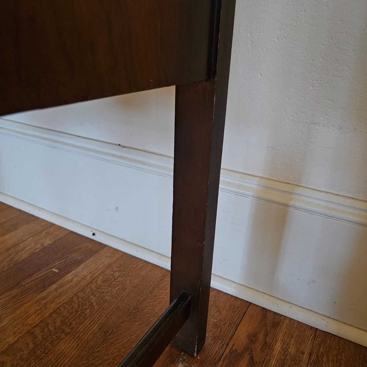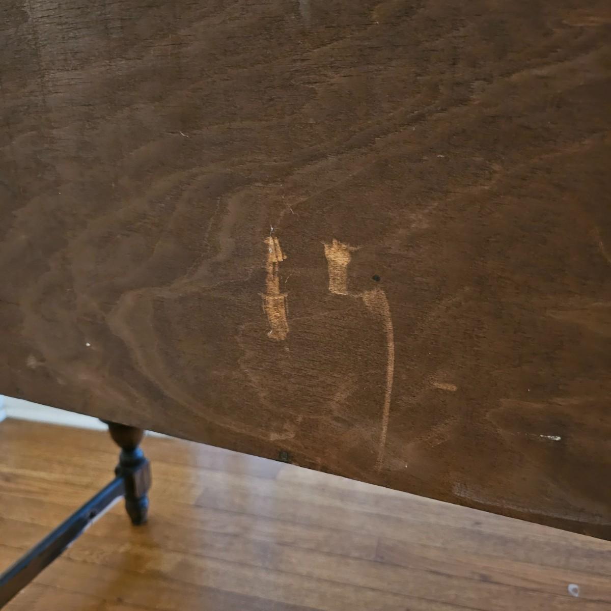 Wooden sideboard/server in the Jacobean revival style made popular in the 1930's. Piece has double opening doors on front, full space for storage inside. Small backset piece on top has rosette decoration. Item measures 38" x 17.5" x 37.5"H. Top, sides and legs have numerous blemishes and nicks. See photos for details. Local pickup only. This item is located on the main floor of the house and will not need to be moved up or down any stairs.