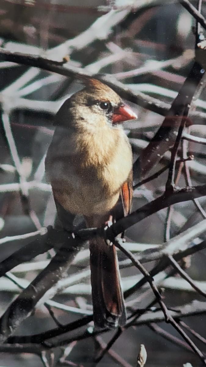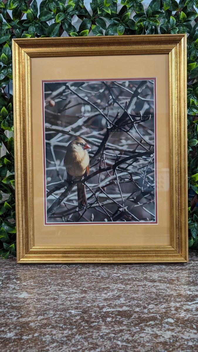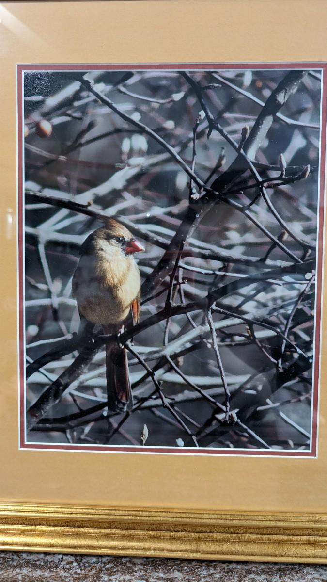 This is a Jacqueline Jones Framed Photography Cardinal Art Wall Decor. Some nicks and wear to frame. The frame is approximately 21.75" x 16.75".