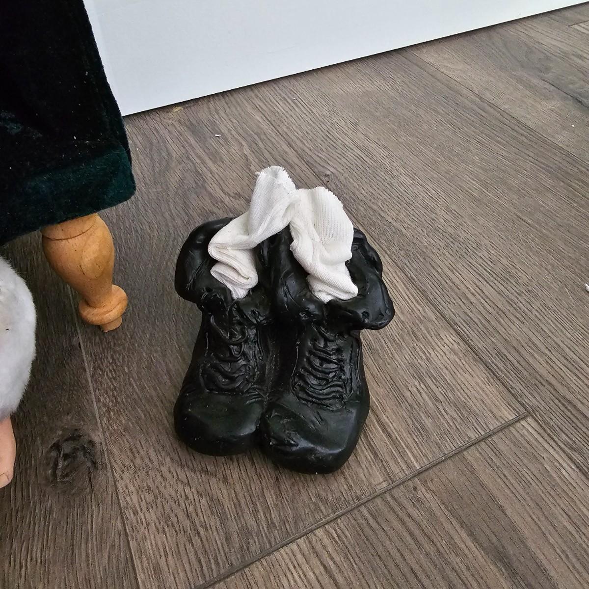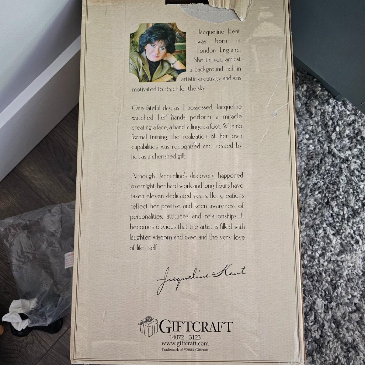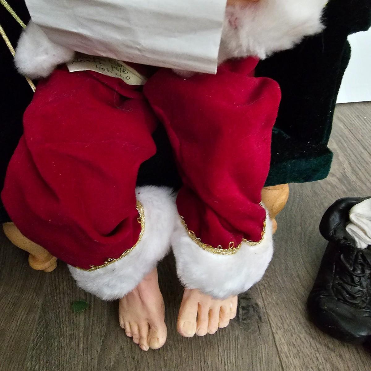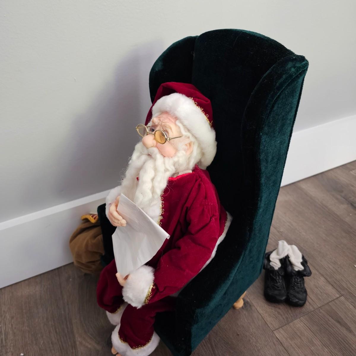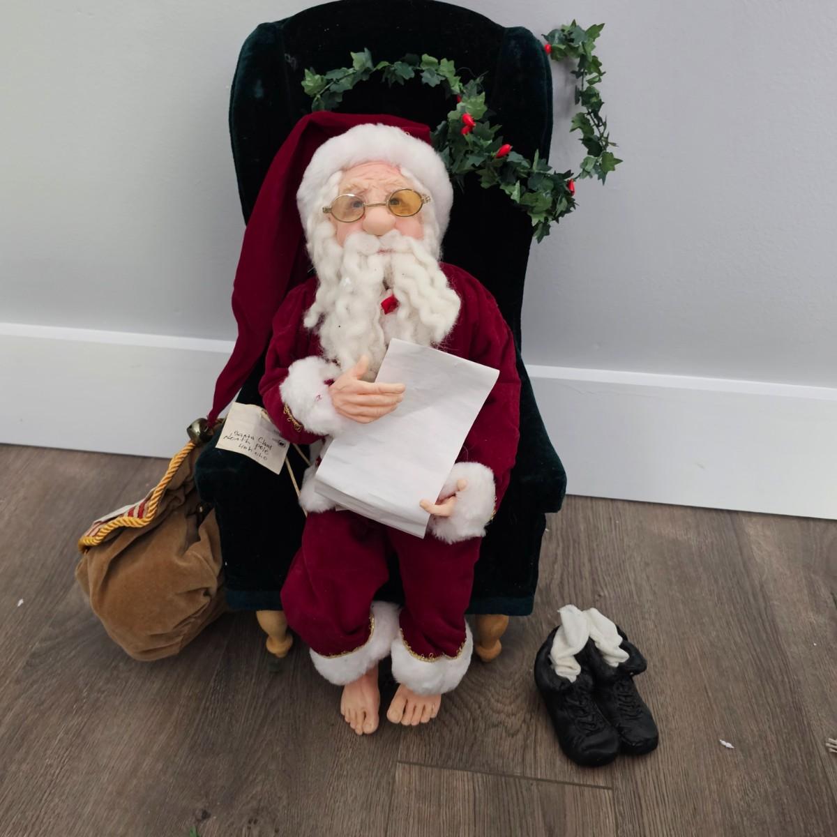 Part of the Christmas Collection by Jacqueline Kent, Santa is shown checking his list while relaxing in his chair. A bag of letters and his boots sit nearby. Santa and items measure 14" x 10" x 18"H. In original box. See photos for details. Shipping available.