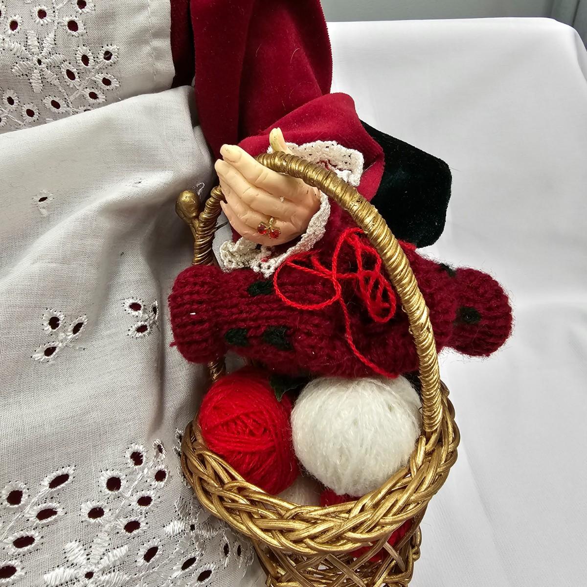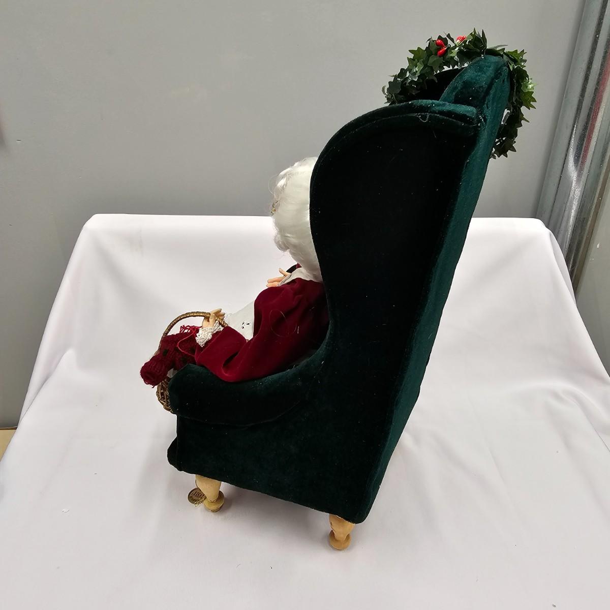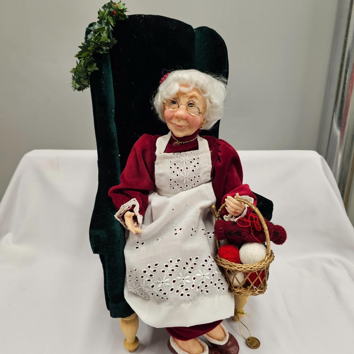 A Christmas Collection piece by Jacqueline Kent. Mrs. Claus sits quietly in her high back chair with her knitting basket at hand. Velveteen fabric covers the chair with wooden legs. The ensemble measures 10" x 10" x 18"H. In original box. See photos for details. Shipping available.