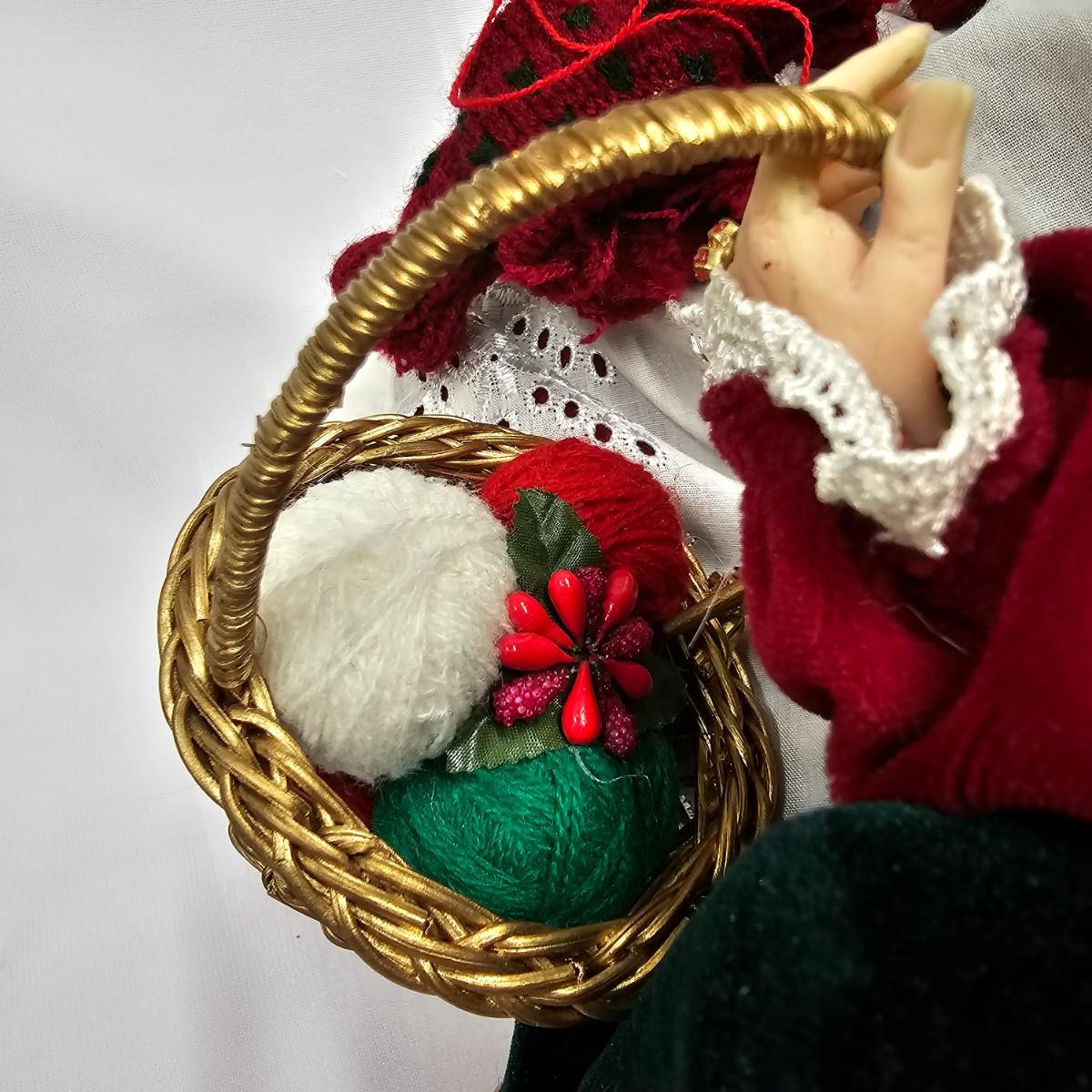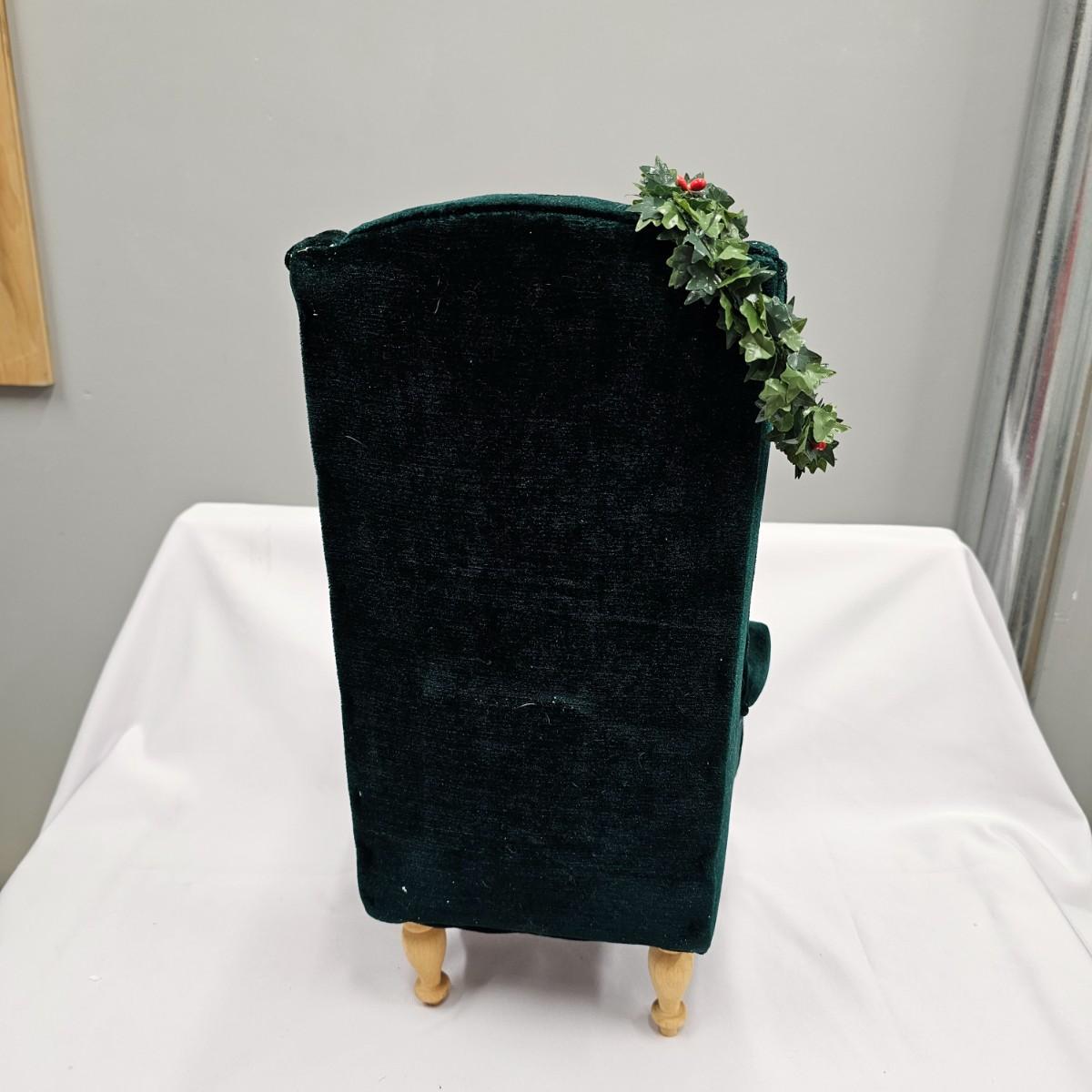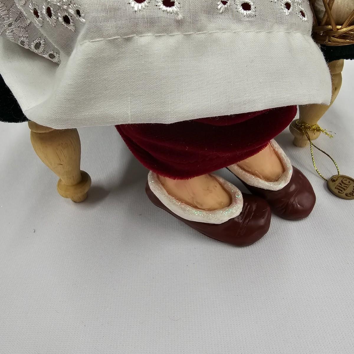 A Christmas Collection piece by Jacqueline Kent. Mrs. Claus sits quietly in her high back chair with her knitting basket at hand. Velveteen fabric covers the chair with wooden legs. The ensemble measures 10" x 10" x 18"H. In original box. See photos for details. Shipping available.