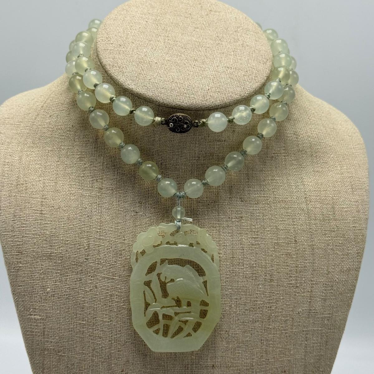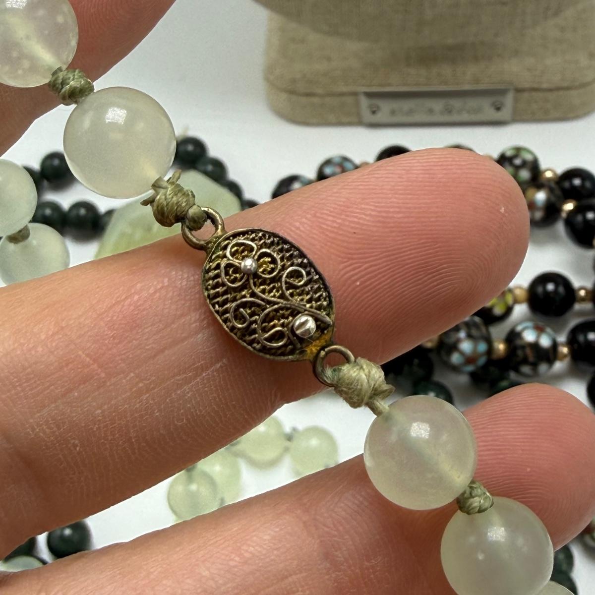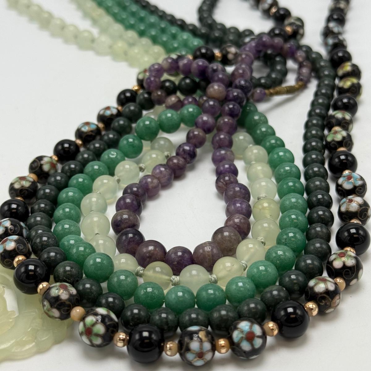 Beautiful lot contains five beaded necklaces. Four necklaces appear to be different shades of Jade, two of which have pendants (one pendant needs to be reattached, which appears to be an easy fix). The lightest green necklace with the carved pendant has a different sound than the other three jade-like necklaces. It has a more high pitch tink-sound. The fifth necklace appears to have black cloisonné beads. See images. All sales are final. No returns or refunds. Please bid accordingly. Shipping available.