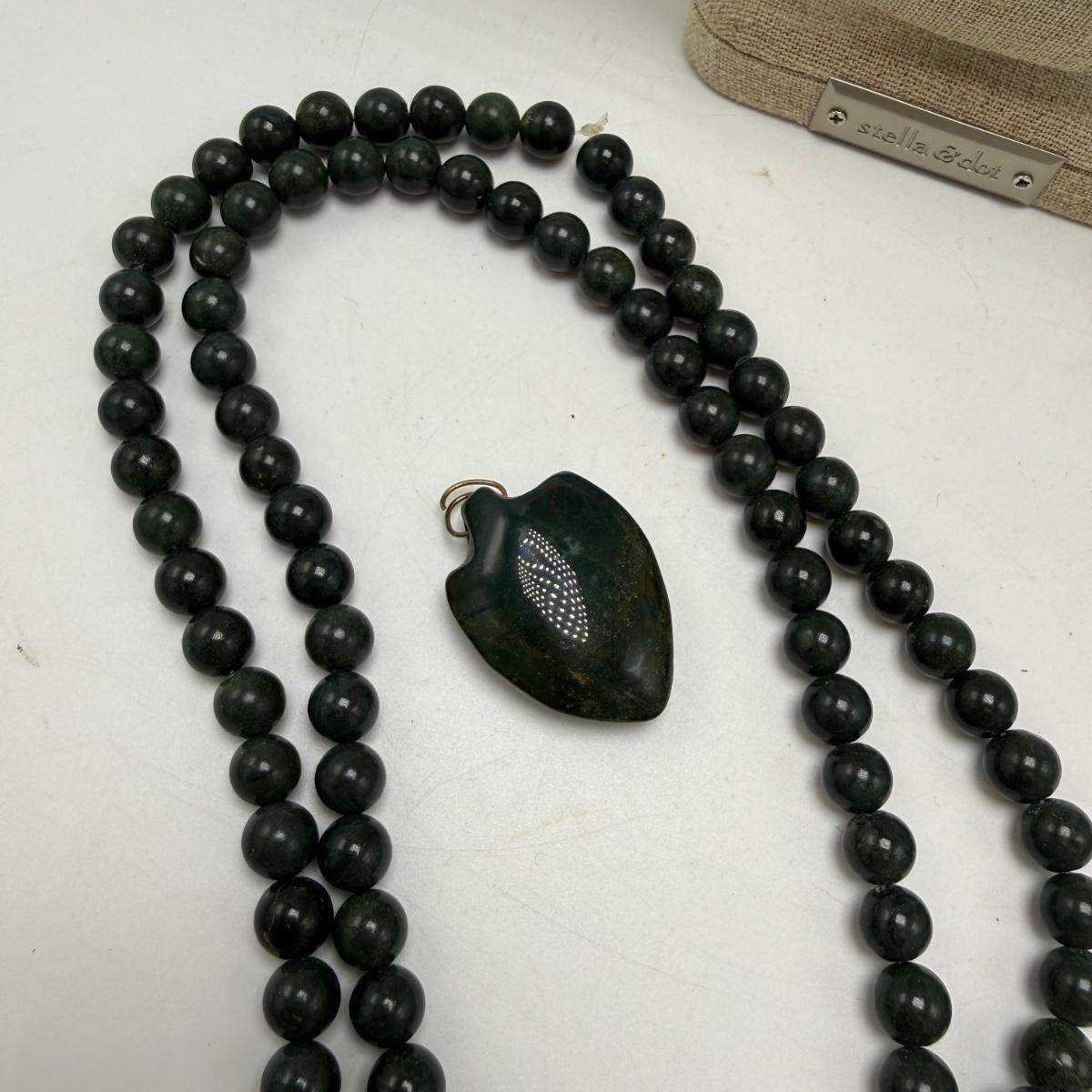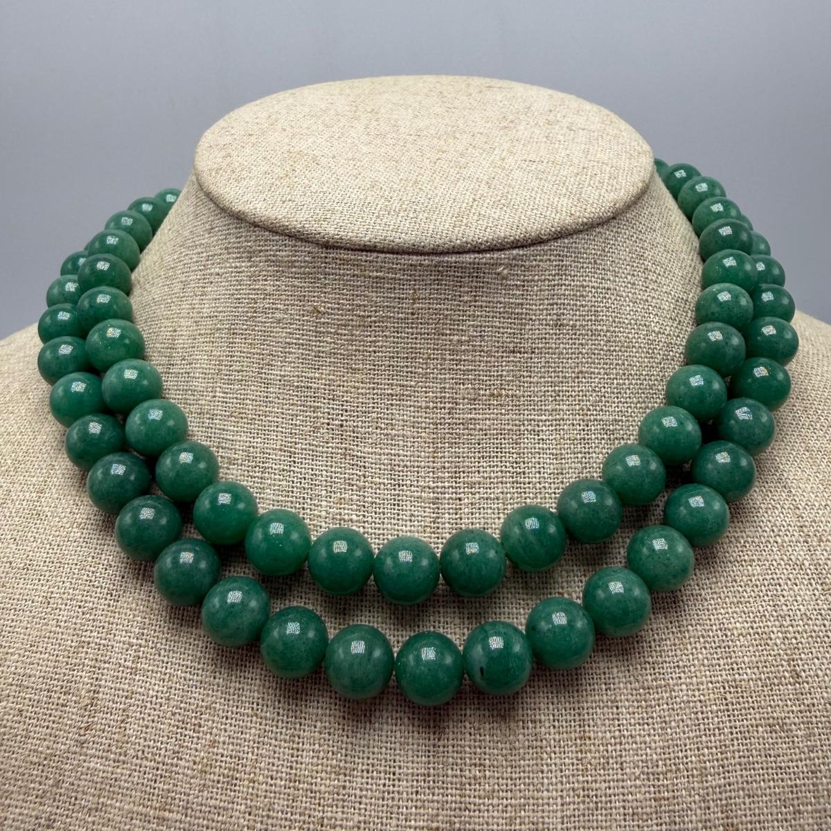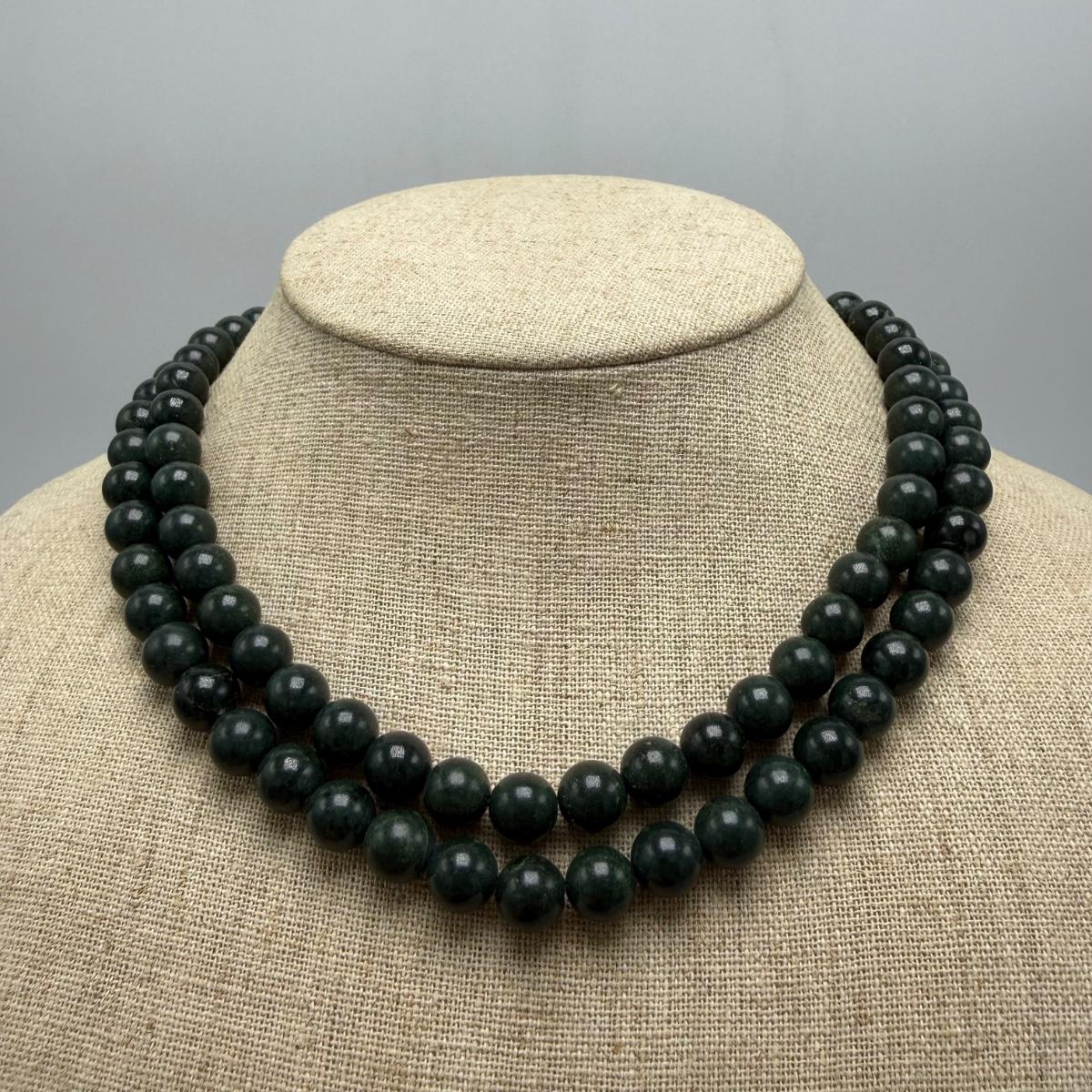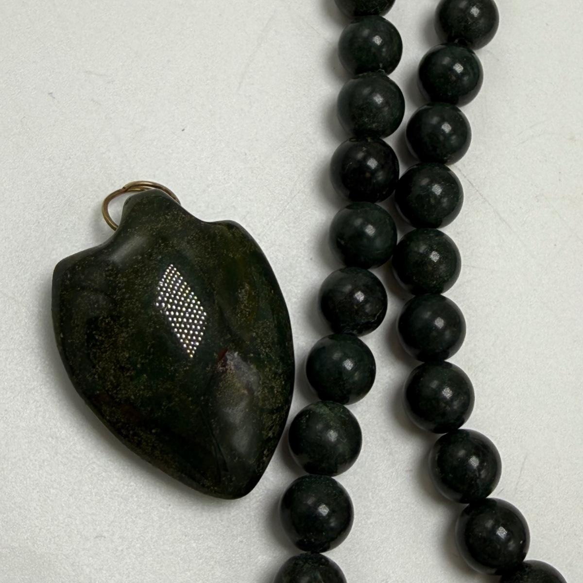 Beautiful lot contains five beaded necklaces. Four necklaces appear to be different shades of Jade, two of which have pendants (one pendant needs to be reattached, which appears to be an easy fix). The lightest green necklace with the carved pendant has a different sound than the other three jade-like necklaces. It has a more high pitch tink-sound. The fifth necklace appears to have black cloisonné beads. See images. All sales are final. No returns or refunds. Please bid accordingly. Shipping available.