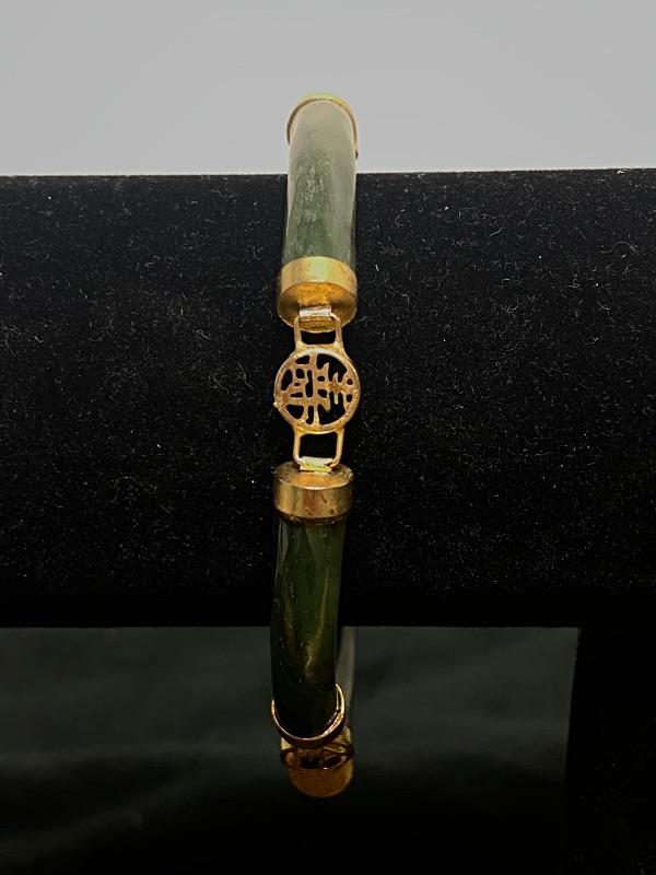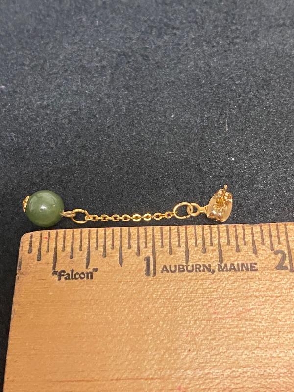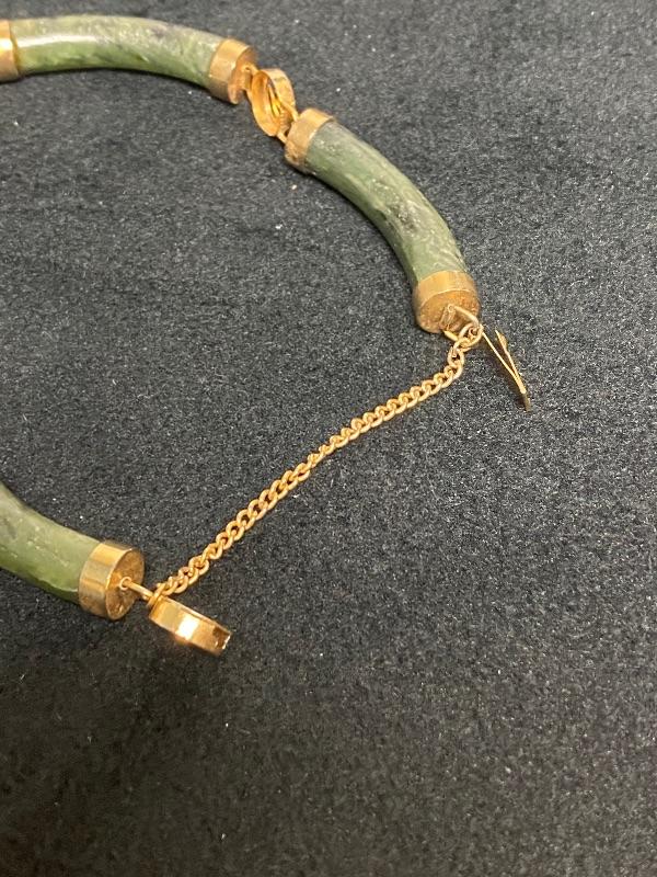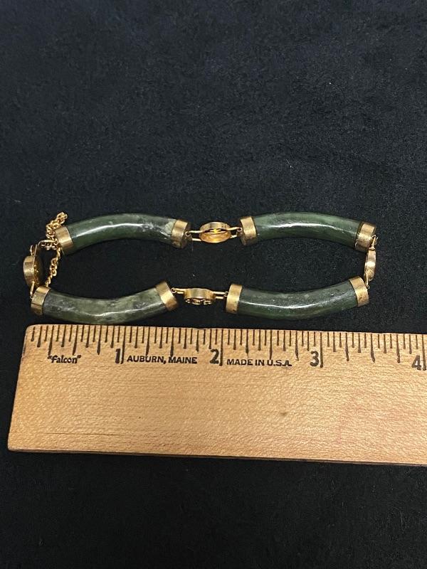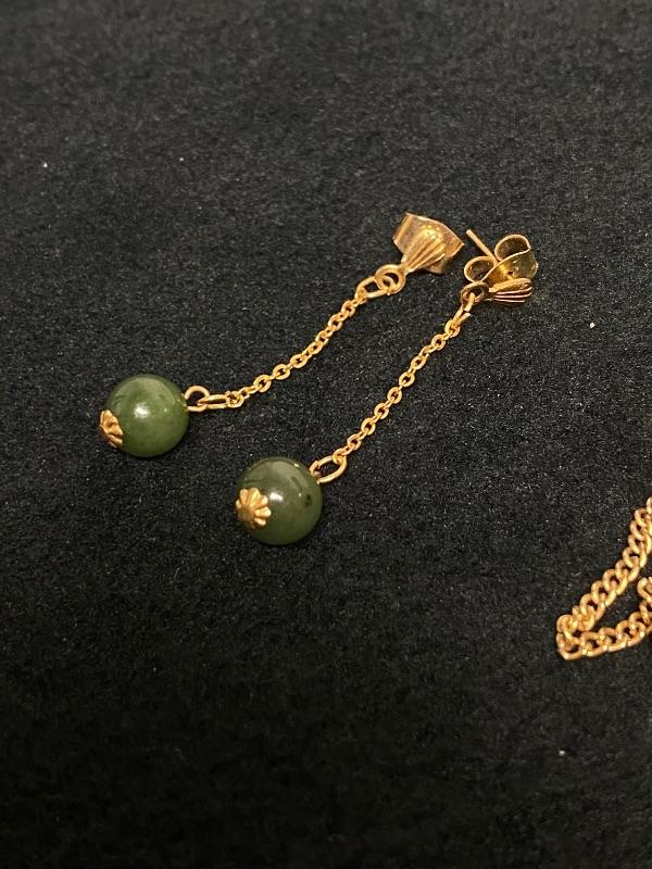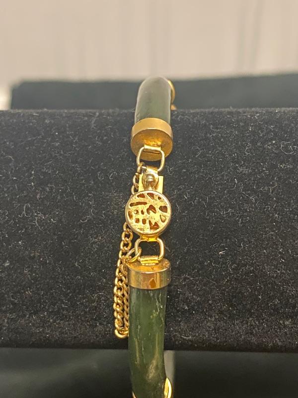 Jade bracelet & earrings. Bracelet is 4 segments held together with goldtone setting. Little medallions inbetween have different Asian symbols. Earrings are small beads dangling on goldtone chain about 1.5".