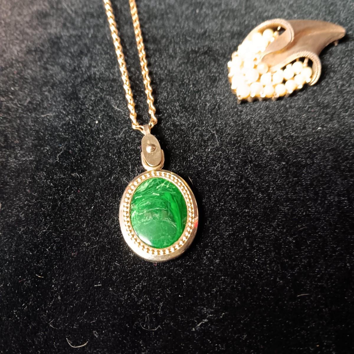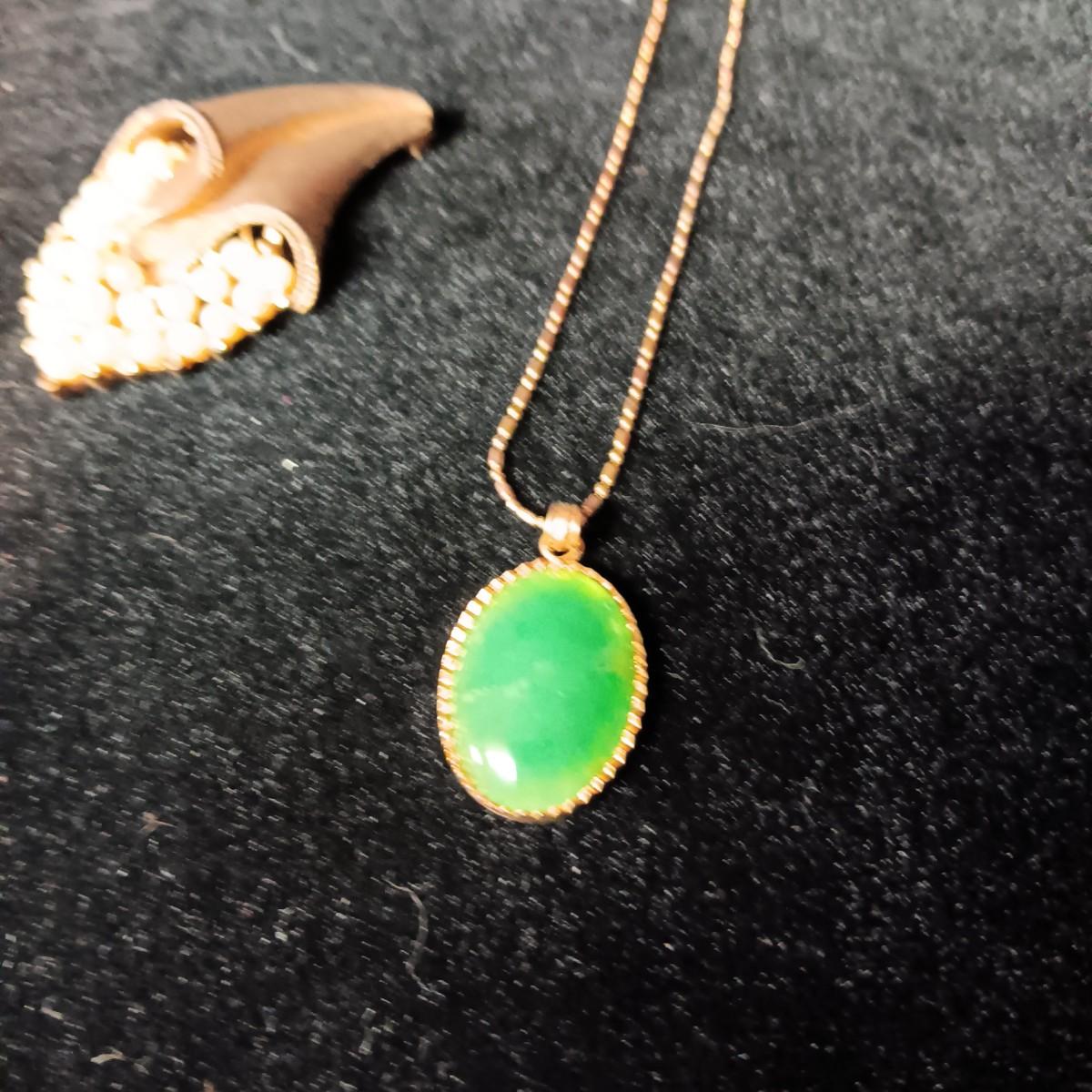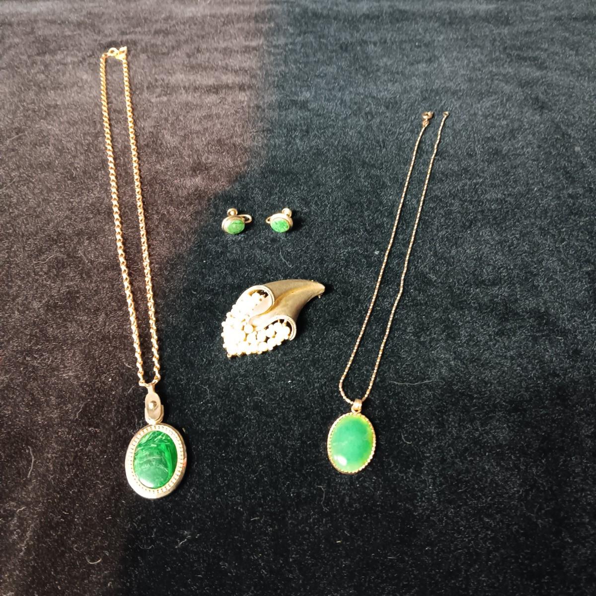 JADE COLORED PENDANTS AND EARRINGS PLUS FAUX PEARL BROOCH