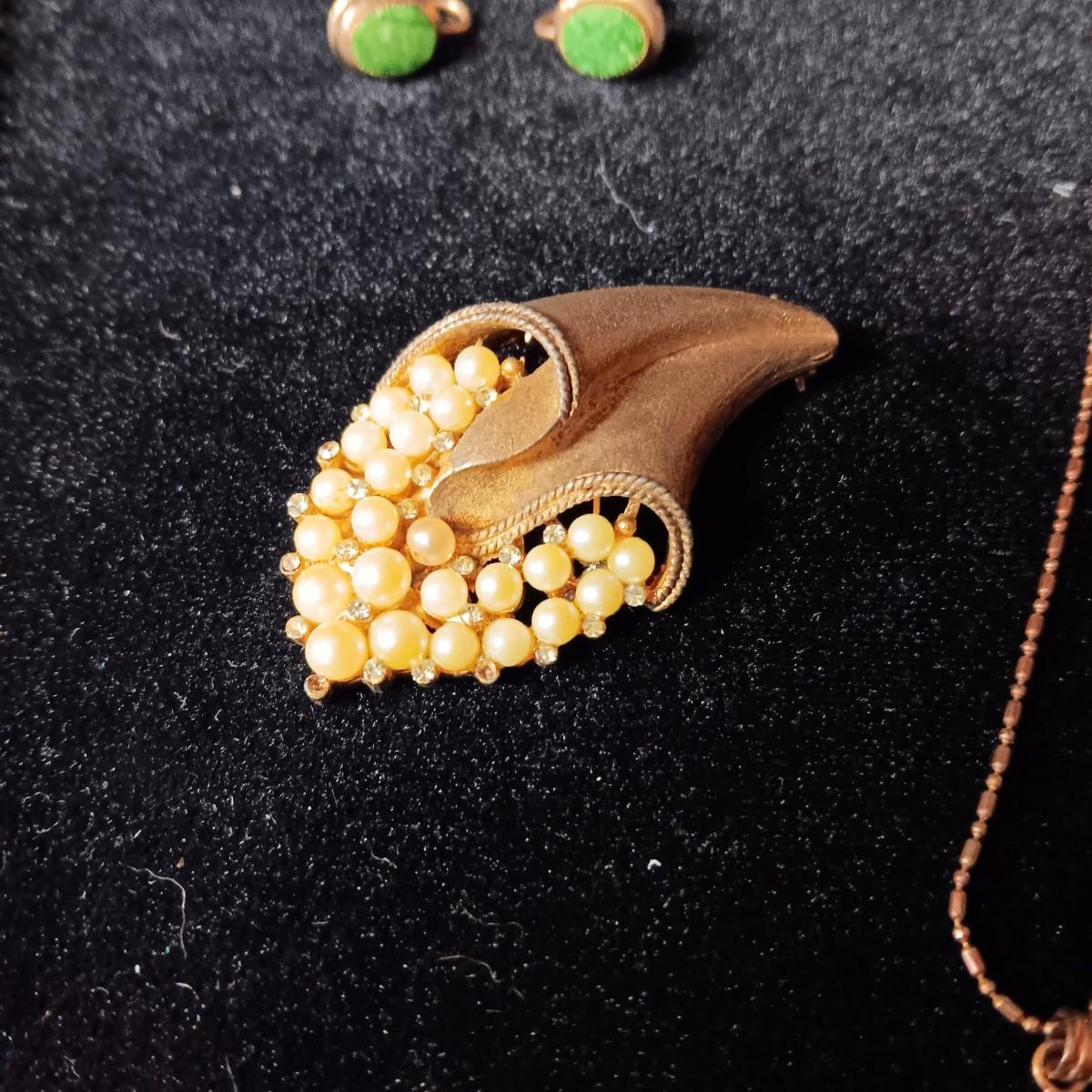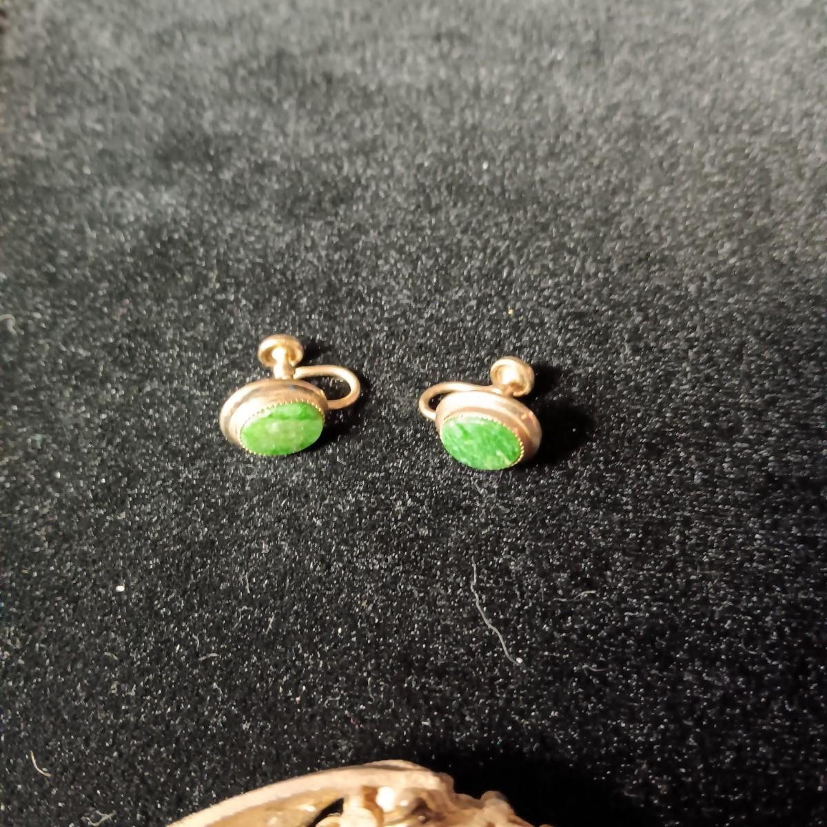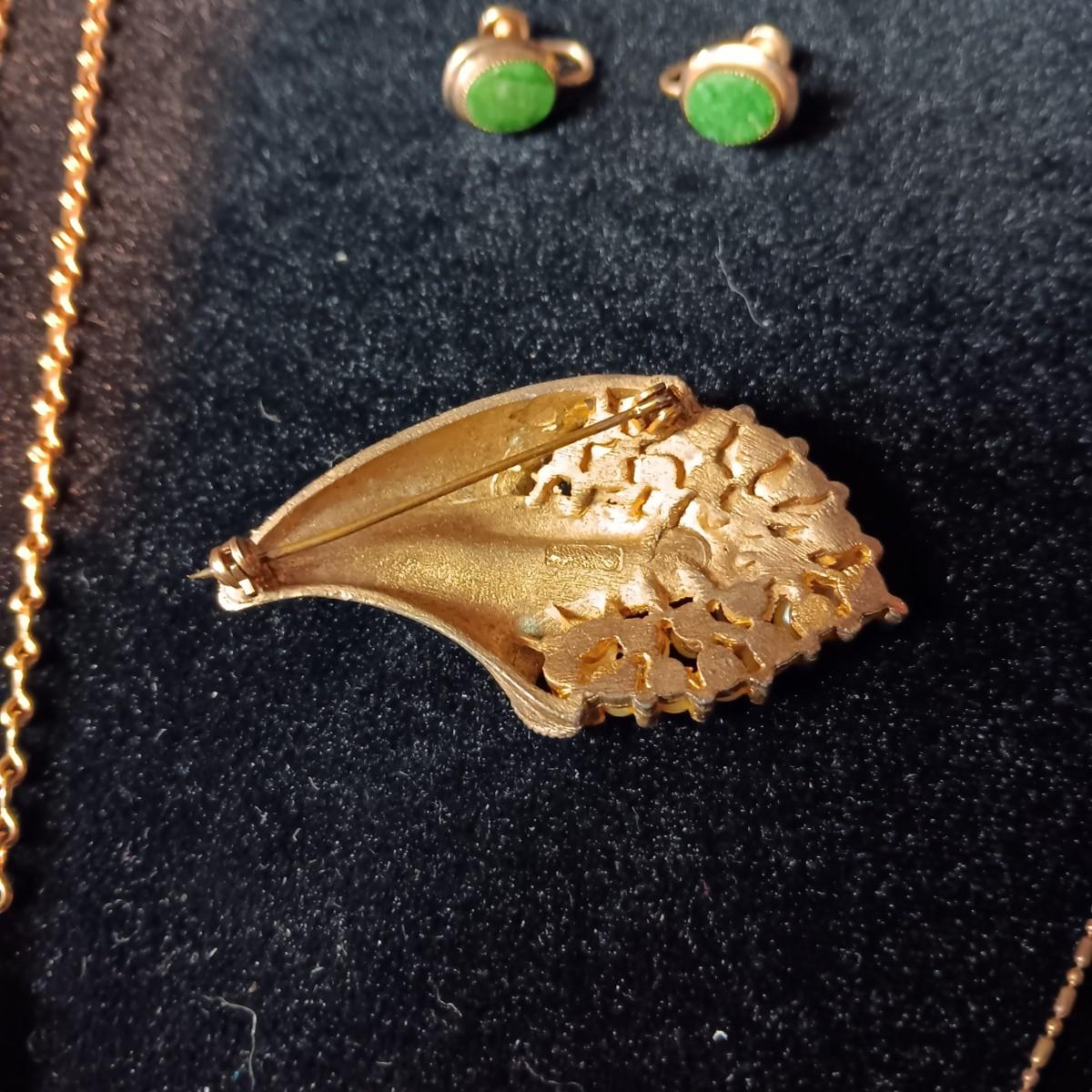 JADE COLORED PENDANTS AND EARRINGS PLUS FAUX PEARL BROOCH