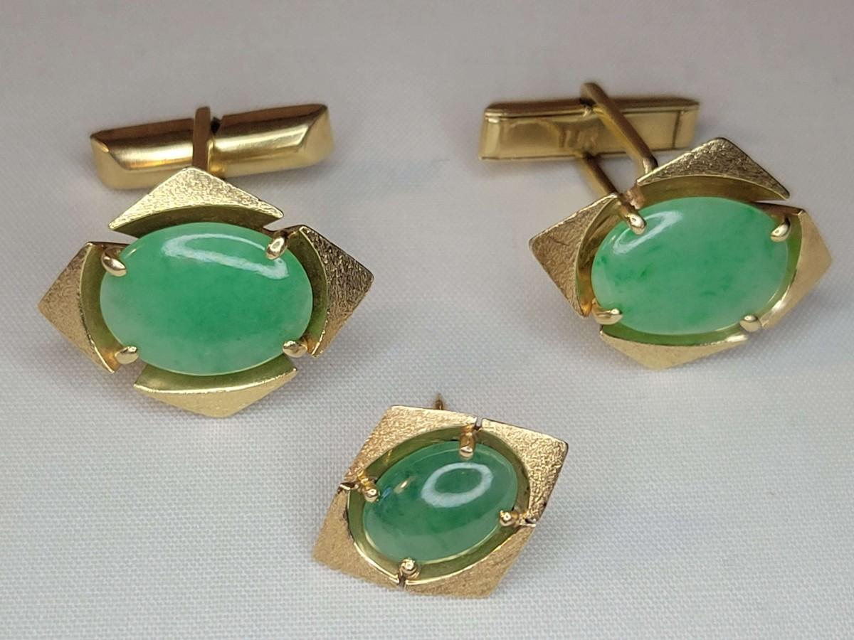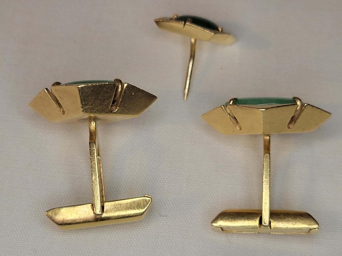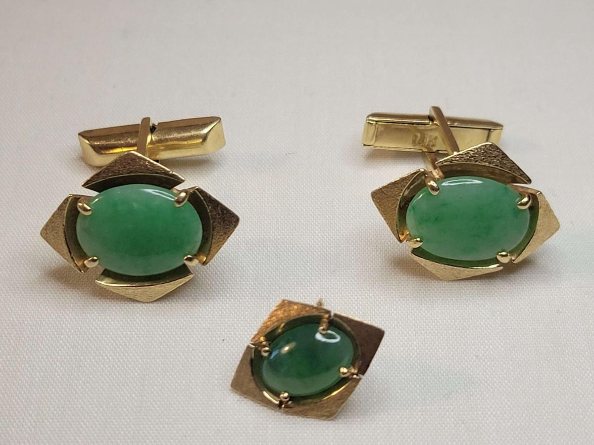 3 pc set: 14k jade cufflinks with 1 pin. The pin does not have a back and the post is bent.