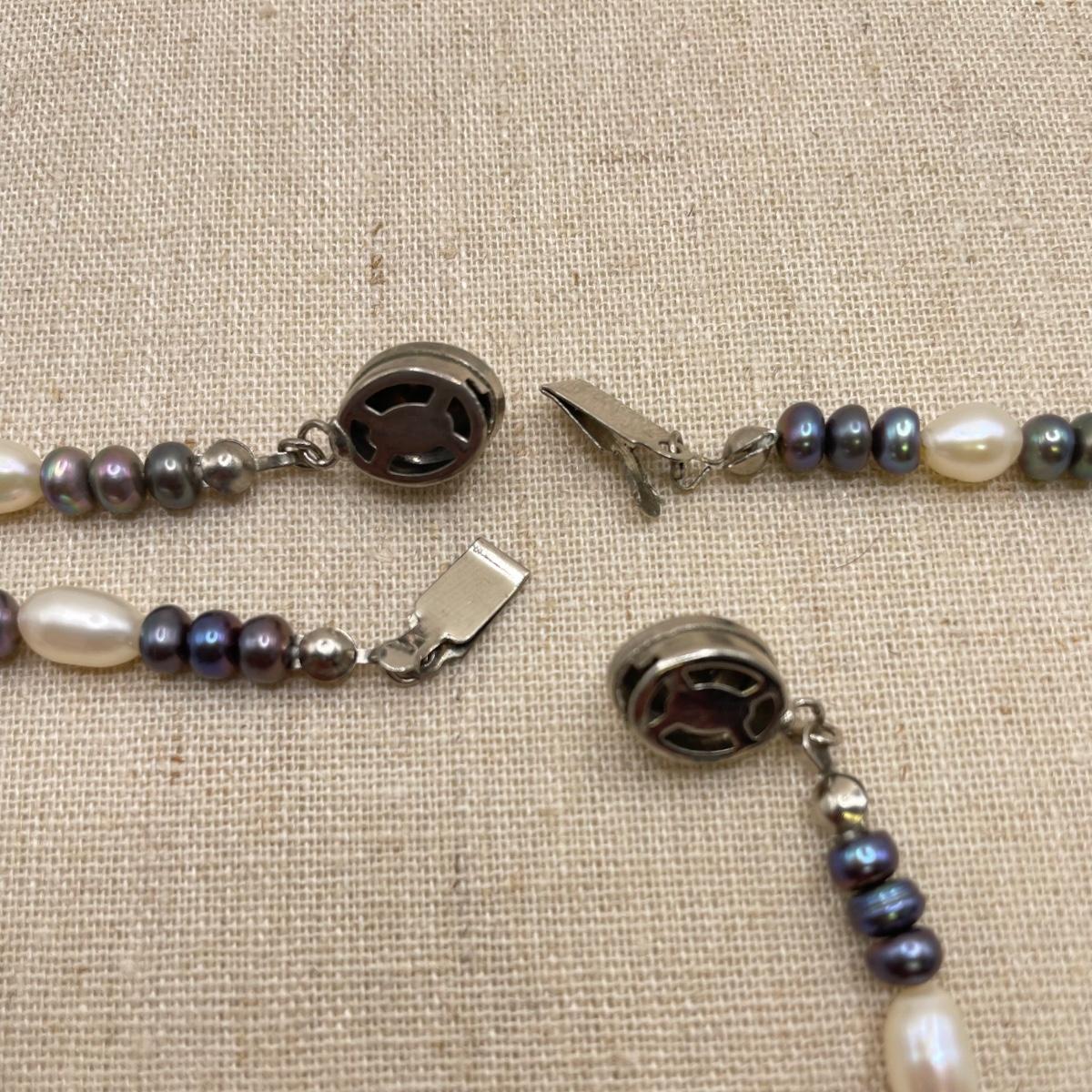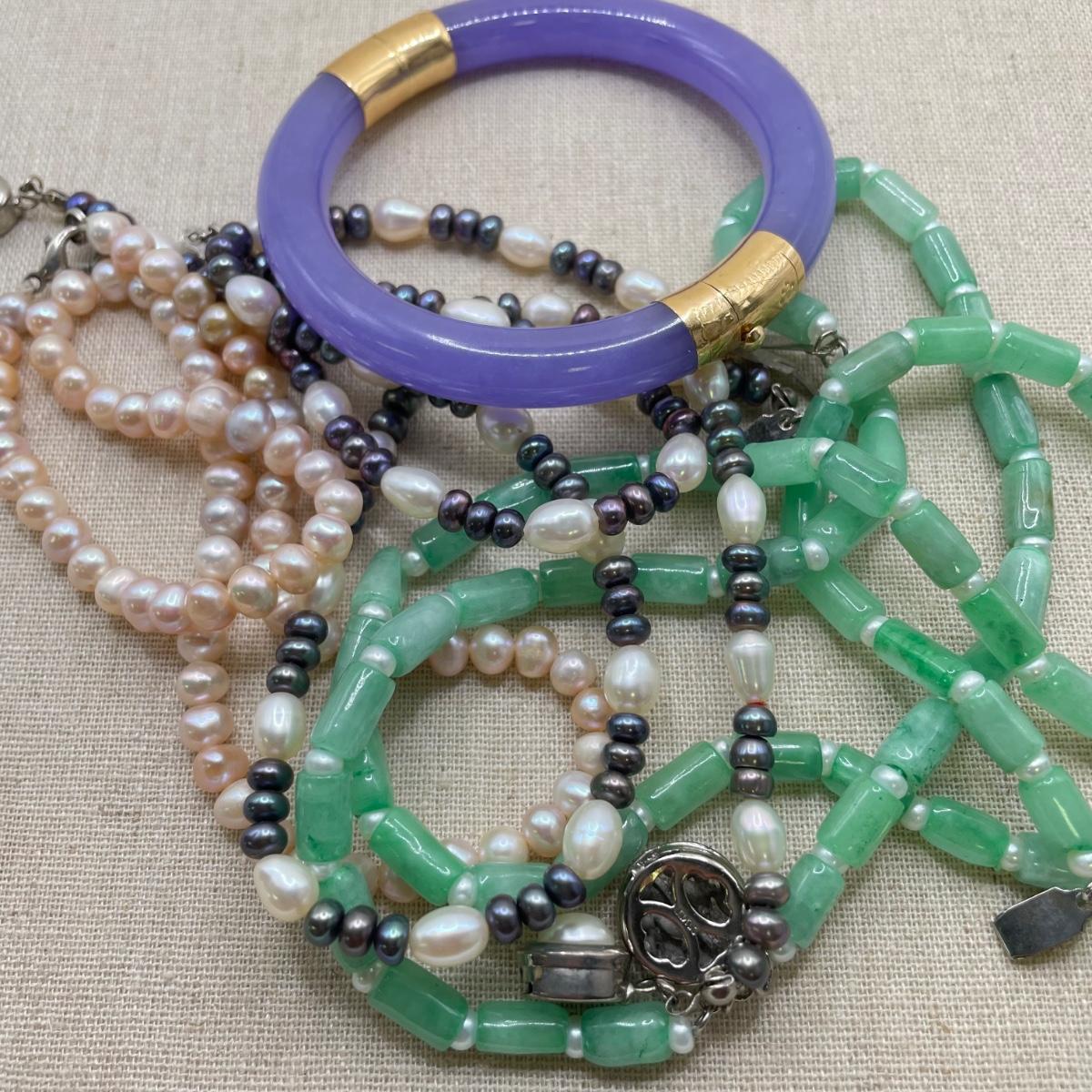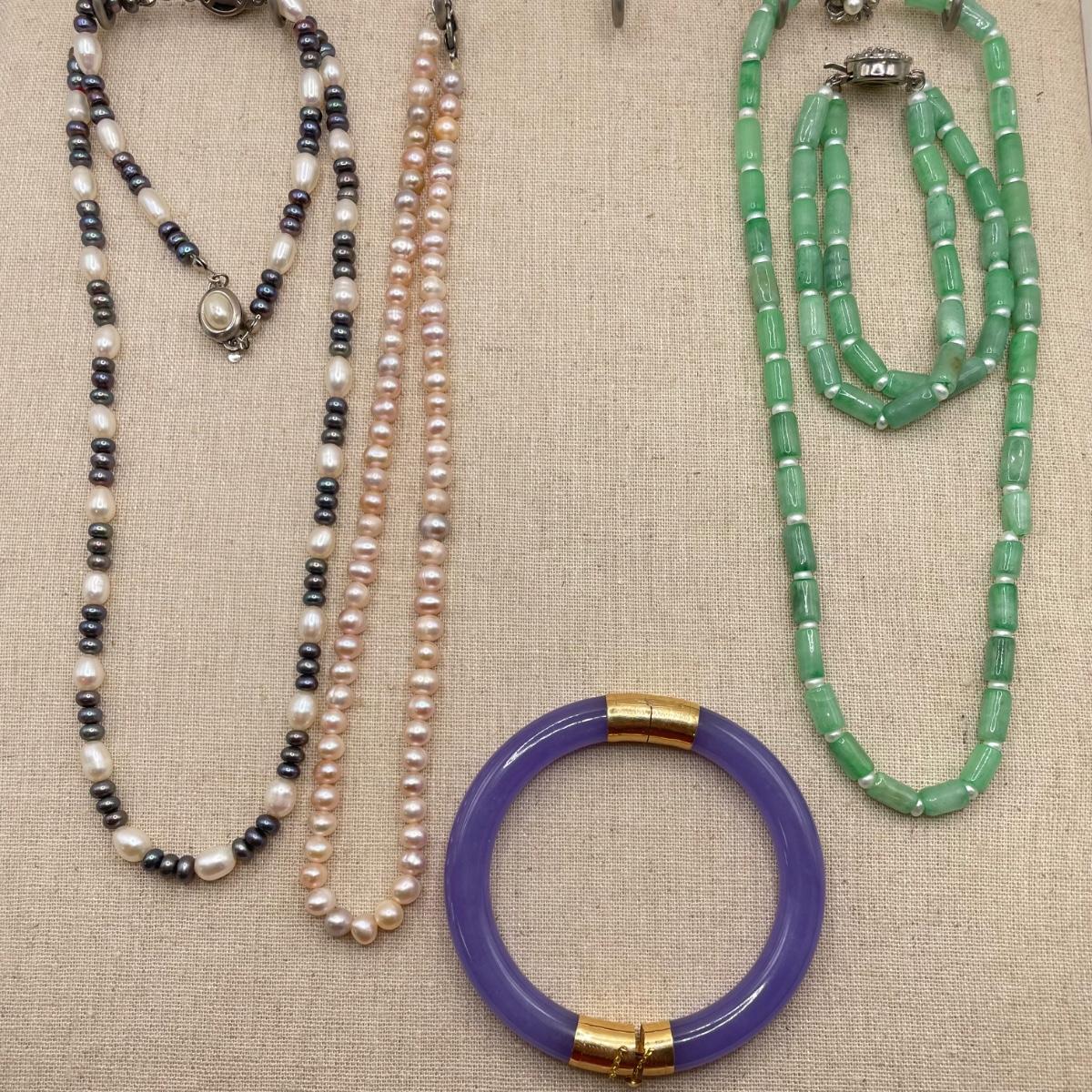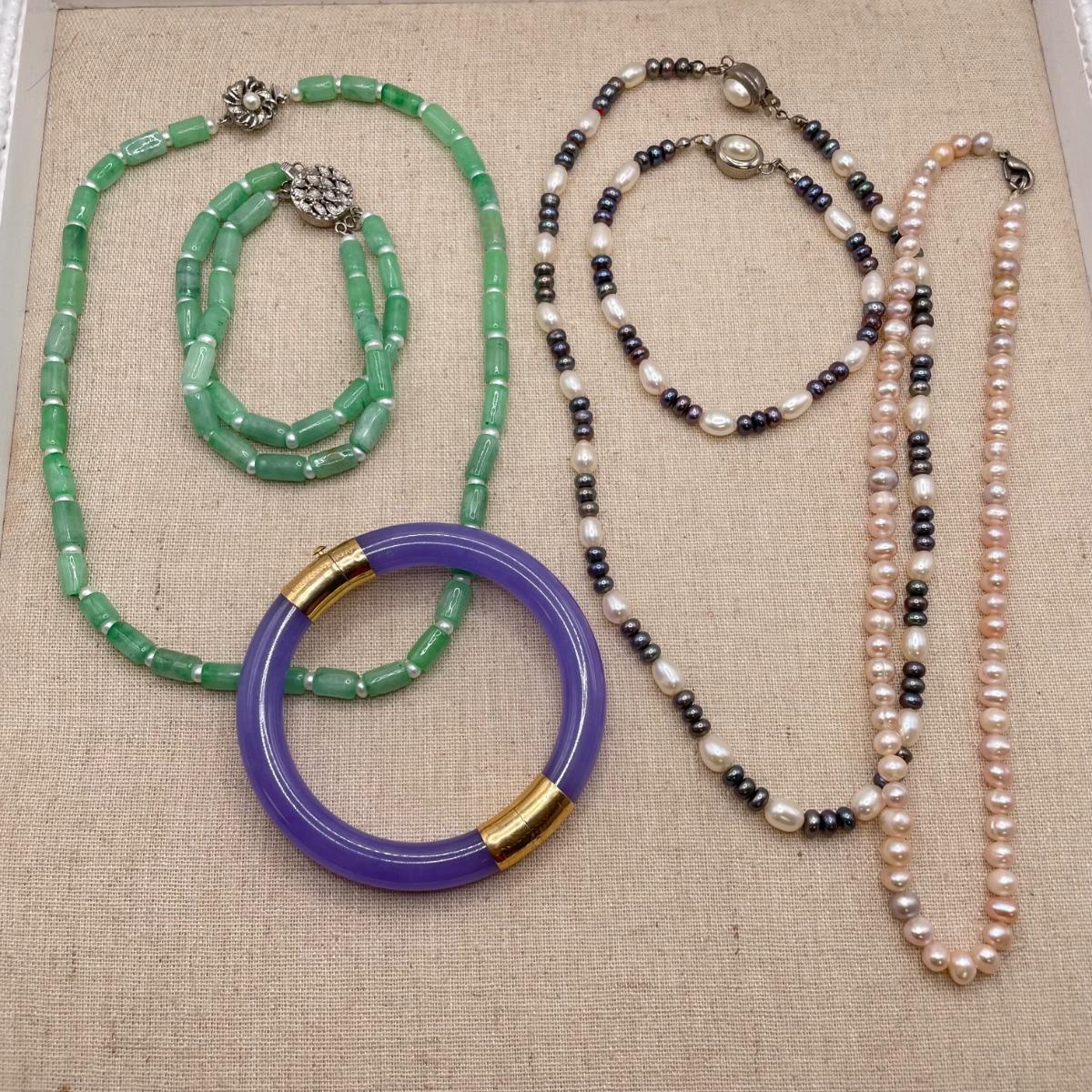 Two necklace and bracelet sets plus a pale pink pearl necklace and a purple jade-like bracelet with gold accents marked 14K 585. The longest necklace is the light and dark pearl necklace at 16”. The purple bracelet is 3”D. See images. All sales are final. No returns or refunds. Please bid accordingly.