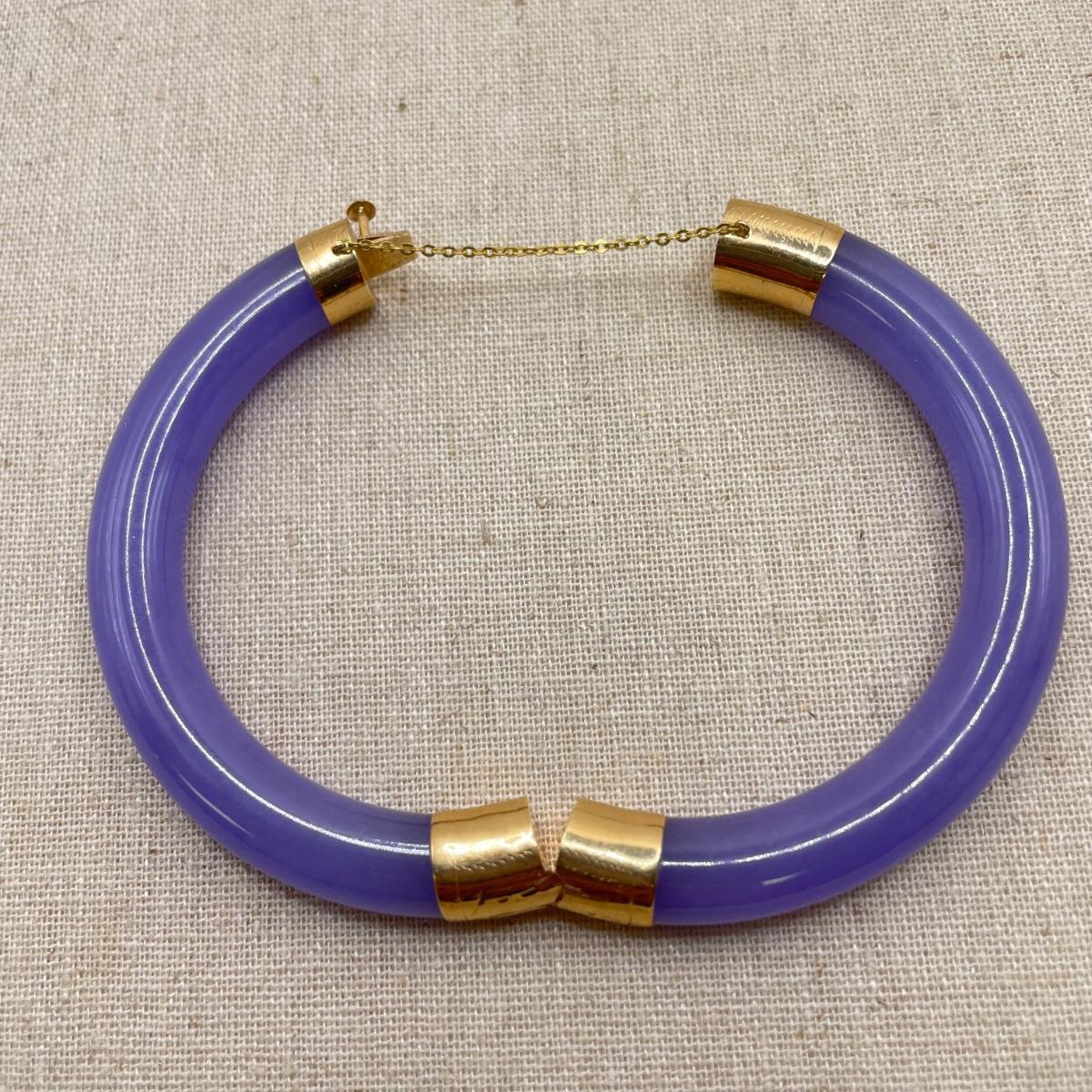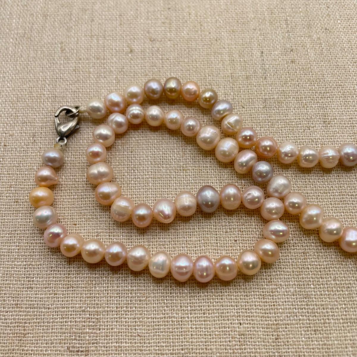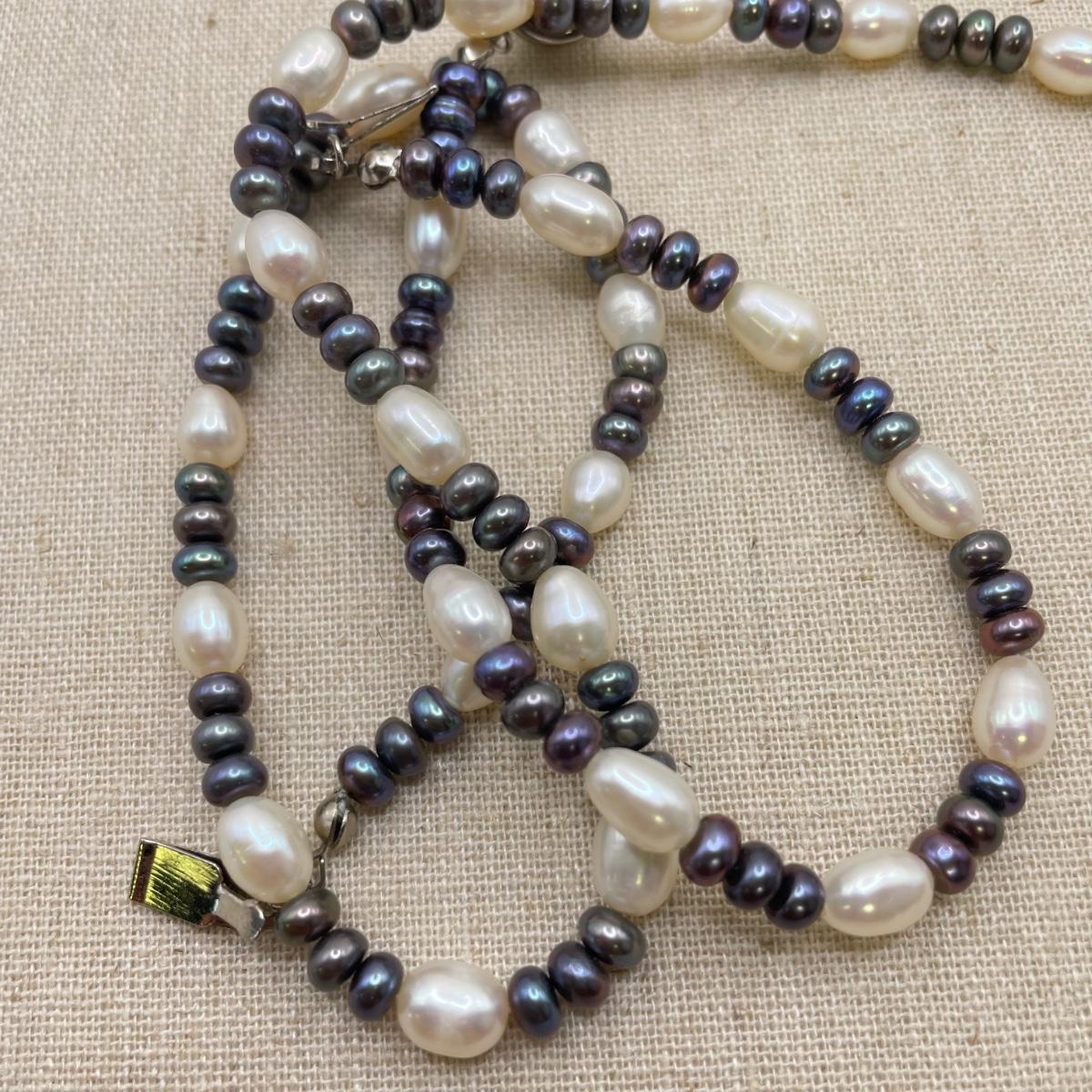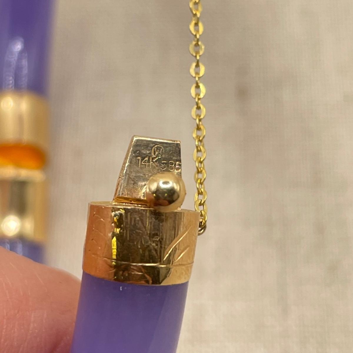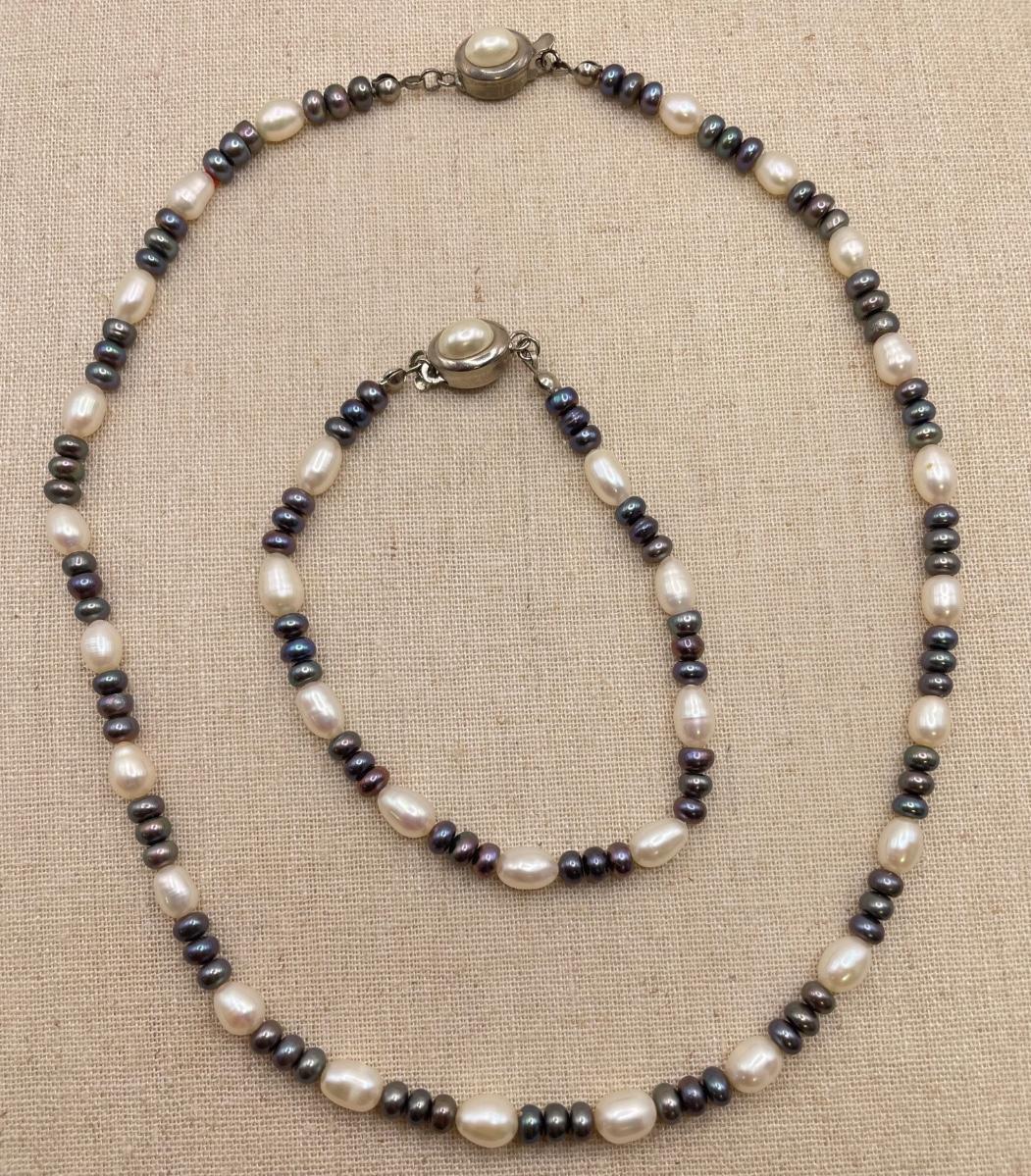 Two necklace and bracelet sets plus a pale pink pearl necklace and a purple jade-like bracelet with gold accents marked 14K 585. The longest necklace is the light and dark pearl necklace at 16”. The purple bracelet is 3”D. See images. All sales are final. No returns or refunds. Please bid accordingly.