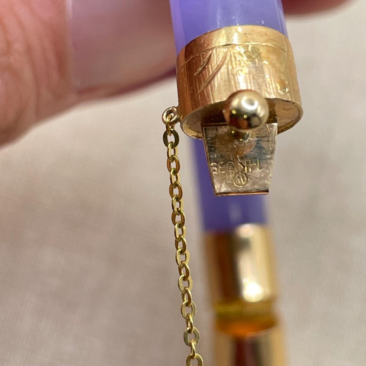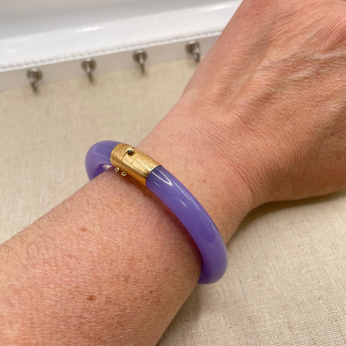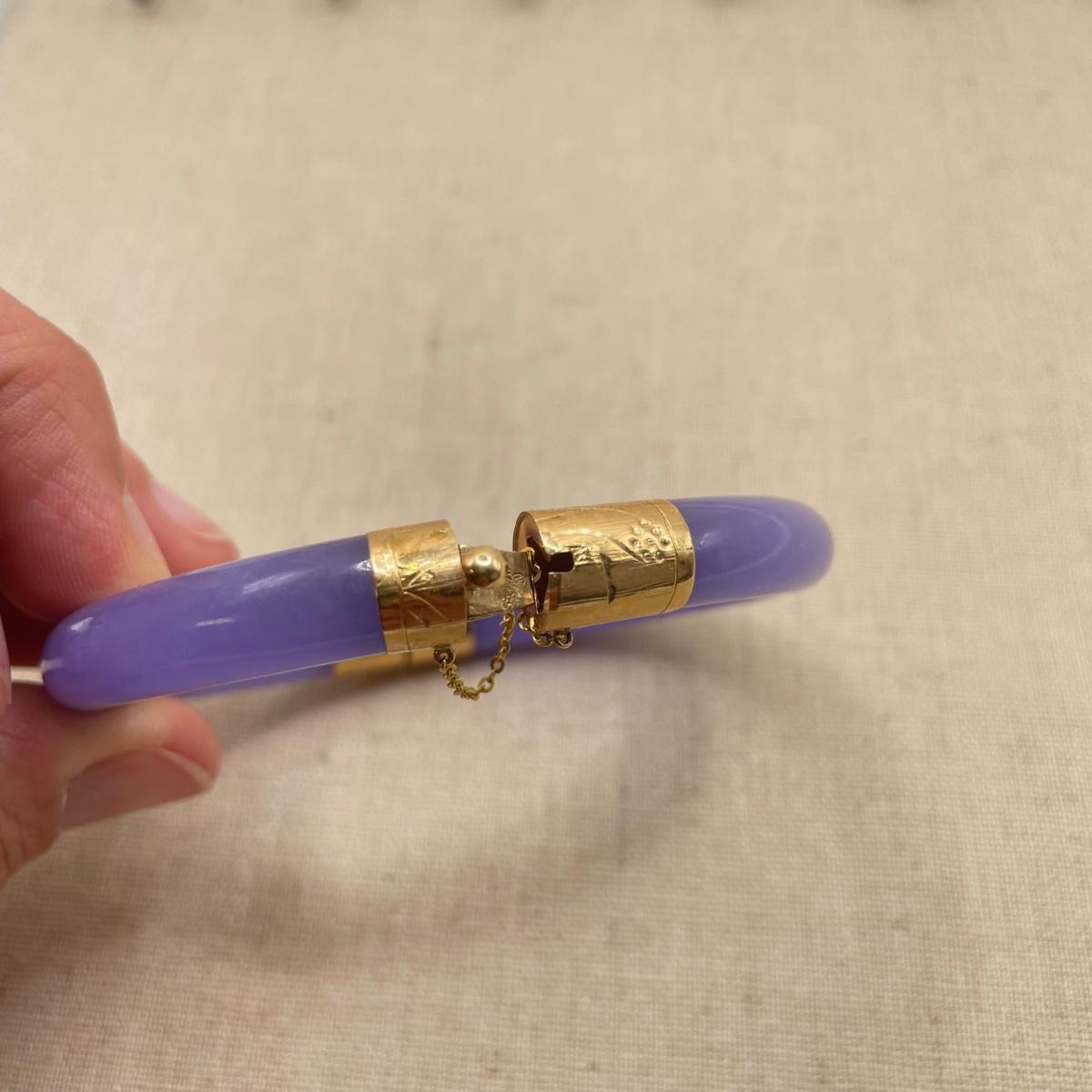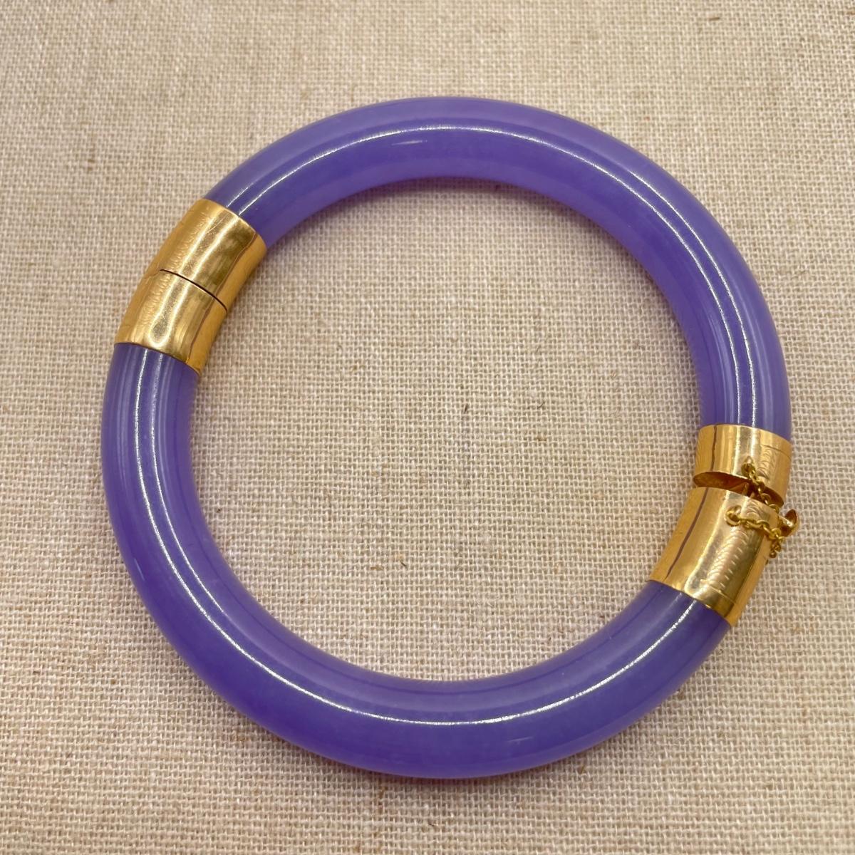Two necklace and bracelet sets plus a pale pink pearl necklace and a purple jade-like bracelet with gold accents marked 14K 585. The longest necklace is the light and dark pearl necklace at 16”. The purple bracelet is 3”D. See images. All sales are final. No returns or refunds. Please bid accordingly.