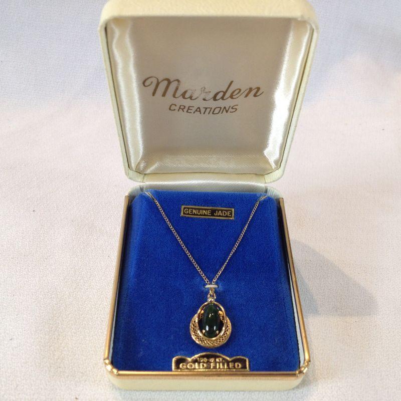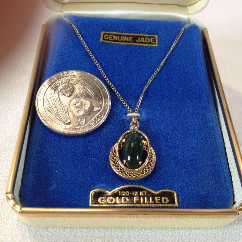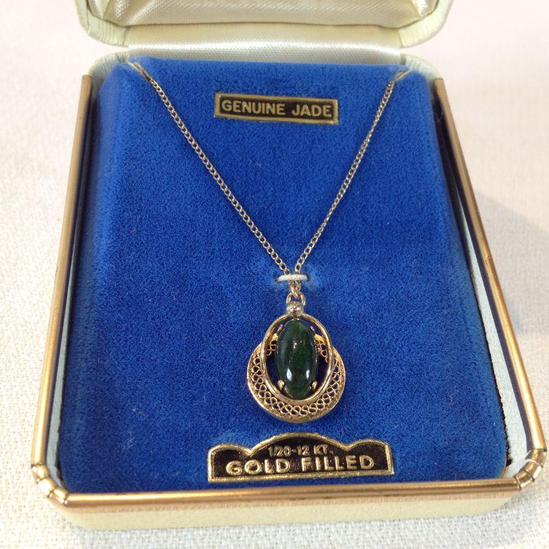 This lot is for a vintage Dark Jade Necklace. It is marked 120-12K gold filled and the stone appears quite beautiful. New and in original box.