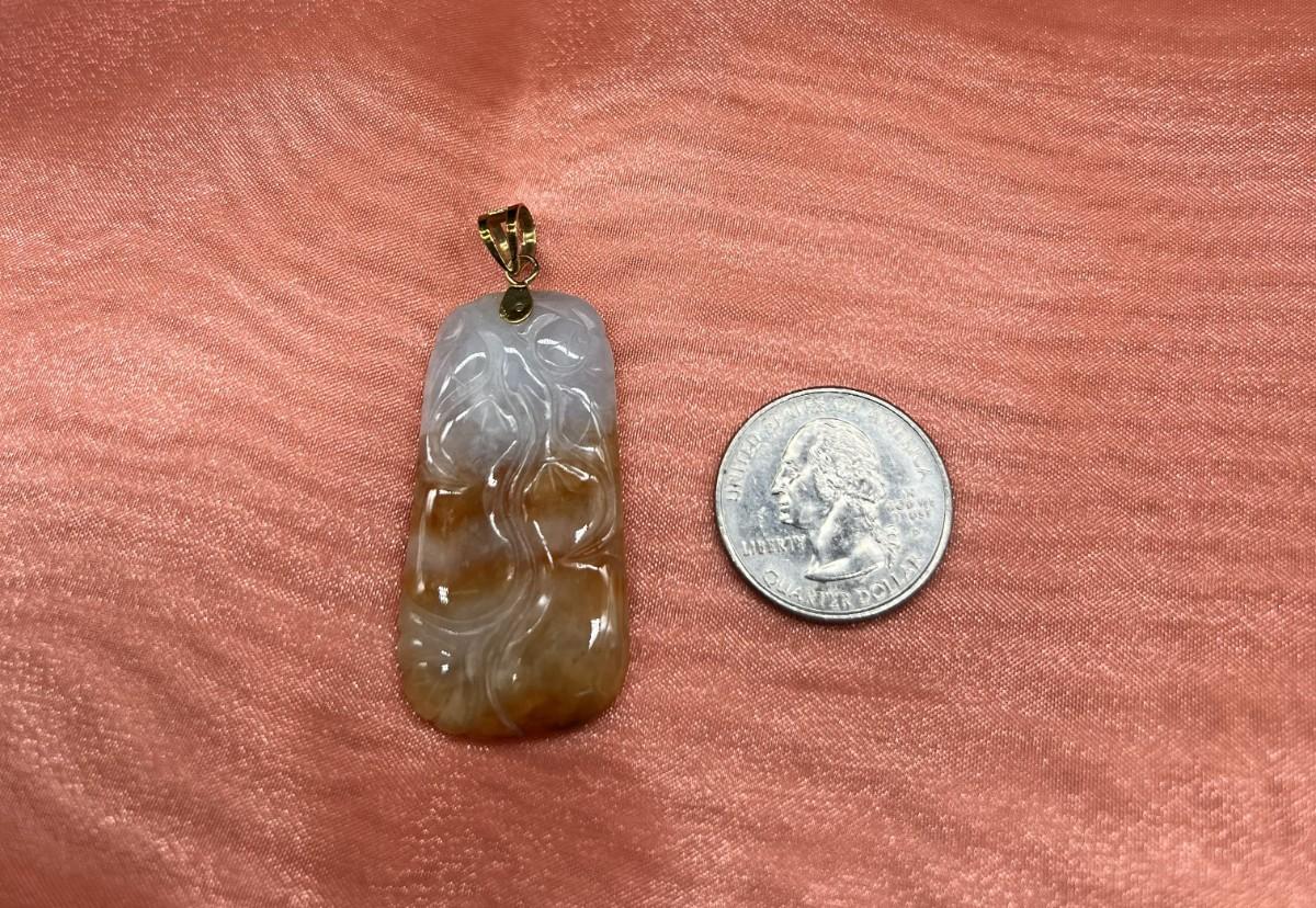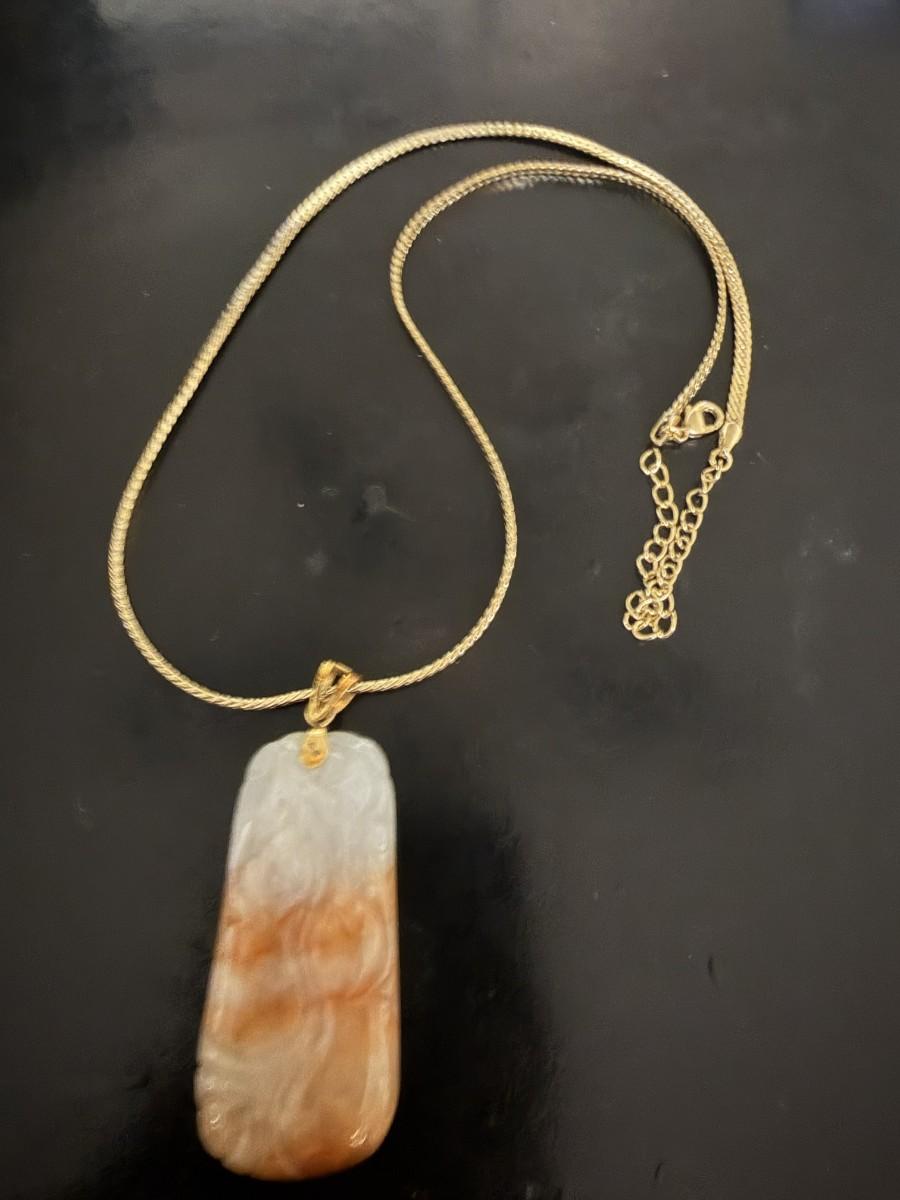 The chain is 18 inches, the pendant is bi-color red/orange and white jadeite.