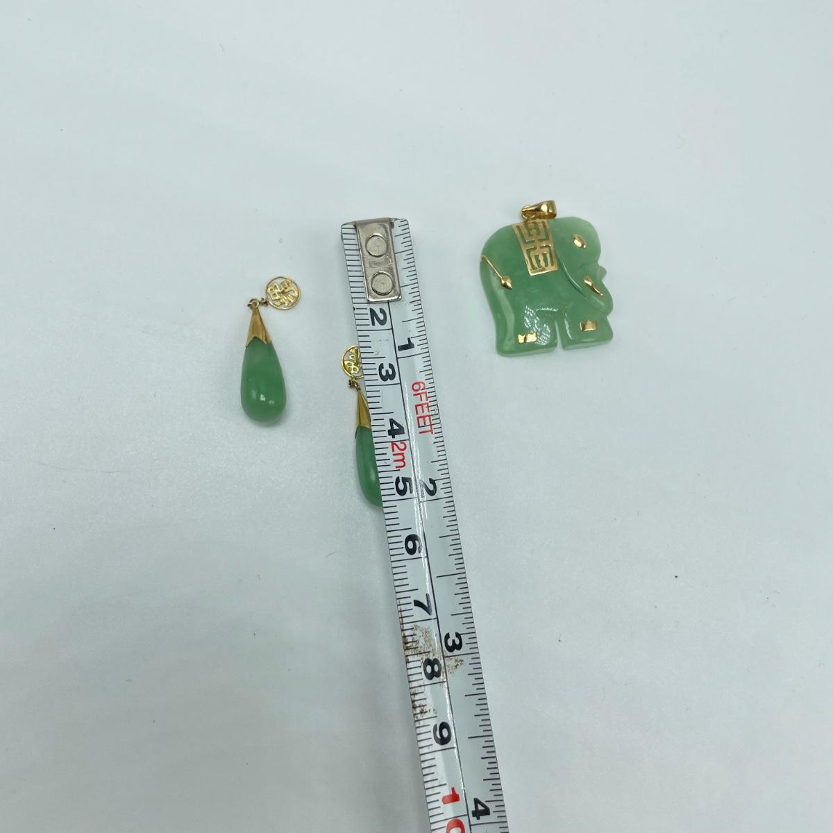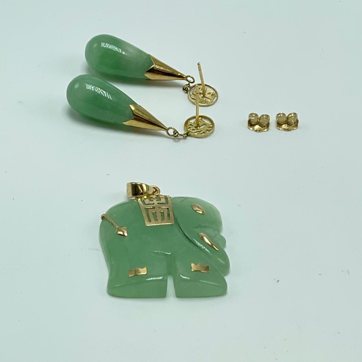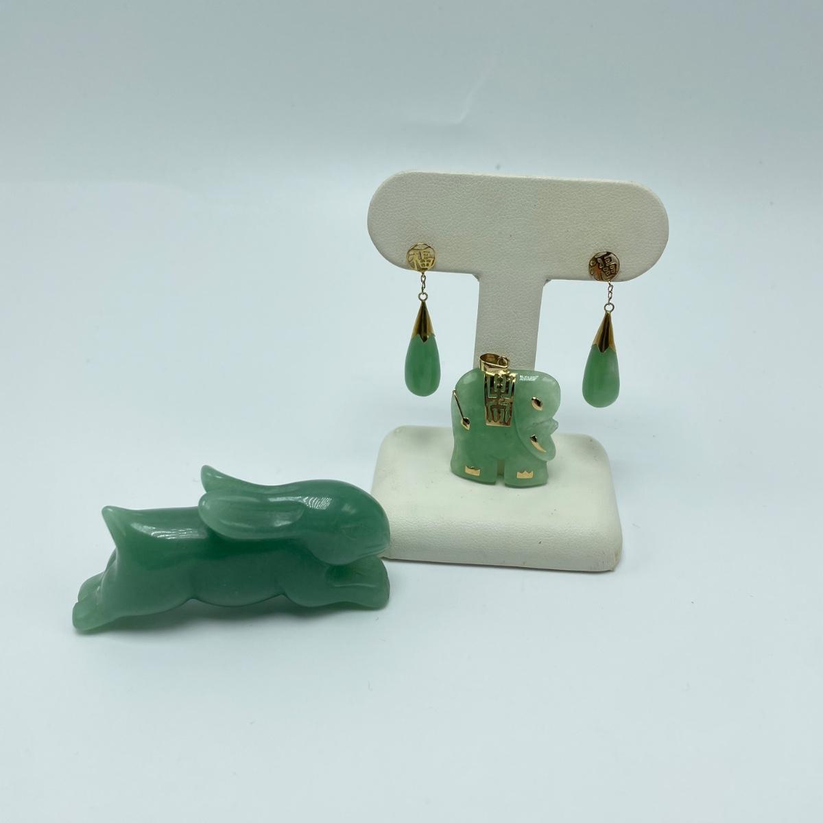 Lot features what appears to be carved a jade elephant pendant and teardrop earrings for pierced ears. The pendant has 14K and other markings, the earrings do not appear to be marked. Lastly, a slightly darker carved rabbit with intricate face details. Rabbit has what appears to be a once broken, yet repaired hind leg. See images. Shipping available. All sales are final. No returns or refunds. Please bid accordingly.