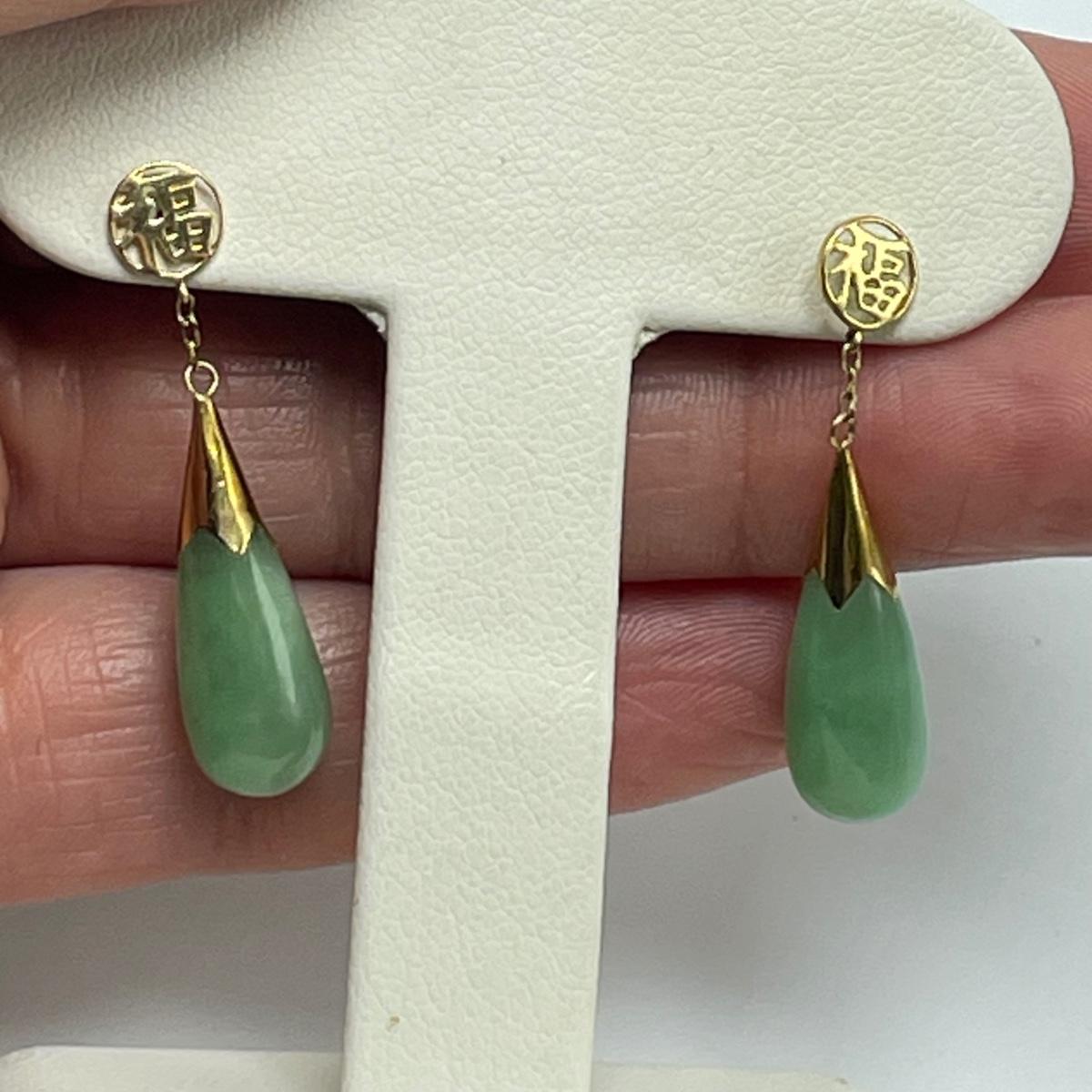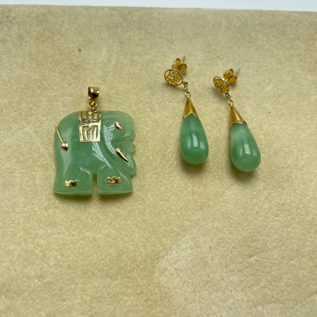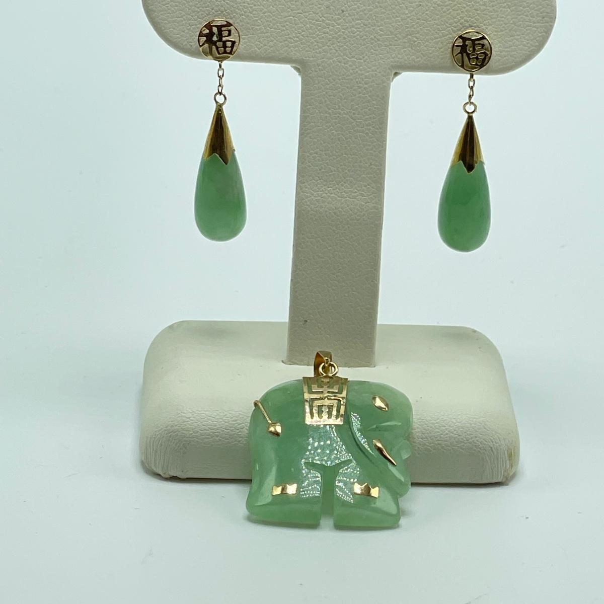 Lot features what appears to be carved a jade elephant pendant and teardrop earrings for pierced ears. The pendant has 14K and other markings, the earrings do not appear to be marked. Lastly, a slightly darker carved rabbit with intricate face details. Rabbit has what appears to be a once broken, yet repaired hind leg. See images. Shipping available. All sales are final. No returns or refunds. Please bid accordingly.