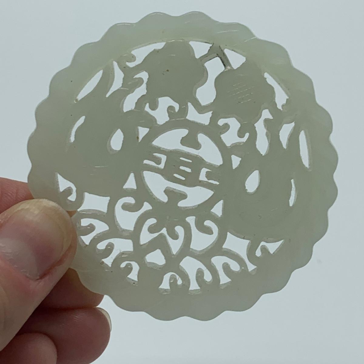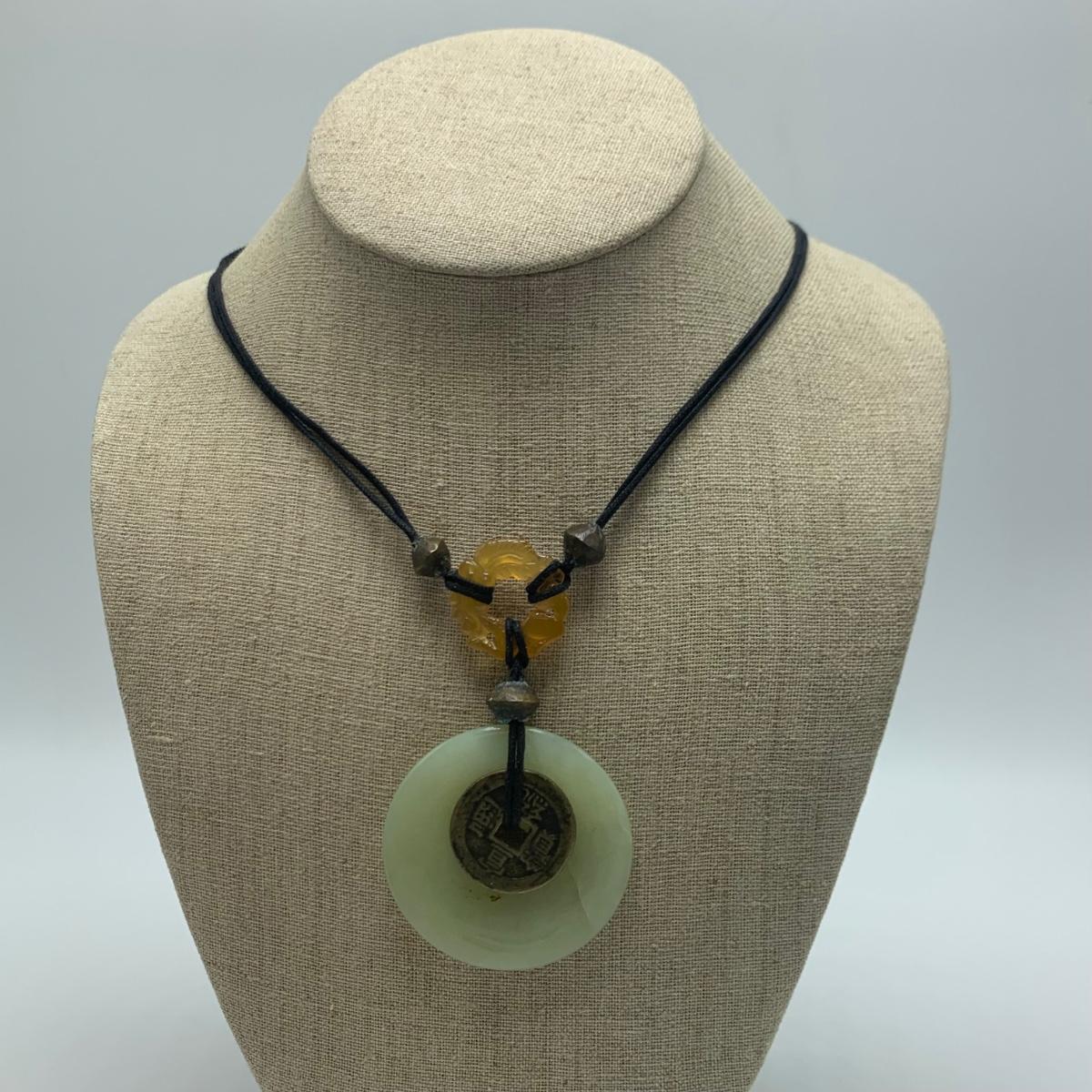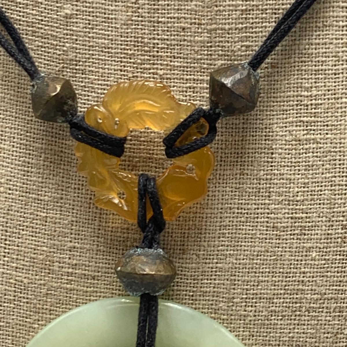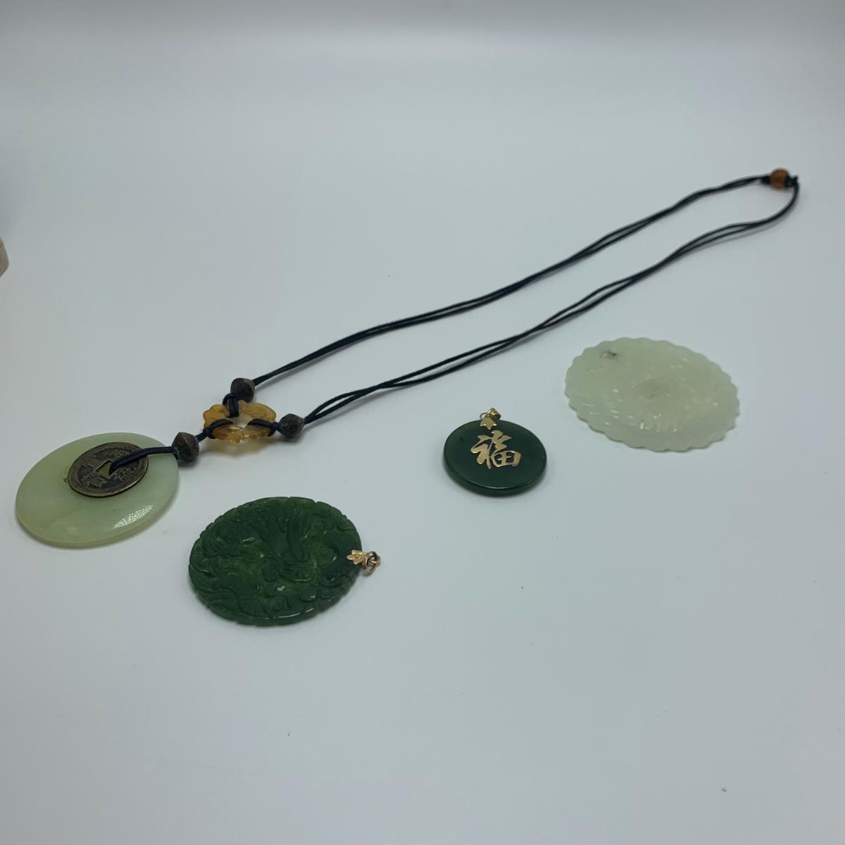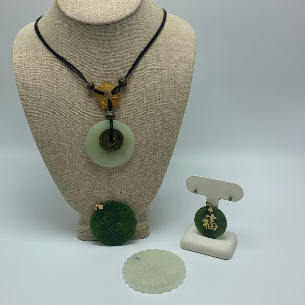 Four beautiful jade-like stone pendants, one of which is on a corded necklace with a carved amber colored bead and metal beads. The largest lightest colored pendant is about 2.5”D. The necklace is about 28”. See photos for the detailed designs. All sales are final. No returns or refunds. Please bid accordingly.