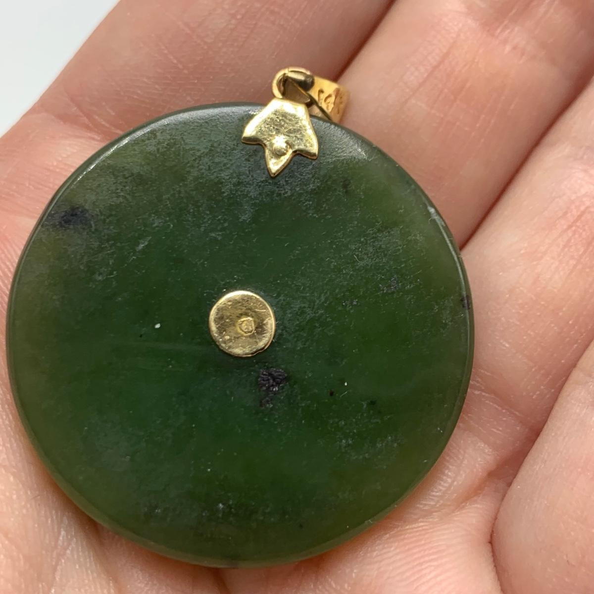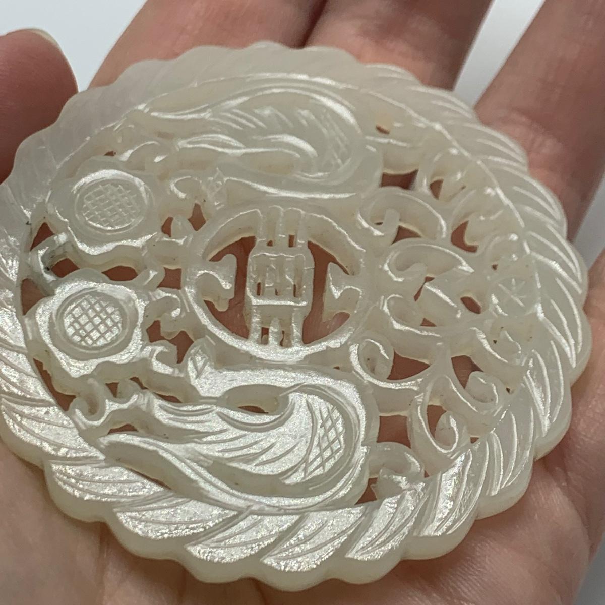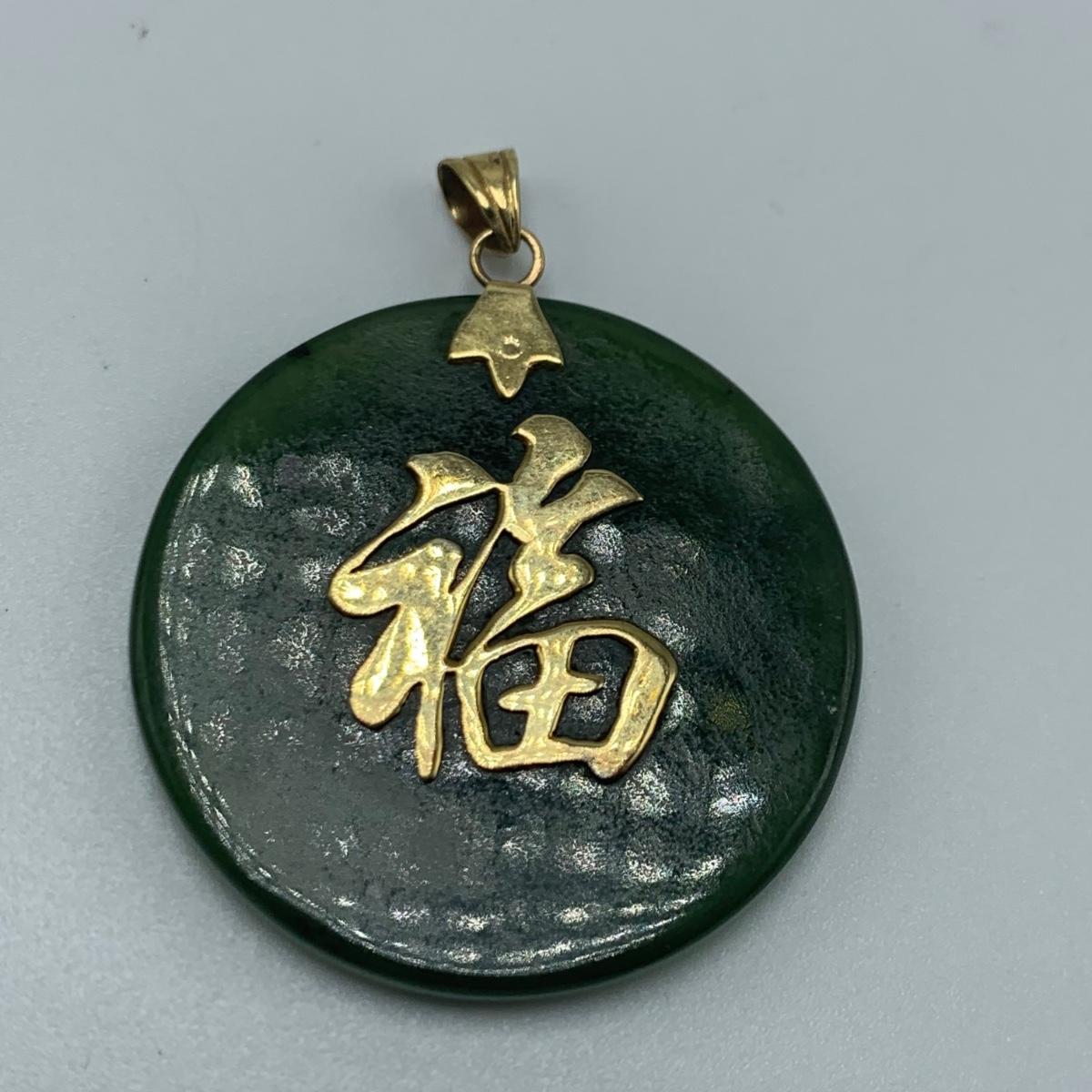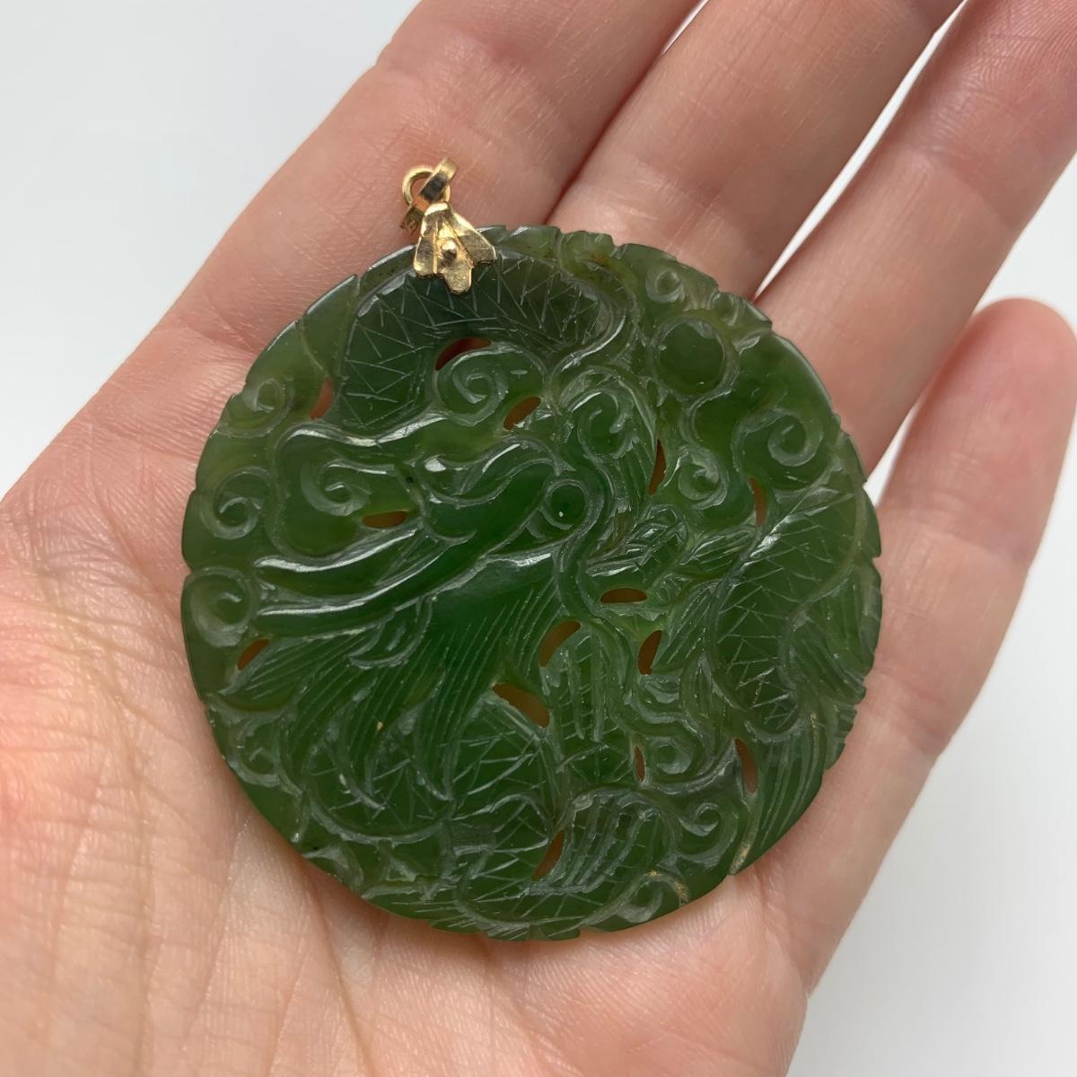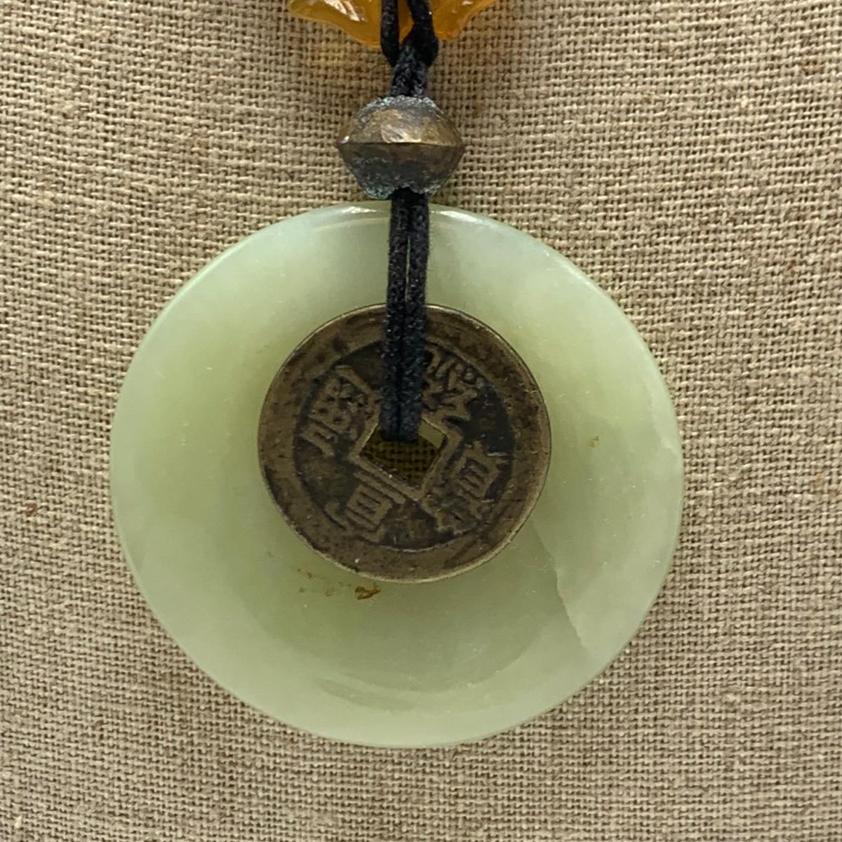 Four beautiful jade-like stone pendants, one of which is on a corded necklace with a carved amber colored bead and metal beads. The largest lightest colored pendant is about 2.5”D. The necklace is about 28”. See photos for the detailed designs. All sales are final. No returns or refunds. Please bid accordingly.
