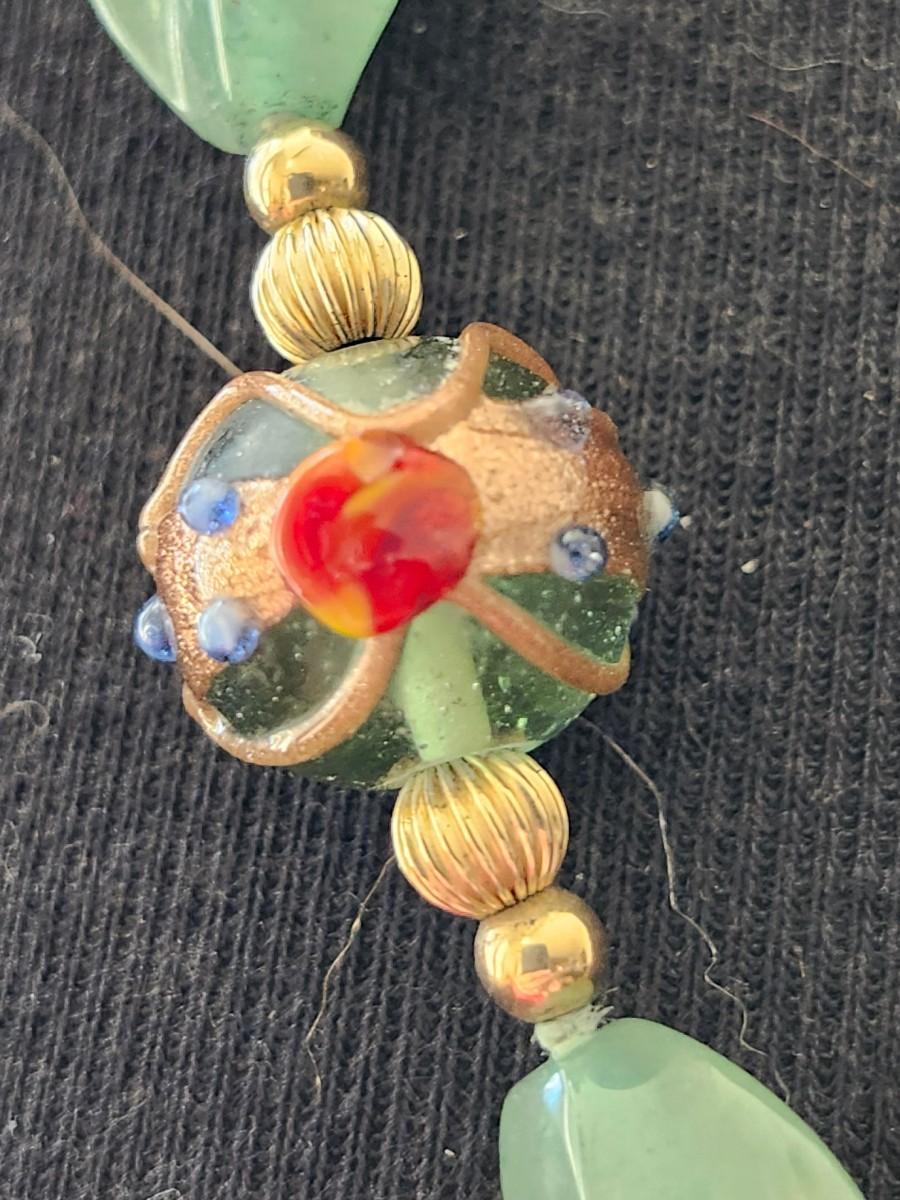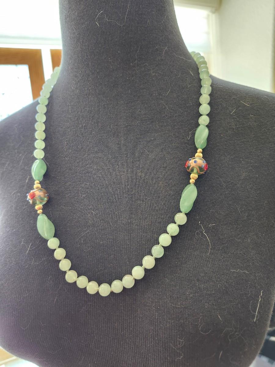 Very lovely 26 inch necklace made of jadeite and hand painted glass beads.
