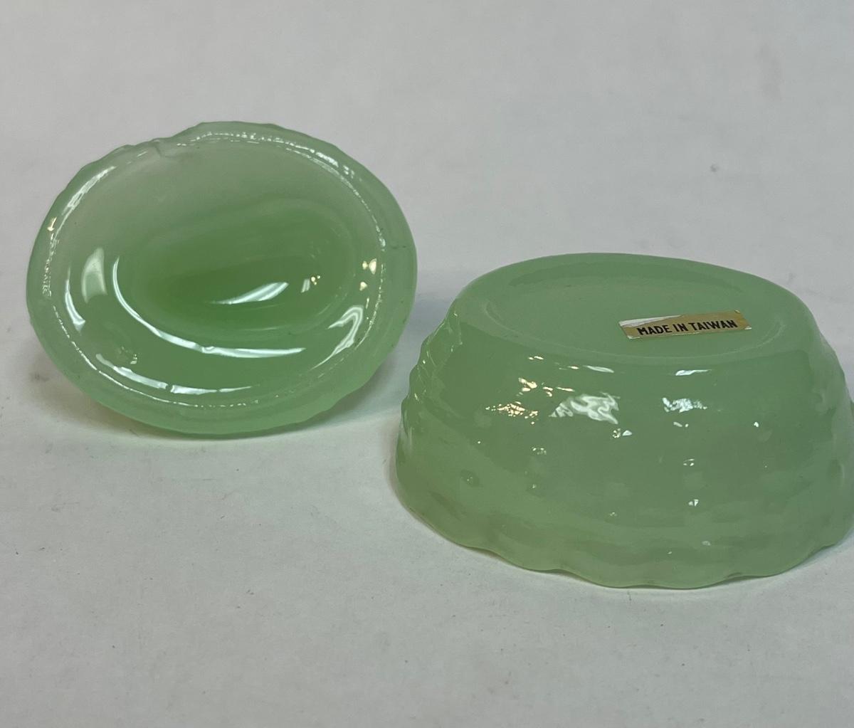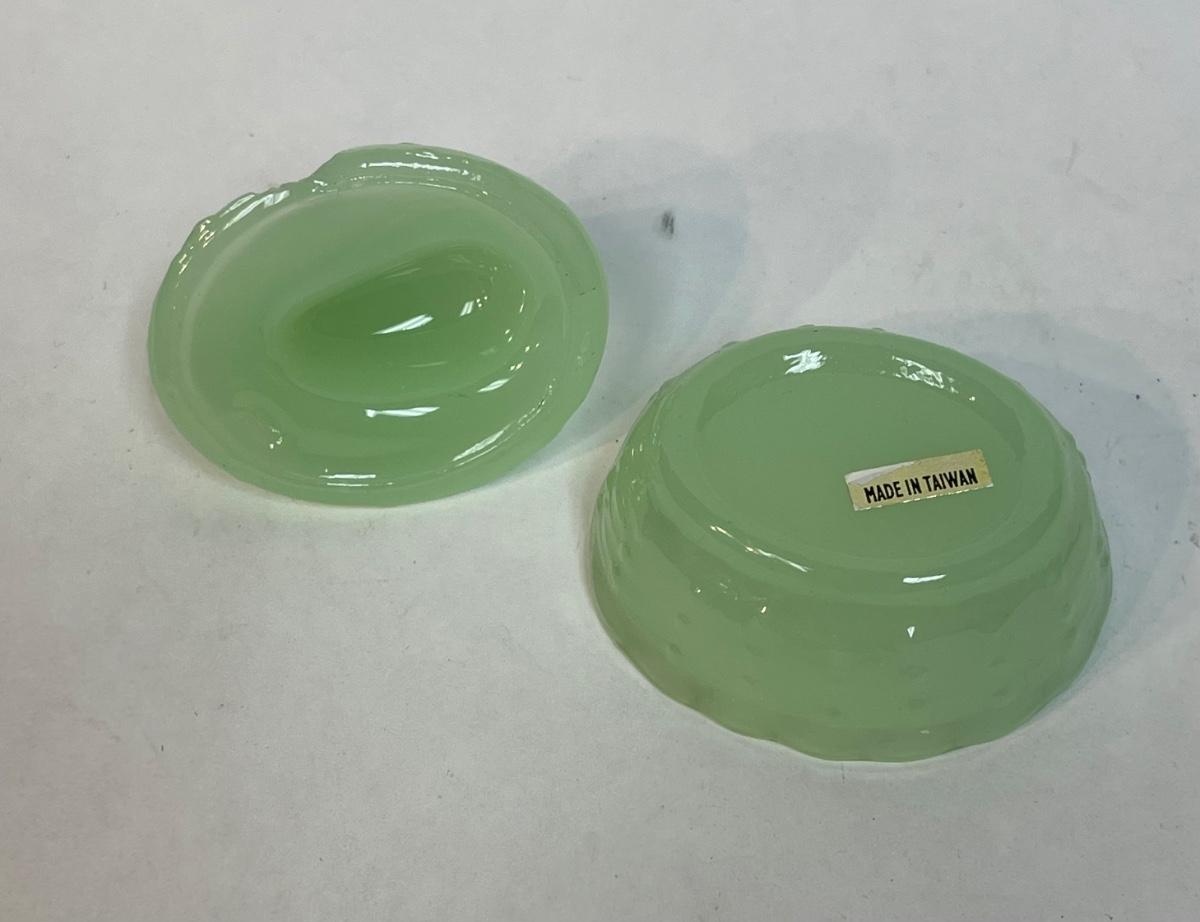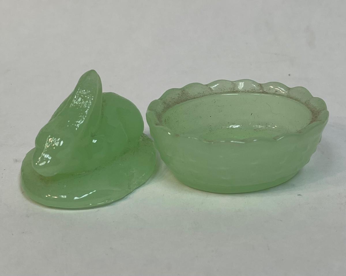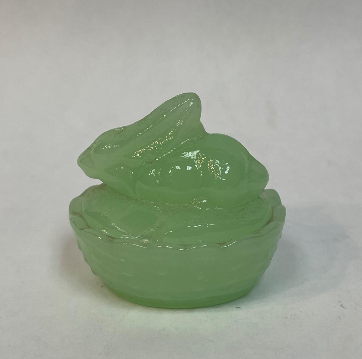 Vintage Opaque Green Jadeite Glass Miniature Rabbit Bunny in Basket Lidded Trinket Dish Salt Cellar