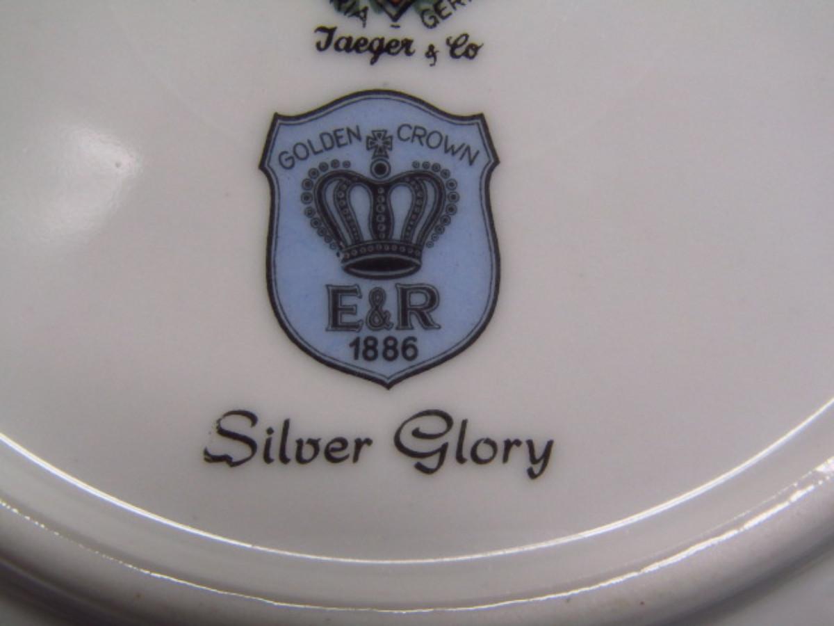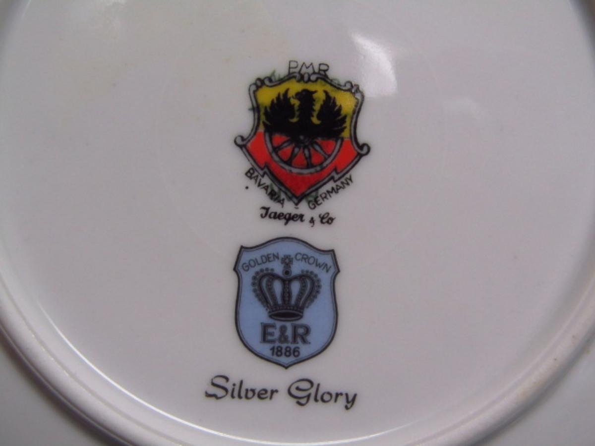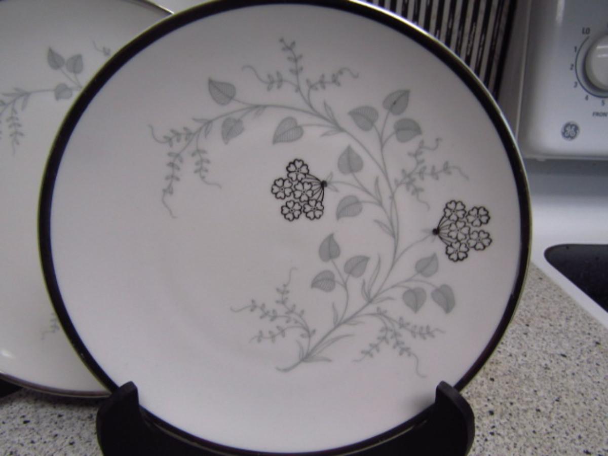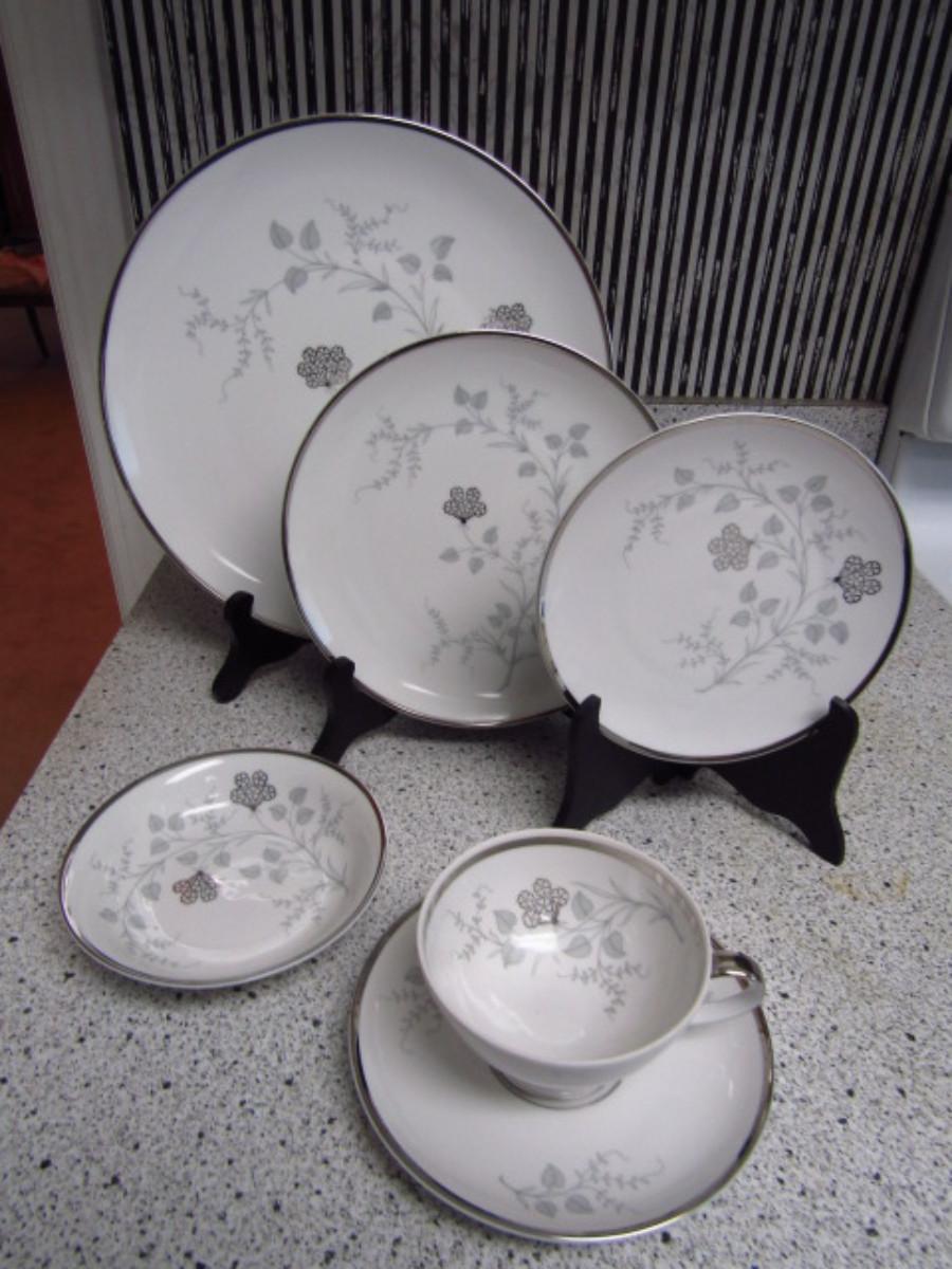 Jaeger & Co Dinnerware- Silver Glory Pattern- Approx 54 Pieces. Dinner plates- 9 pcs. Salad plates- 9 pcs. Bread plates- 9 pcs. Berry bowls- 7 pcs, Cups- 8 pcs. Saucers- 9 pcs. Platters- 2 pcs. Vegetable bowl- 1.