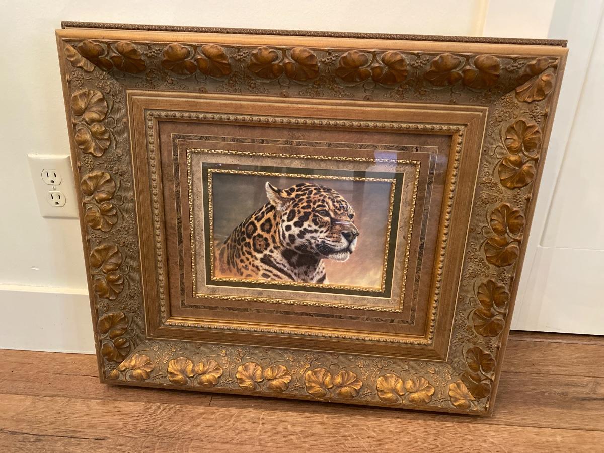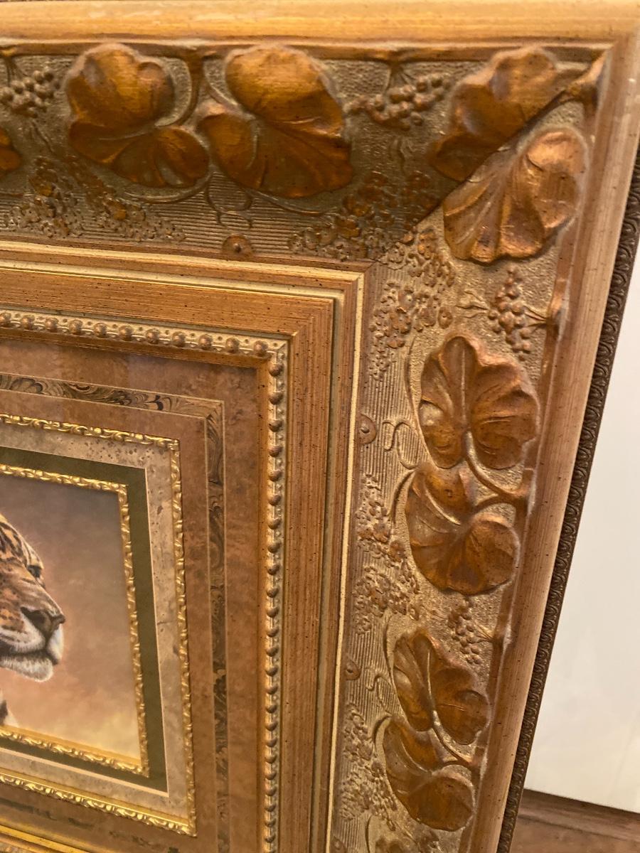 In ornate carved gilt frame. Measures 24 inches wide by 27 inches high frame. (dining room area)