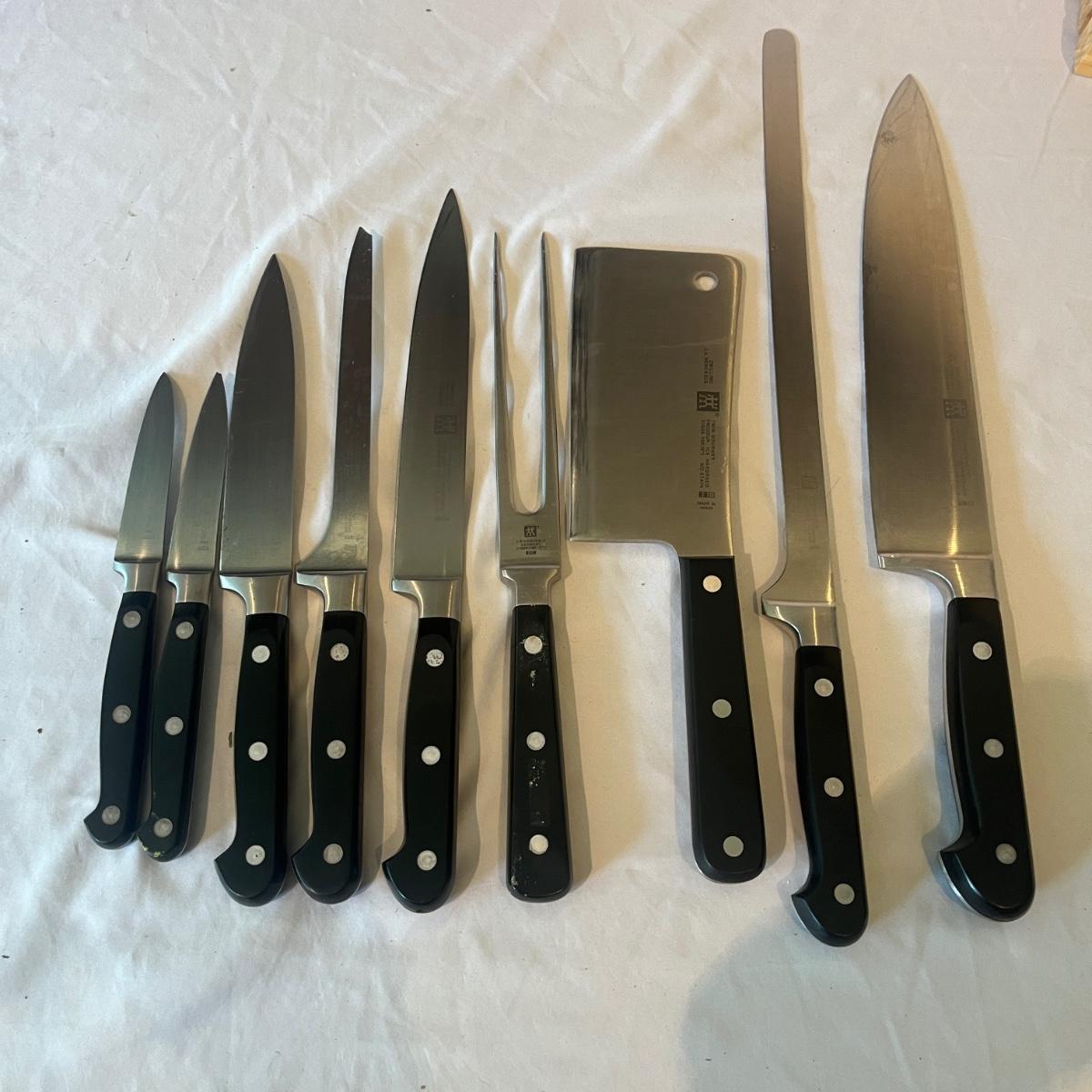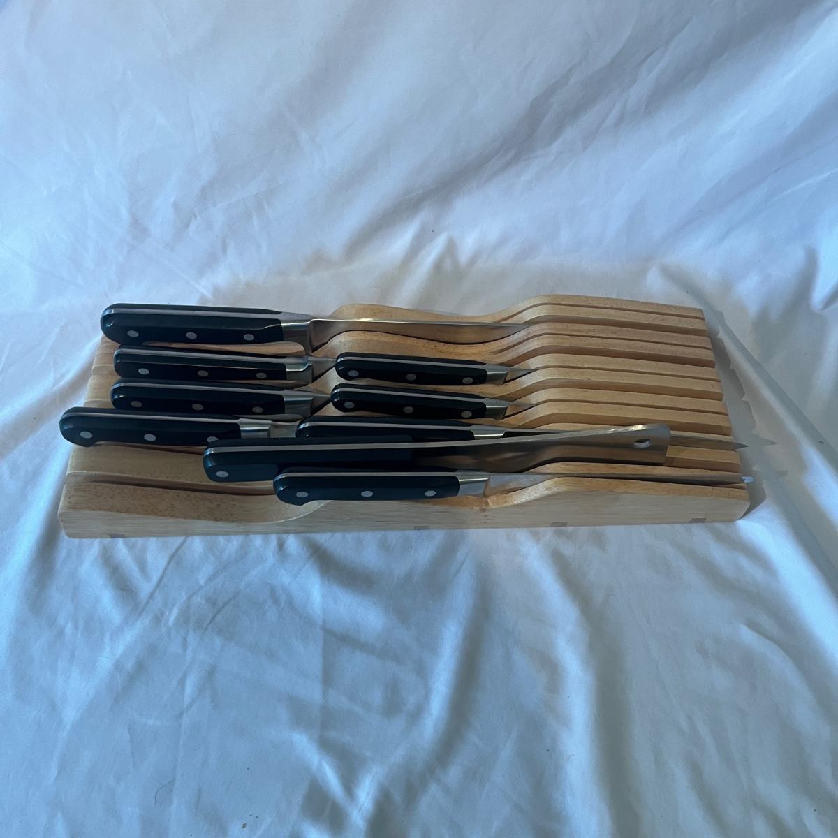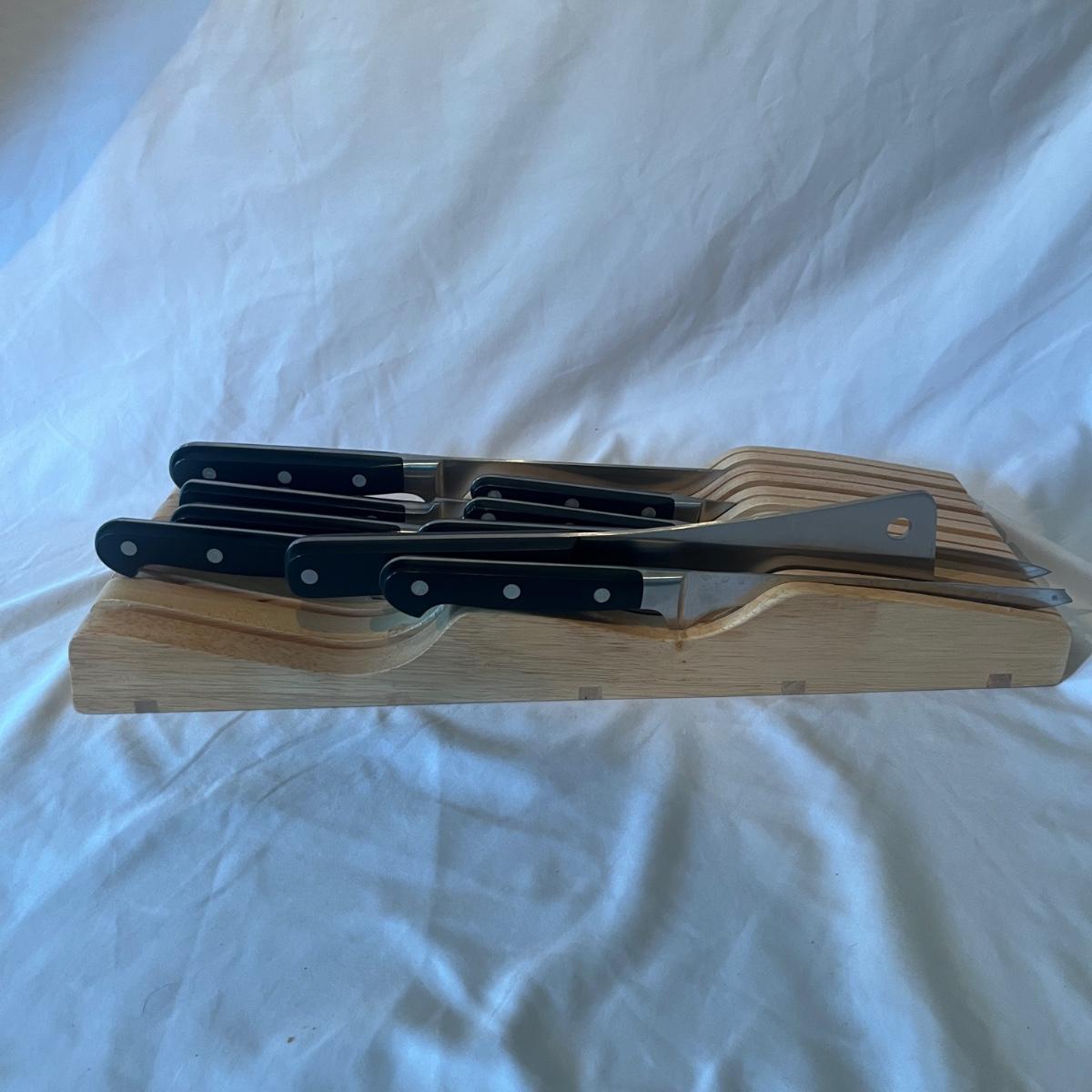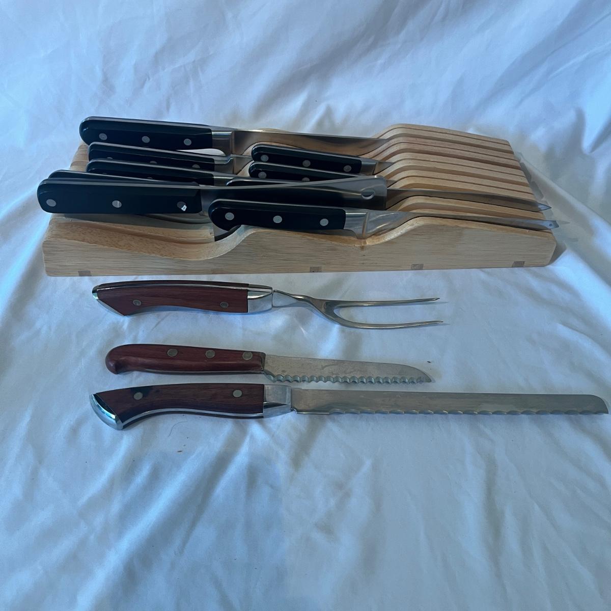 Lot includes a nine piece J.A.Henckels knife set with wooden holder. Also includes two Swedish knives and an unmarked serving fork. Wooden holder measures 17” x 6” x 2”H.