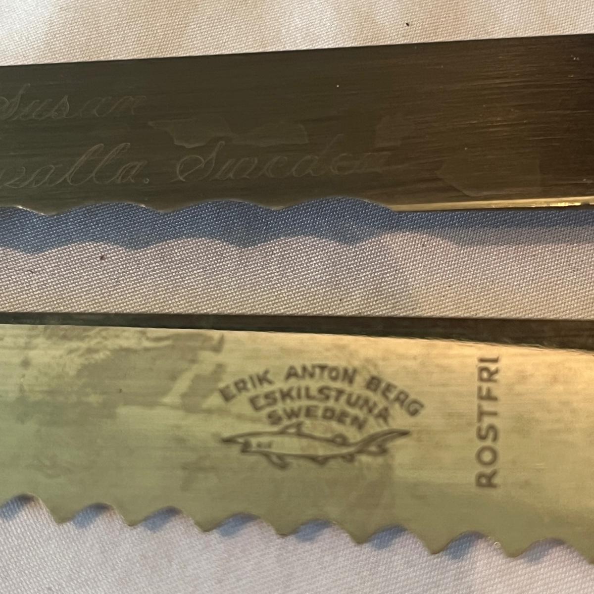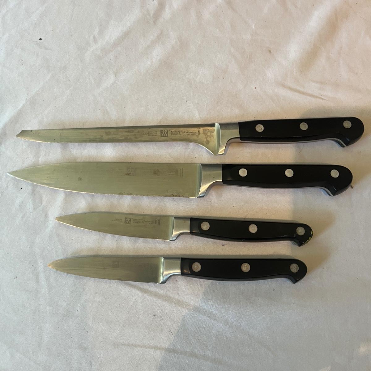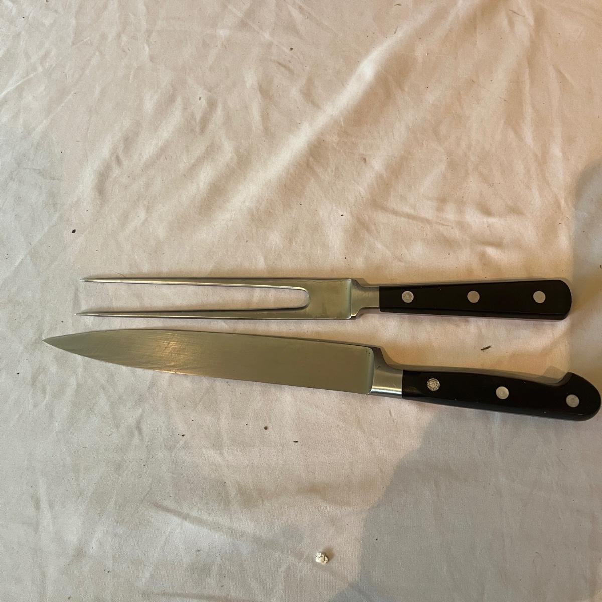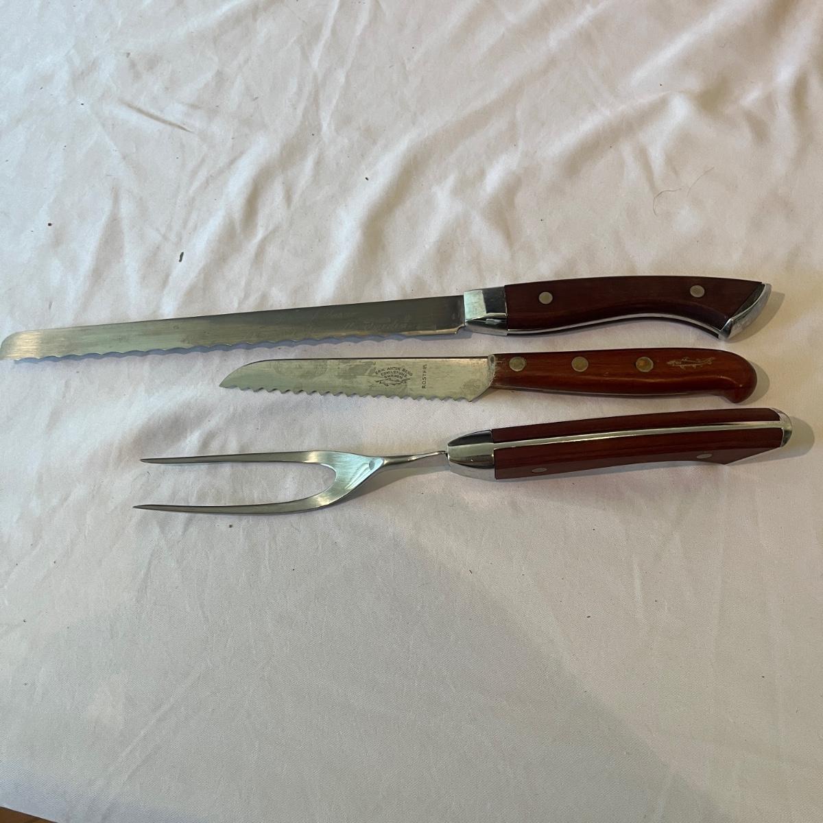 Lot includes a nine piece J.A.Henckels knife set with wooden holder. Also includes two Swedish knives and an unmarked serving fork. Wooden holder measures 17” x 6” x 2”H.