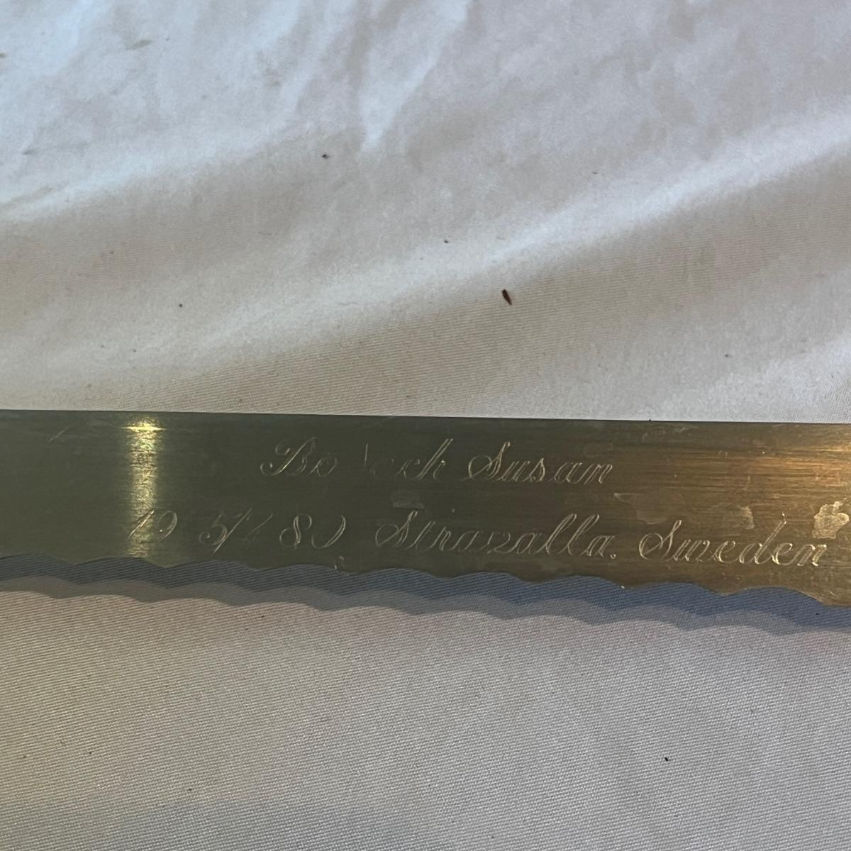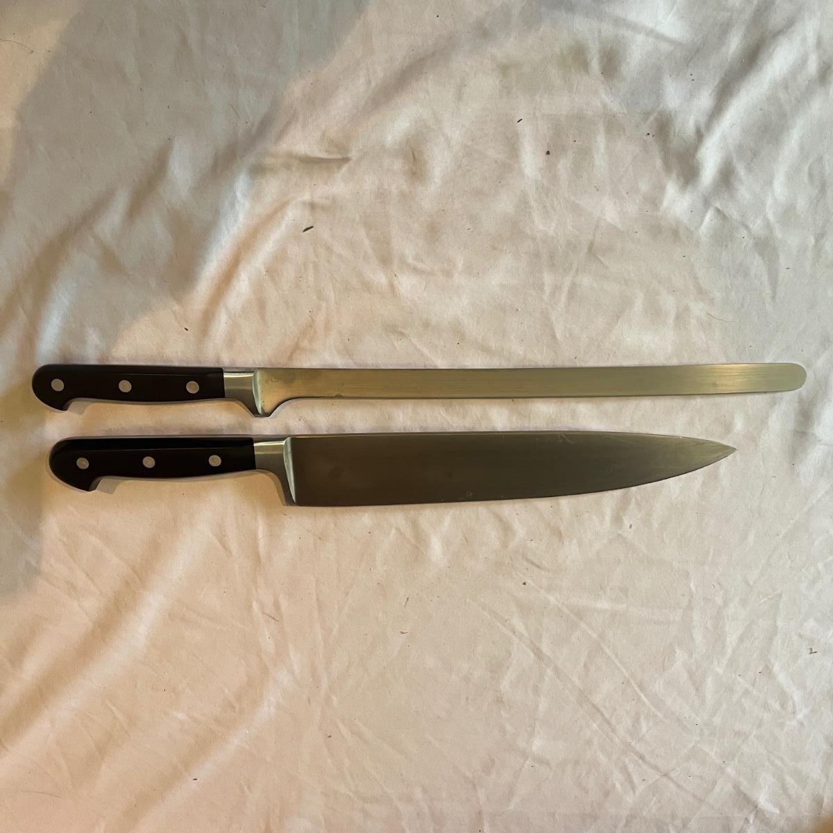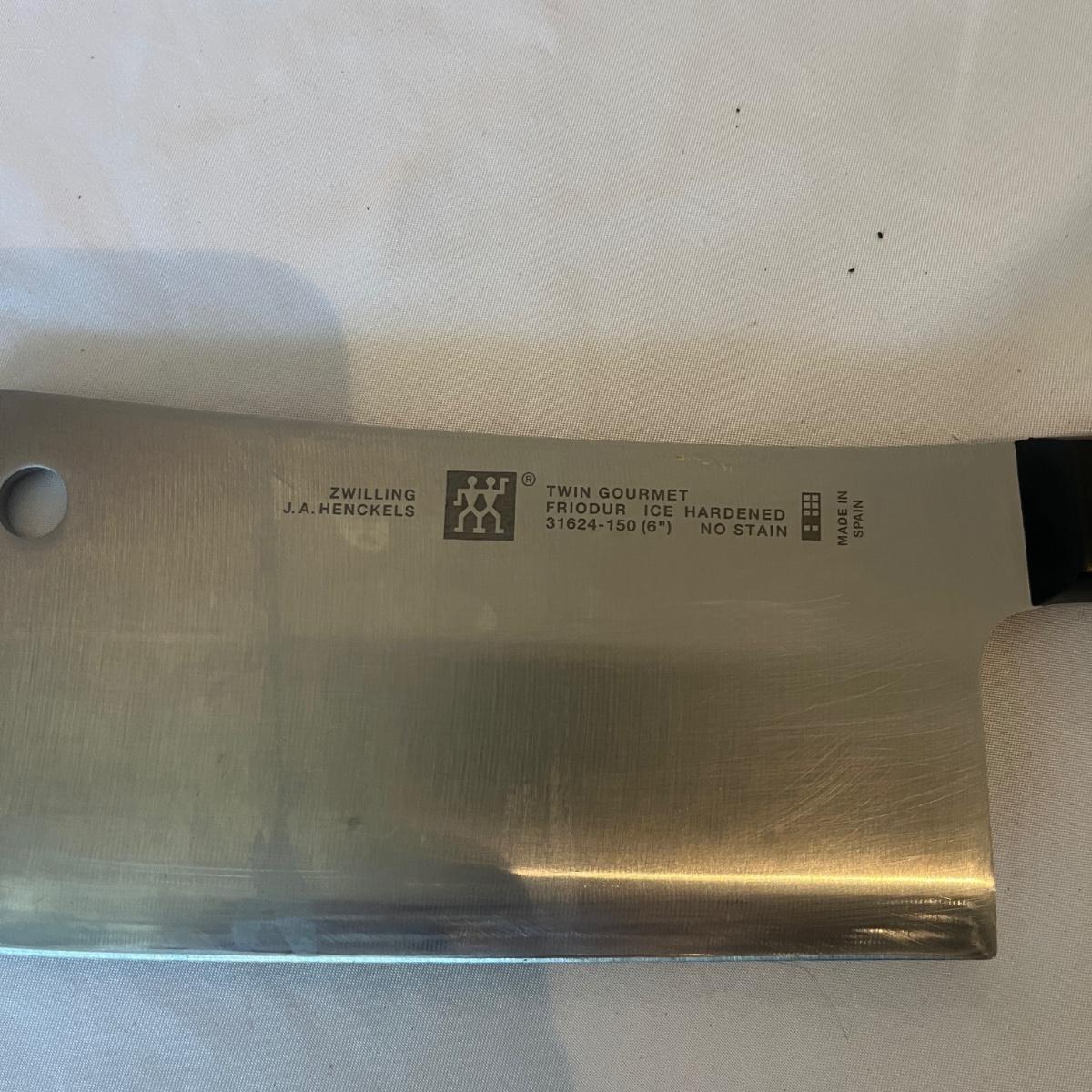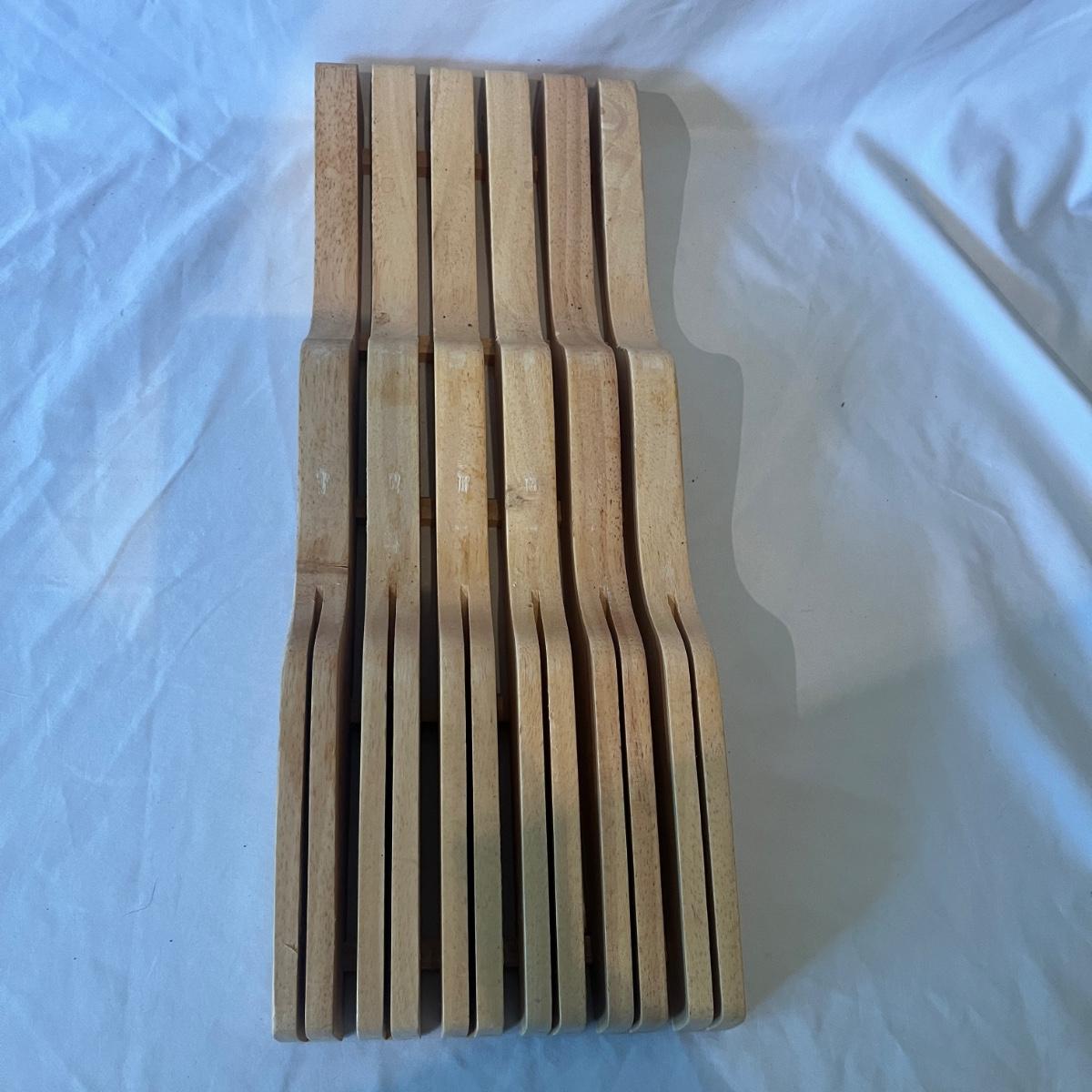 Lot includes a nine piece J.A.Henckels knife set with wooden holder. Also includes two Swedish knives and an unmarked serving fork. Wooden holder measures 17” x 6” x 2”H.