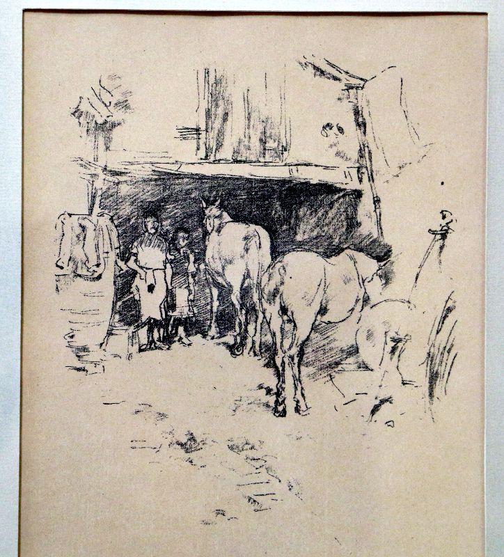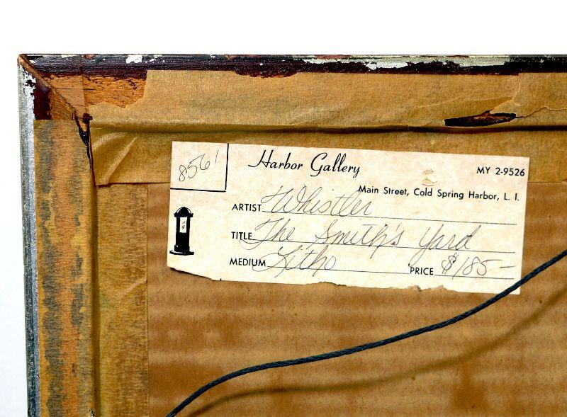 The Smith's Yard. Circa 1895 Original Stone Lithograph. Way 88; Levy 126. Edition about 3,000. As published in The Studio, June, 1896, London England and with their blindstamp in the lower margin of the lithograph. Signed with the butterfly on the stone. The image is a view of the Govier family's blacksmith shop in Lyme Regis, Dorset, seen from the courtyard. One of seventeen original lithographs drawn by Whistler on transfer paper whist staying in Lyme Regis in the autumn of 1895. Samuel Edward Govier and his son posed for these lithographic drawings and it is his son who is seen standing at the left in this image. S.E.Govier senior also sat for Whistler’s oil painting entitled The Master Smith (Boston Museum of Fine Arts). Original 1895 lithograph on smooth cream wove paper, with margins as issued. Very fine original condition framed into wood frame with glass front, matted and ready for new home - Collector's item!