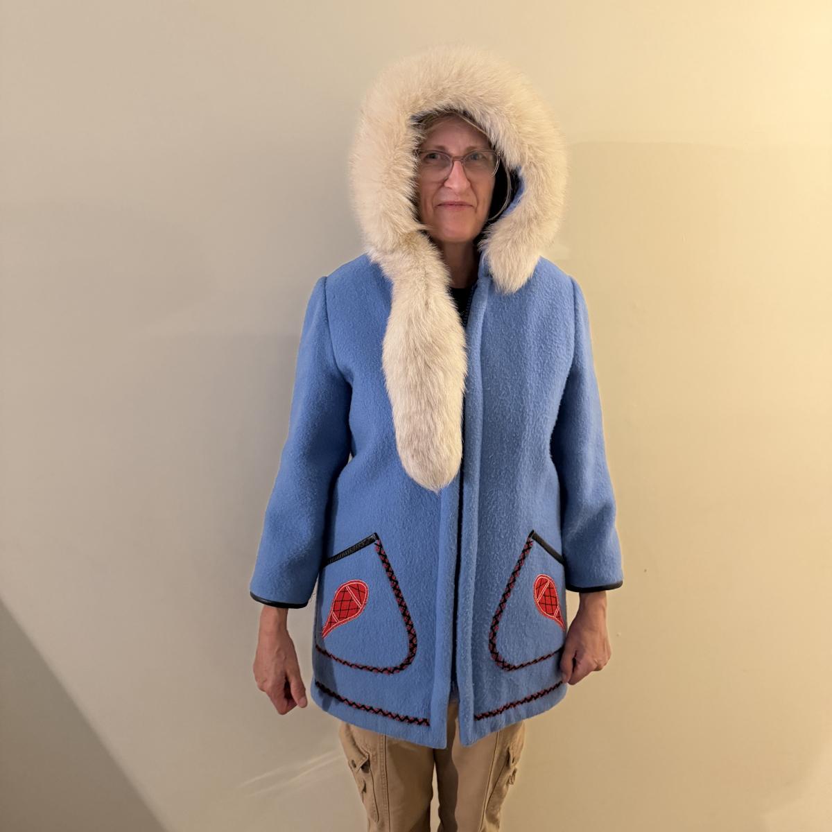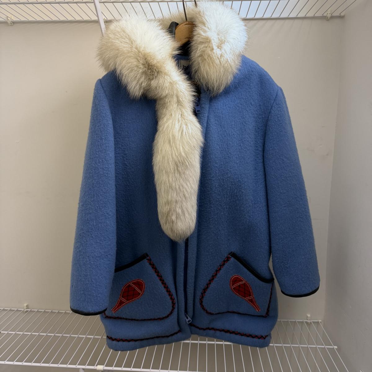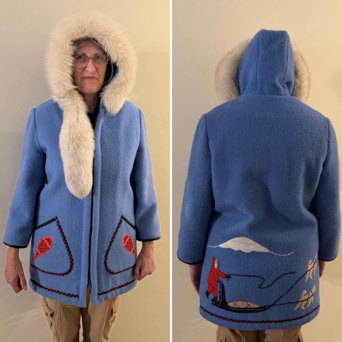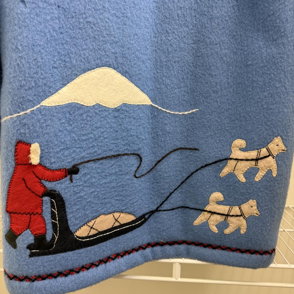This James Bay coat is pure virgin wool and has a real fur-lined hood. It features an adorable dog sledding design. Coat's chest measures 24” from pit to pit with a 32” length.