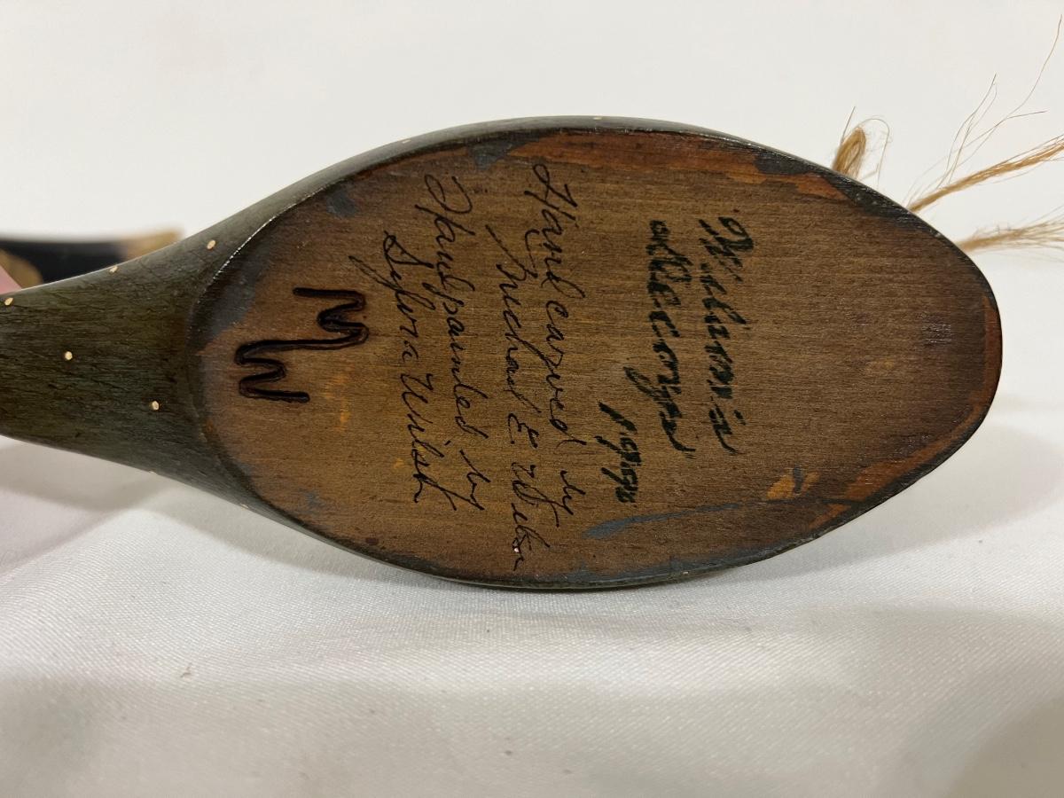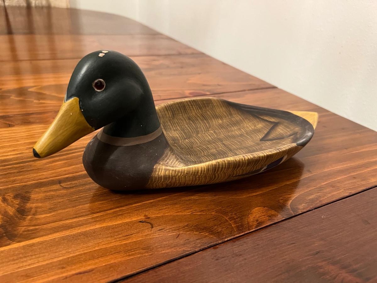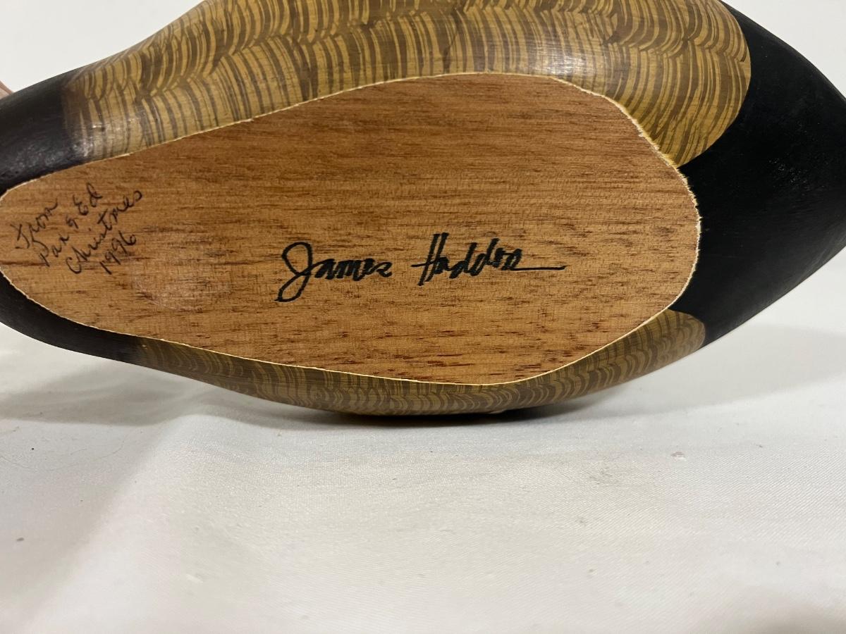 JAMES HADDON & MICHAEL WILSON Hand Carved Wooden Ducks. Both are marked on the bottom (see pictures). James HADDON hand carved duck measures 12 1/2 inches long, 5 inches tall. Michael Wilson duck is hand painted by Sylvia Wilson. Measures 8 1/2 inches long, 4 inches tall.