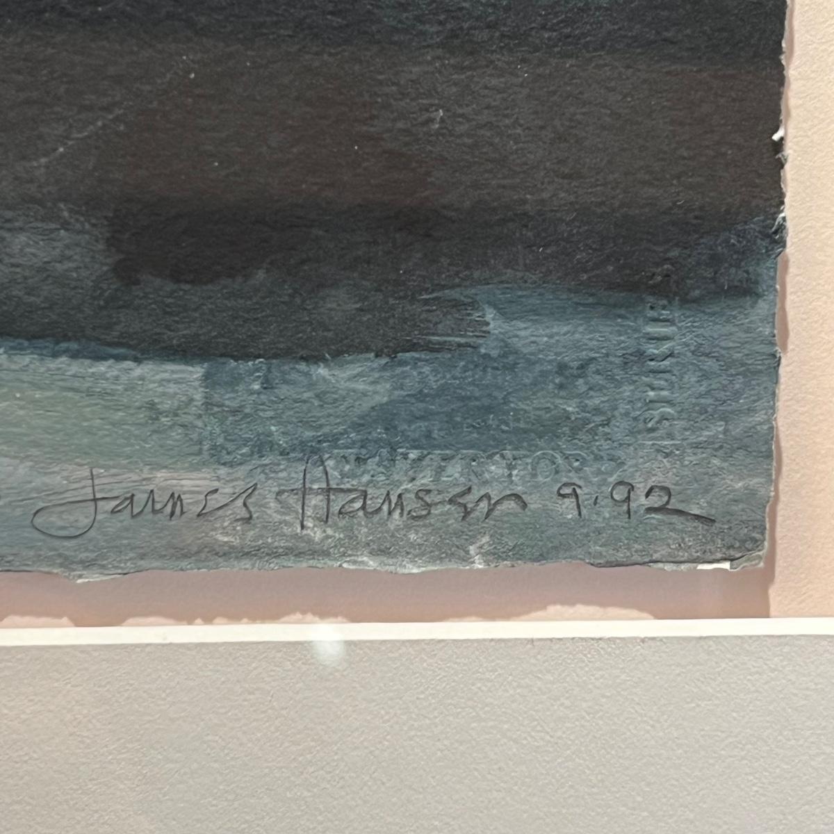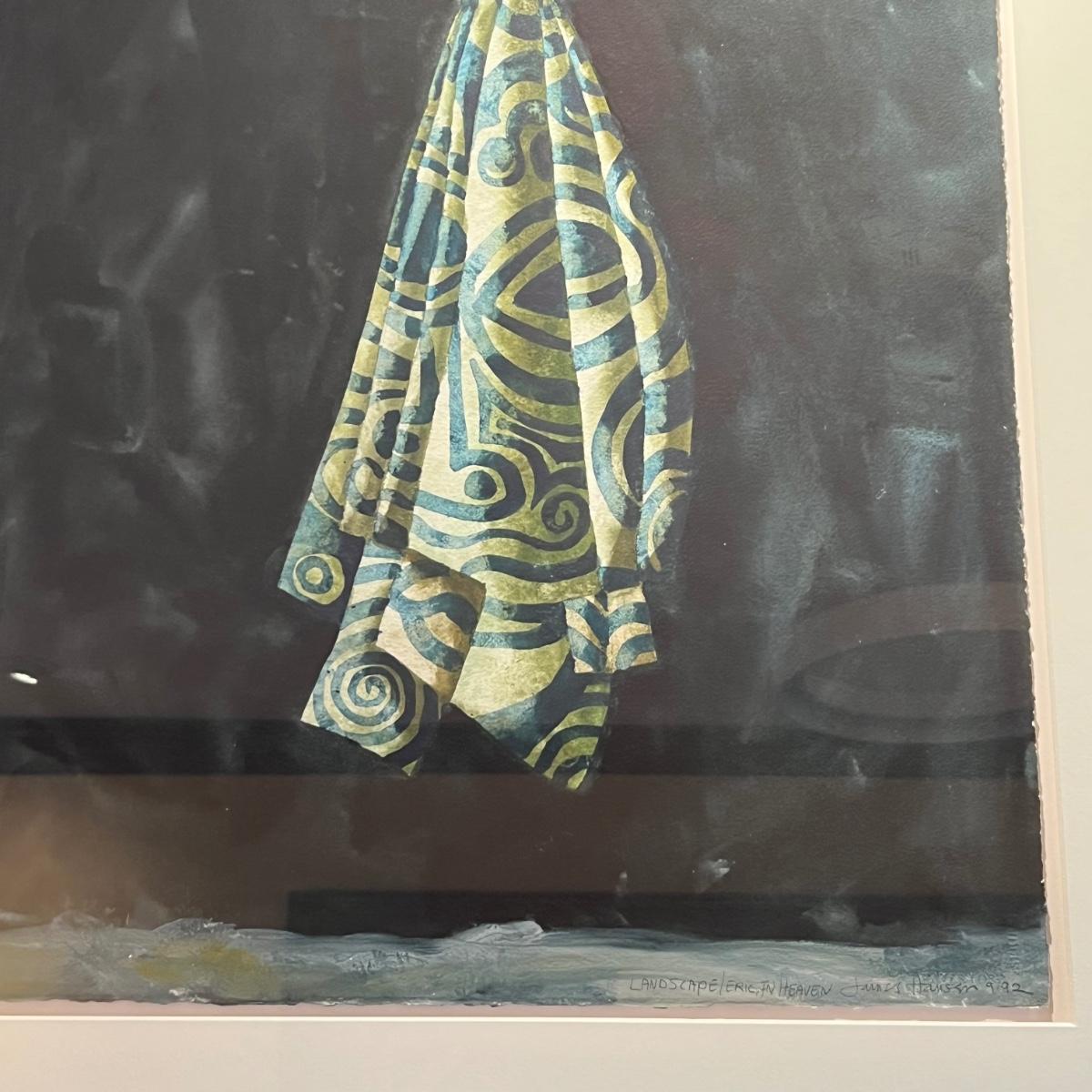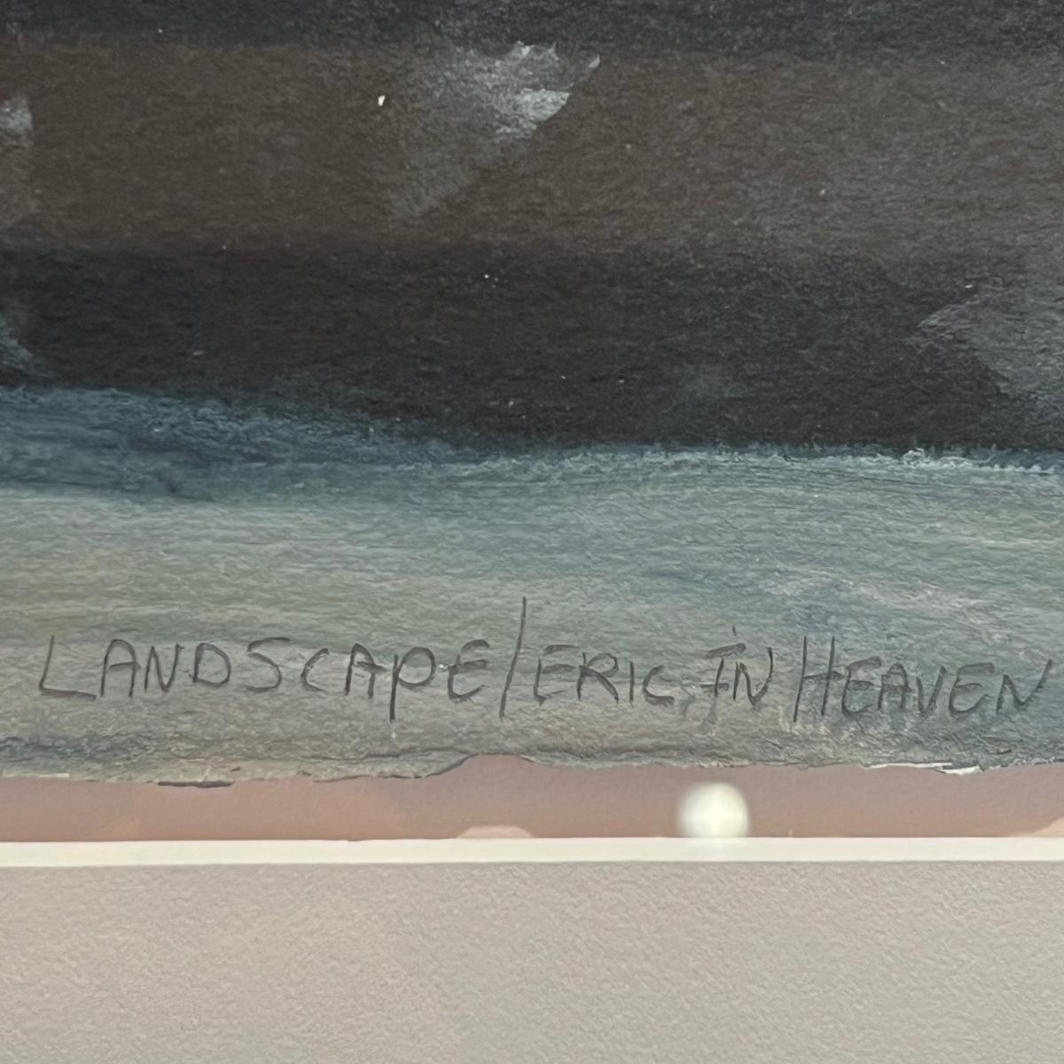 This James Hansen art's backing states it is gouache on paper. Piece appears to be pencil signed and “Landscape/Eric in Heaven” is written in pencil. The label on the back reads that the title is “Closed Umbrella”. Mounted under glass in a wood frame that measures 29” x 2” x 31.5”H.