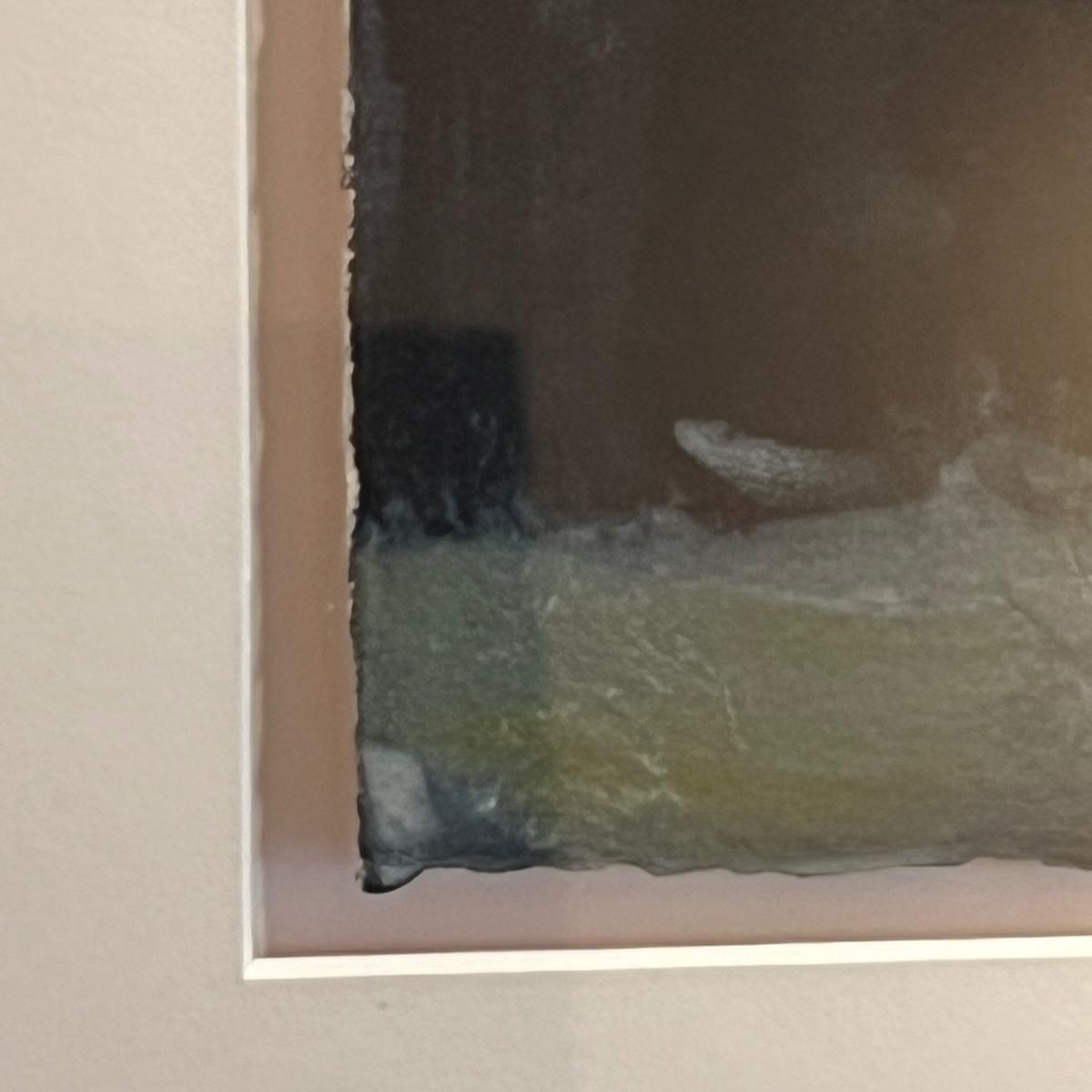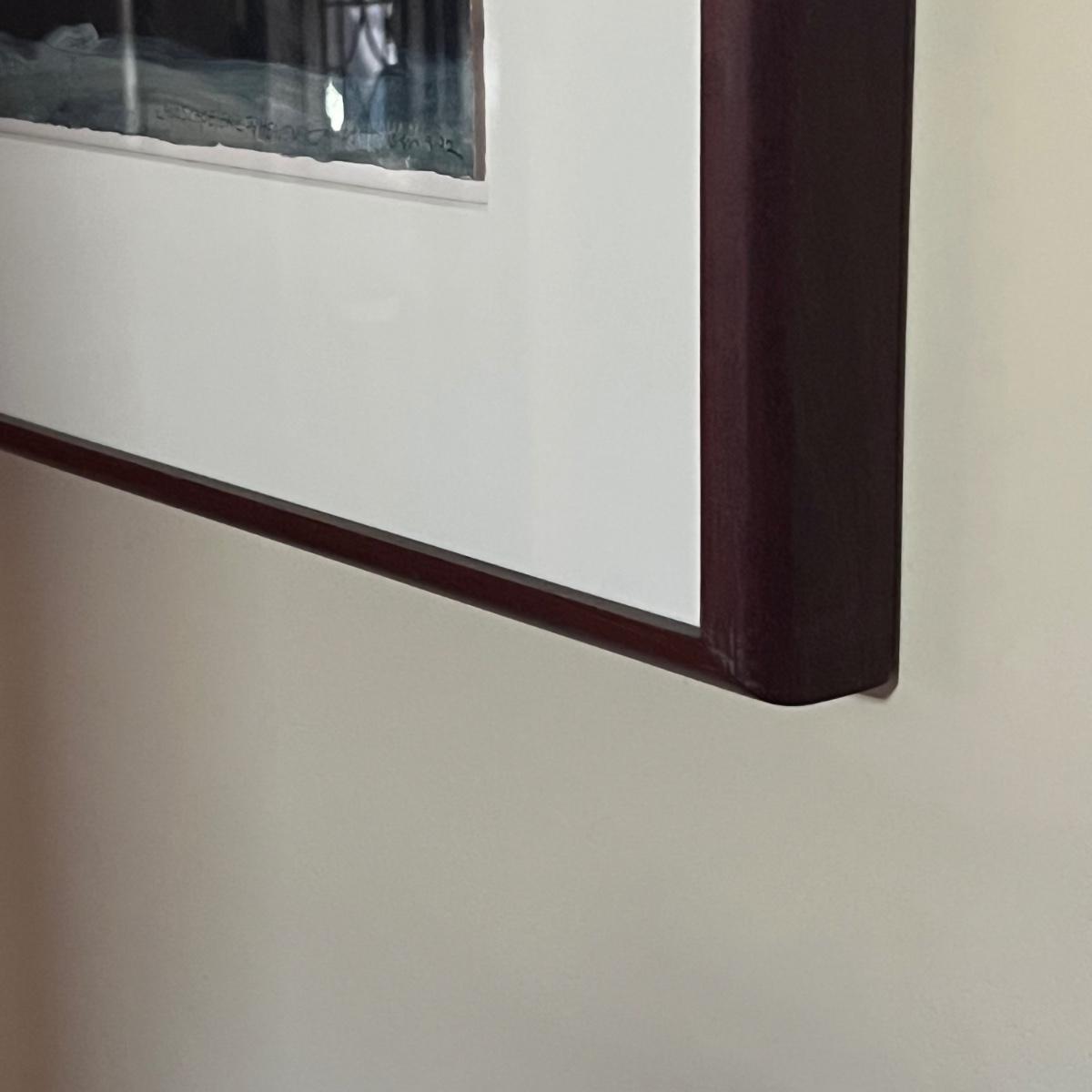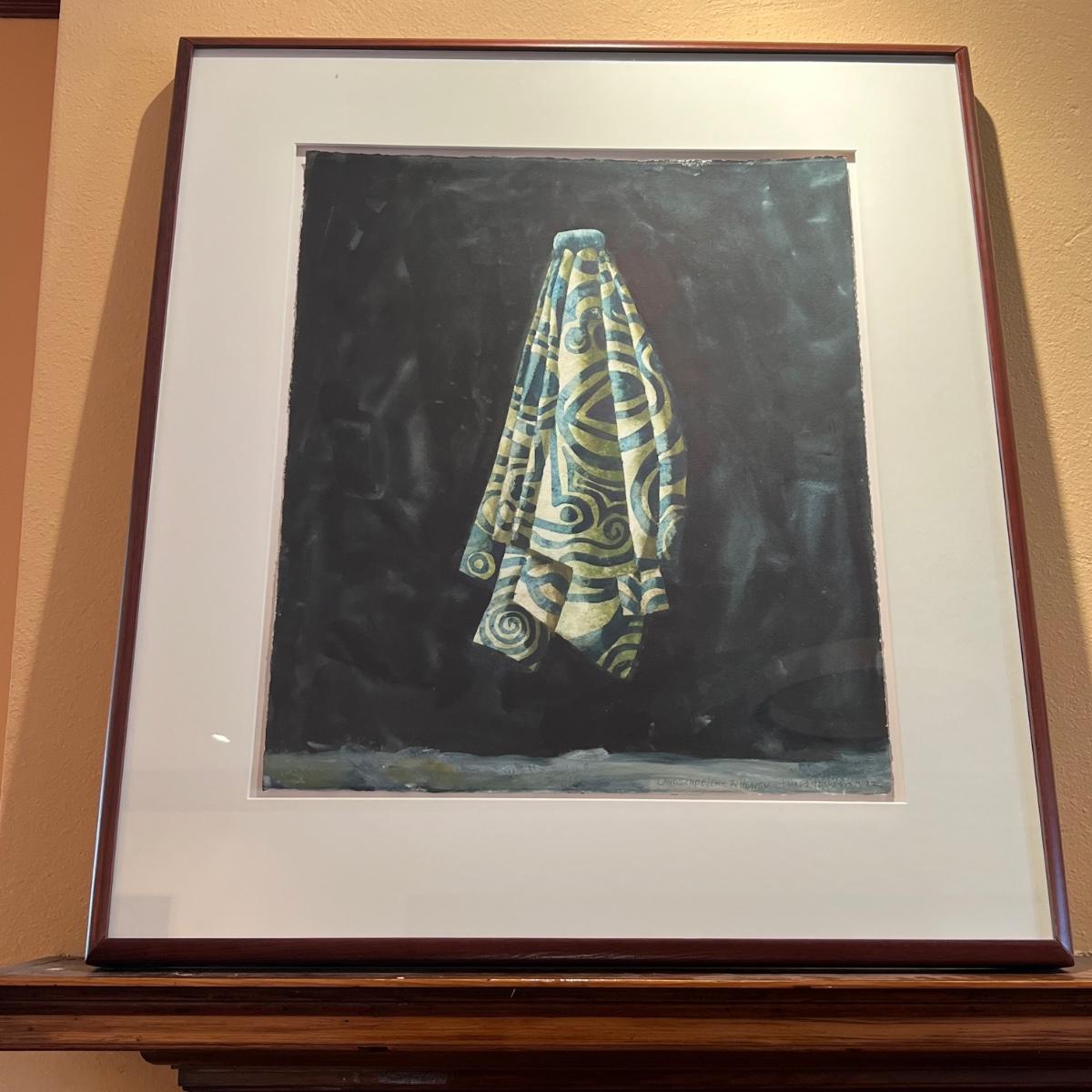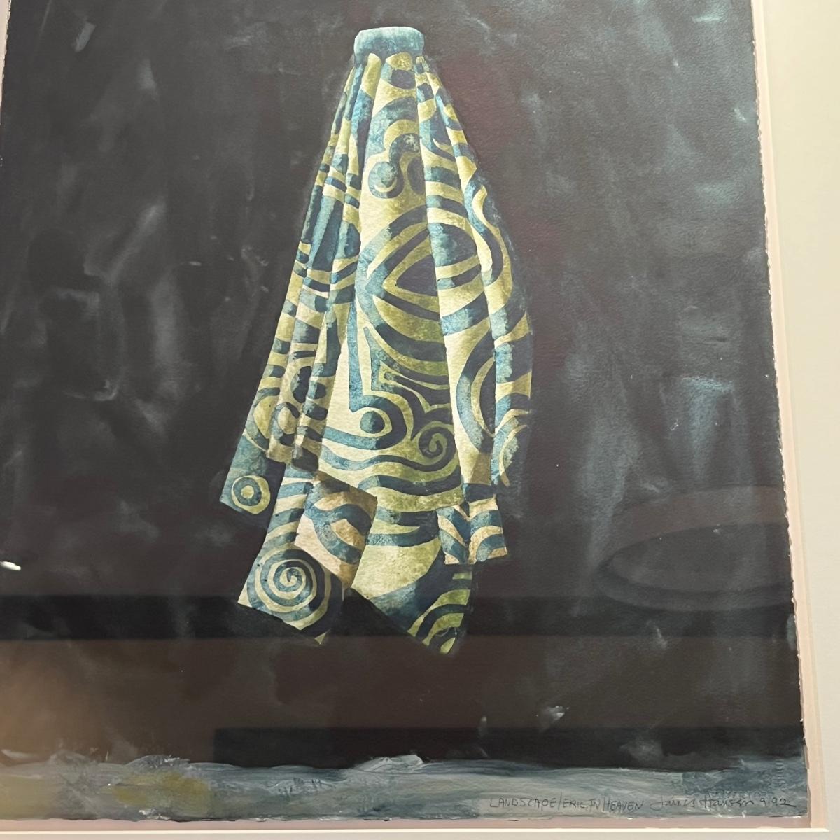 This James Hansen art's backing states it is gouache on paper. Piece appears to be pencil signed and “Landscape/Eric in Heaven” is written in pencil. The label on the back reads that the title is “Closed Umbrella”. Mounted under glass in a wood frame that measures 29” x 2” x 31.5”H.