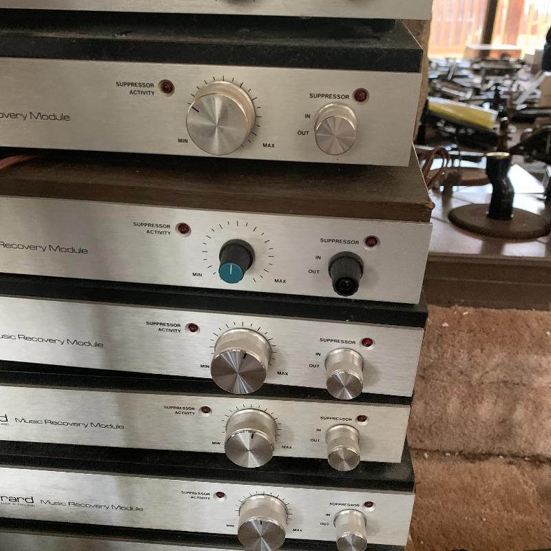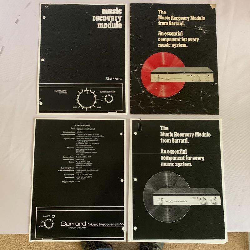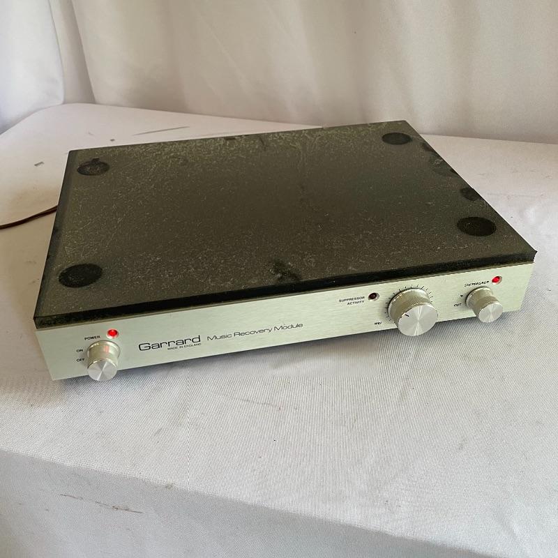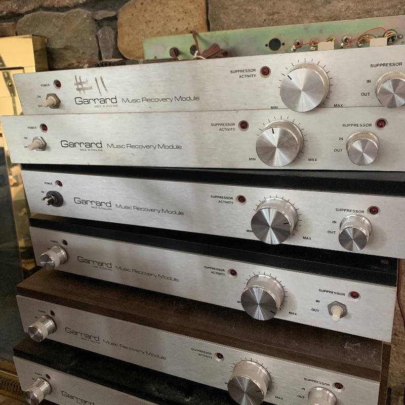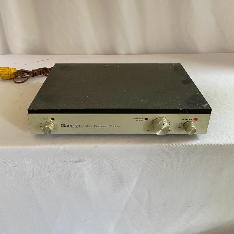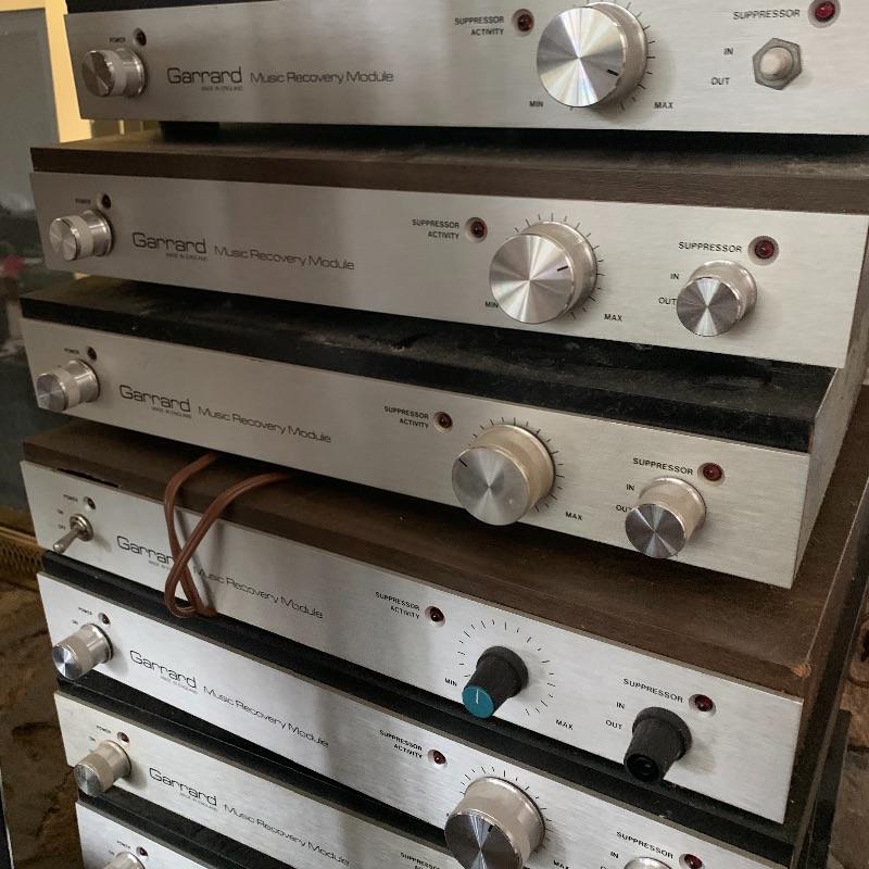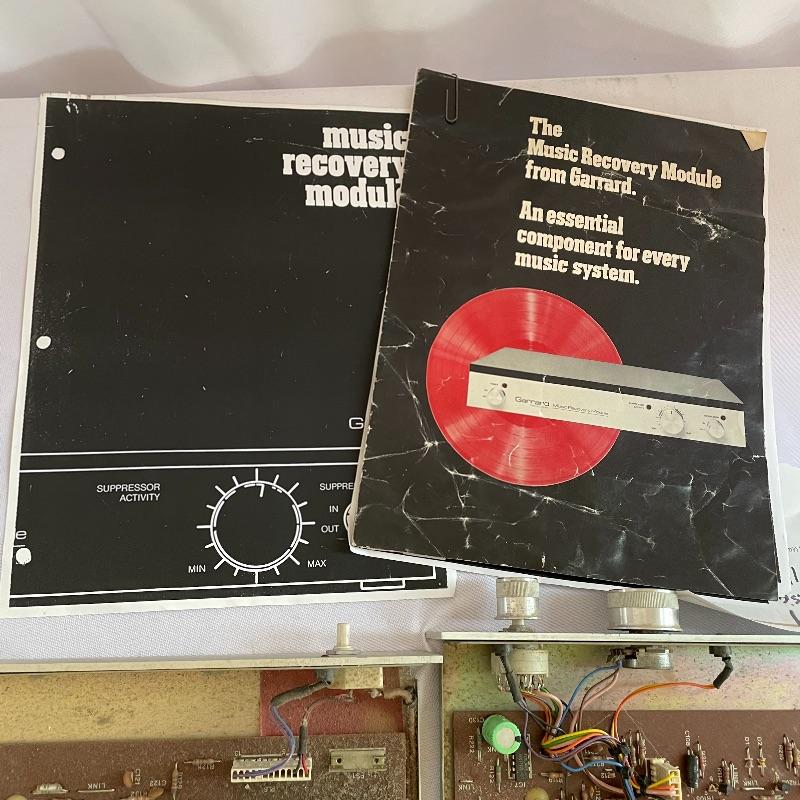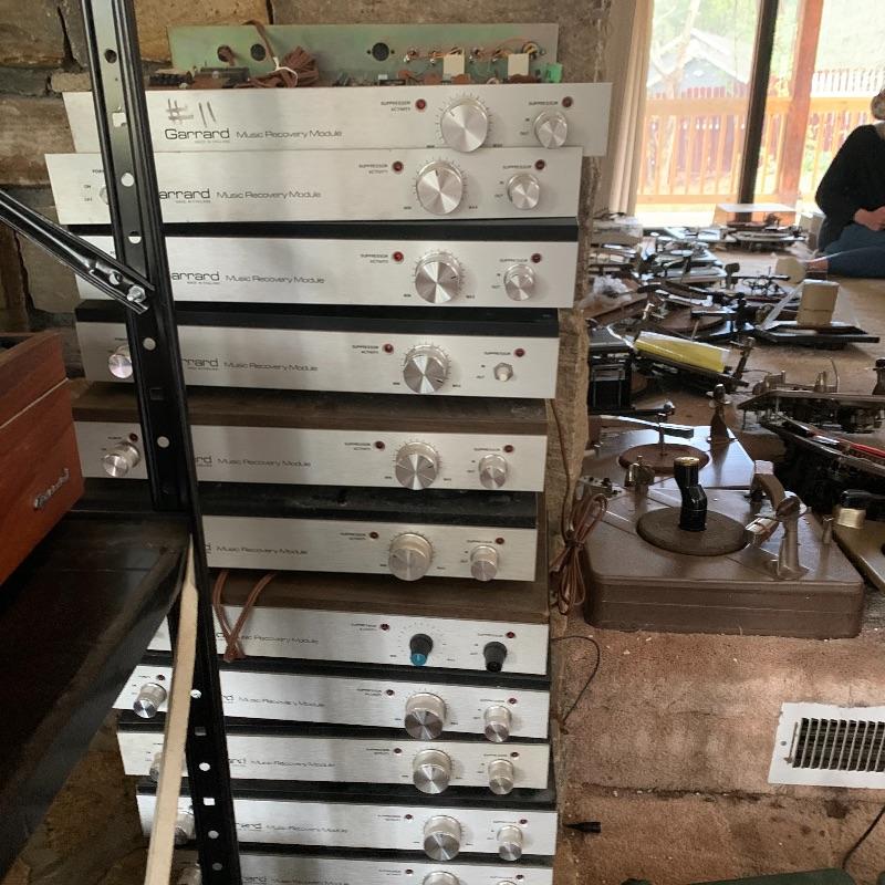 Eleven Garrard music recovery modules. Two are missing their factory housing, but the other nine appear complete. There is also Garrard literature included in this lot. The two missing housing were not tested. See whether a unit powered on in images followed by their serial numbers. One unit was not tested due to cord shape.
