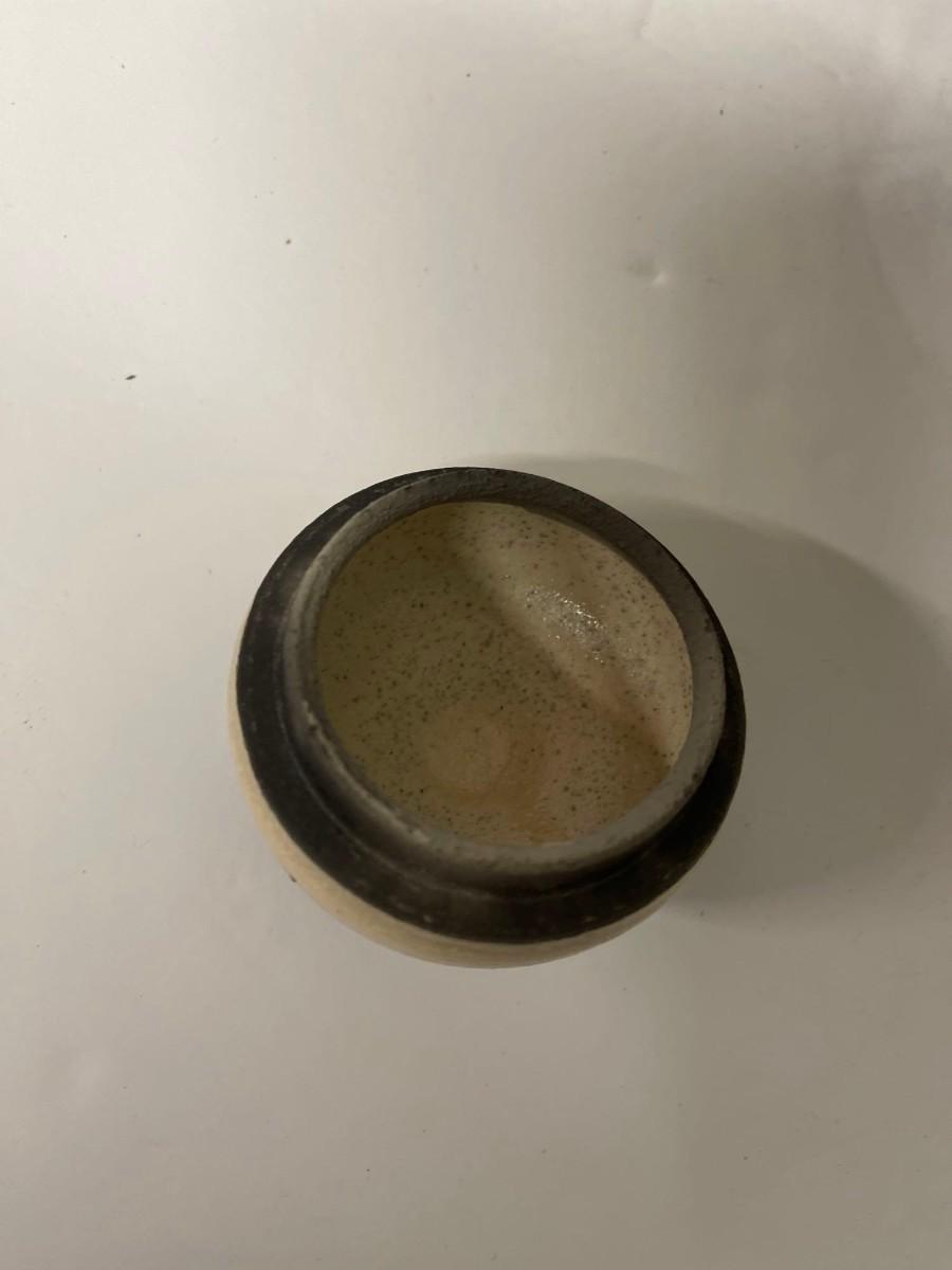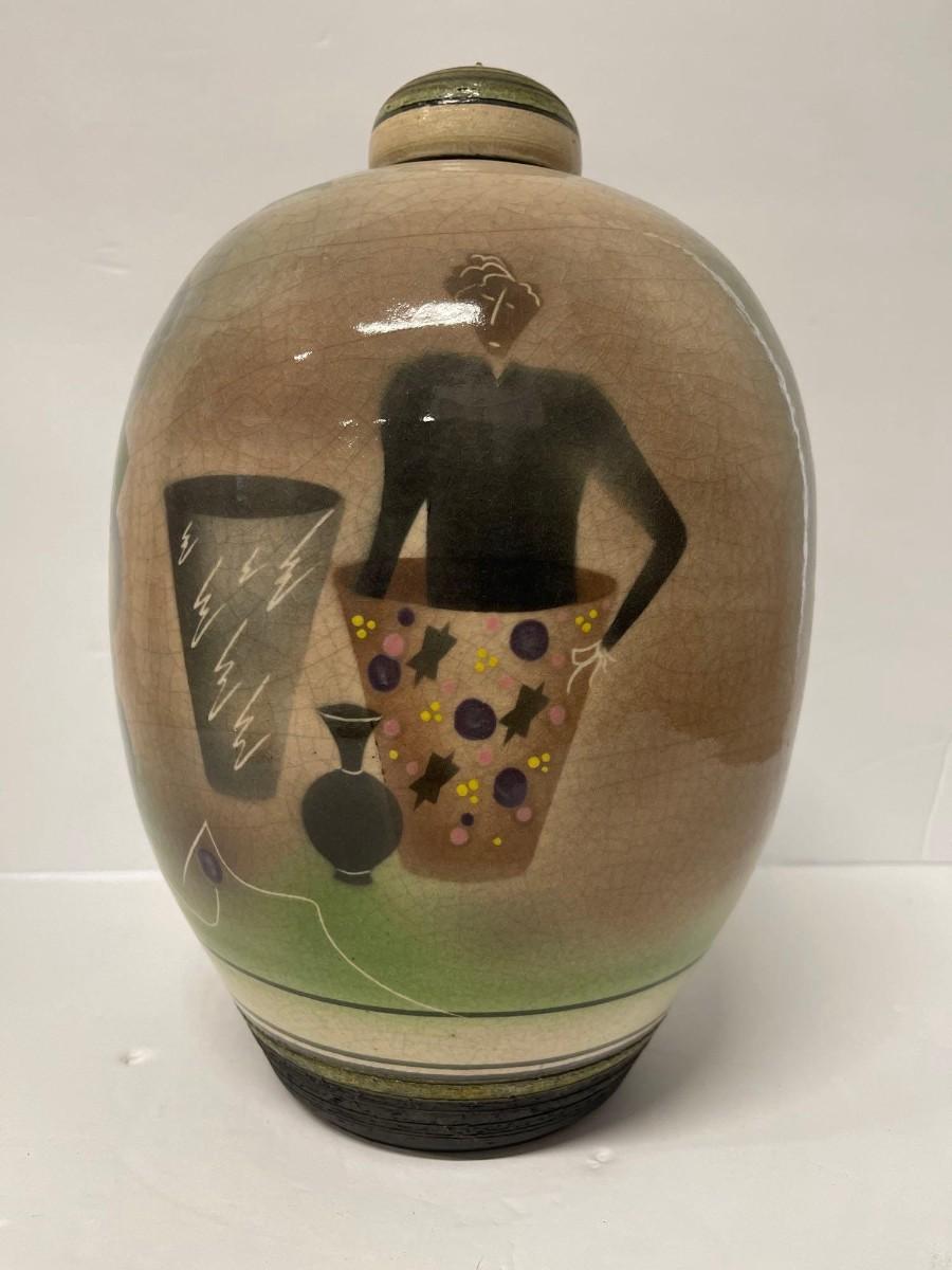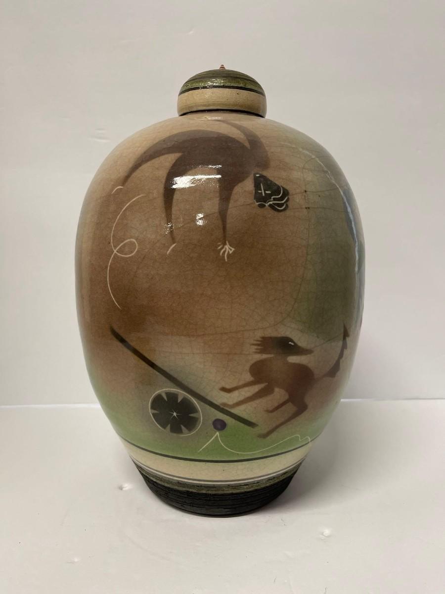 Jamie Davis pottery jar with lid.12 1/2” to tip of lid. Excellent condition. Marked JD on bottom. Jamie Davis was born in Philadelphia in 1945. He earned a B.A. from Vanderbilt University, Nashville, in 1967, an M.A. from Exeter College, England, in 1971, and an M.F.A. from Clemson University, South Carolina, in 1973. Primarily a ceramicist, Davis also creates wall-mounted sculptures of metal, fabric, and paper. His work has been exhibited at the Renwick Gallery, Smithsonian Institution, Washington, D.C., and in several galleries.
