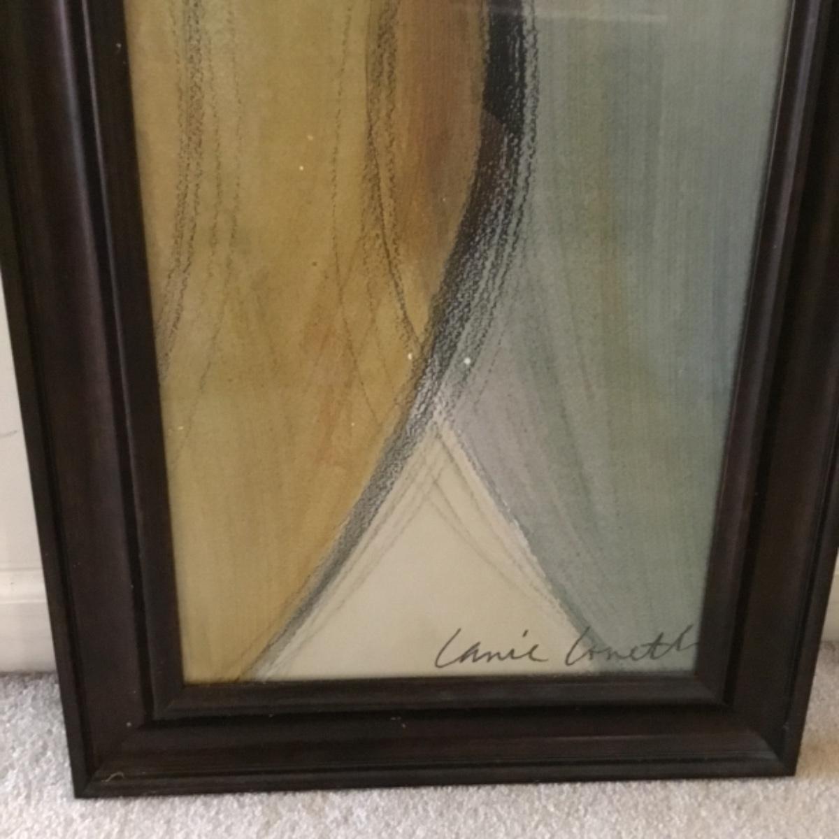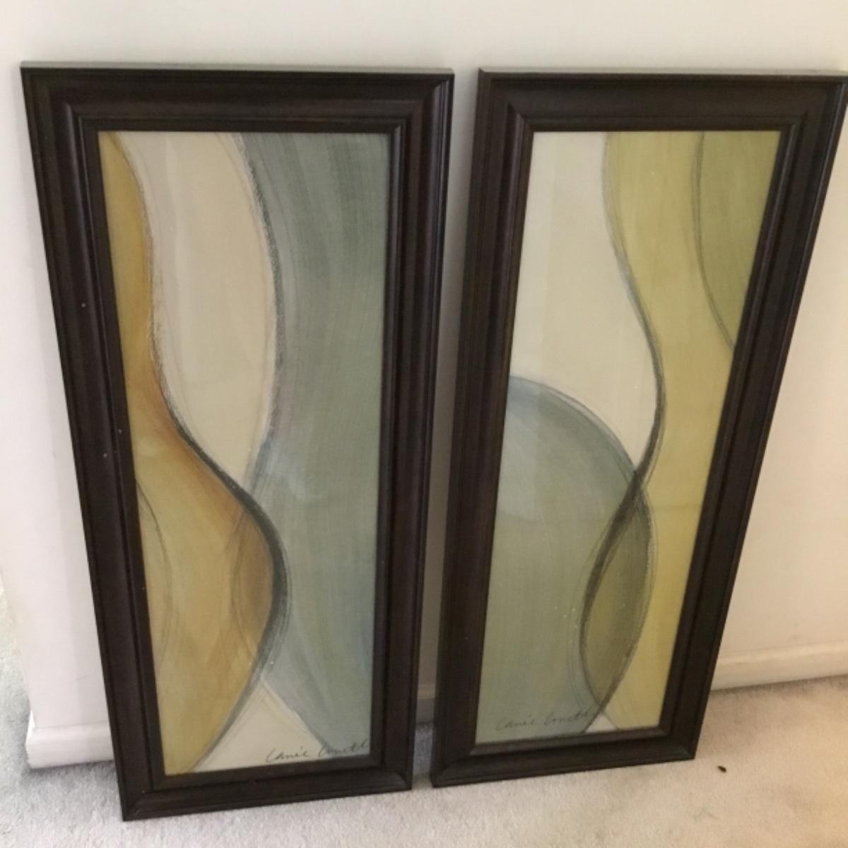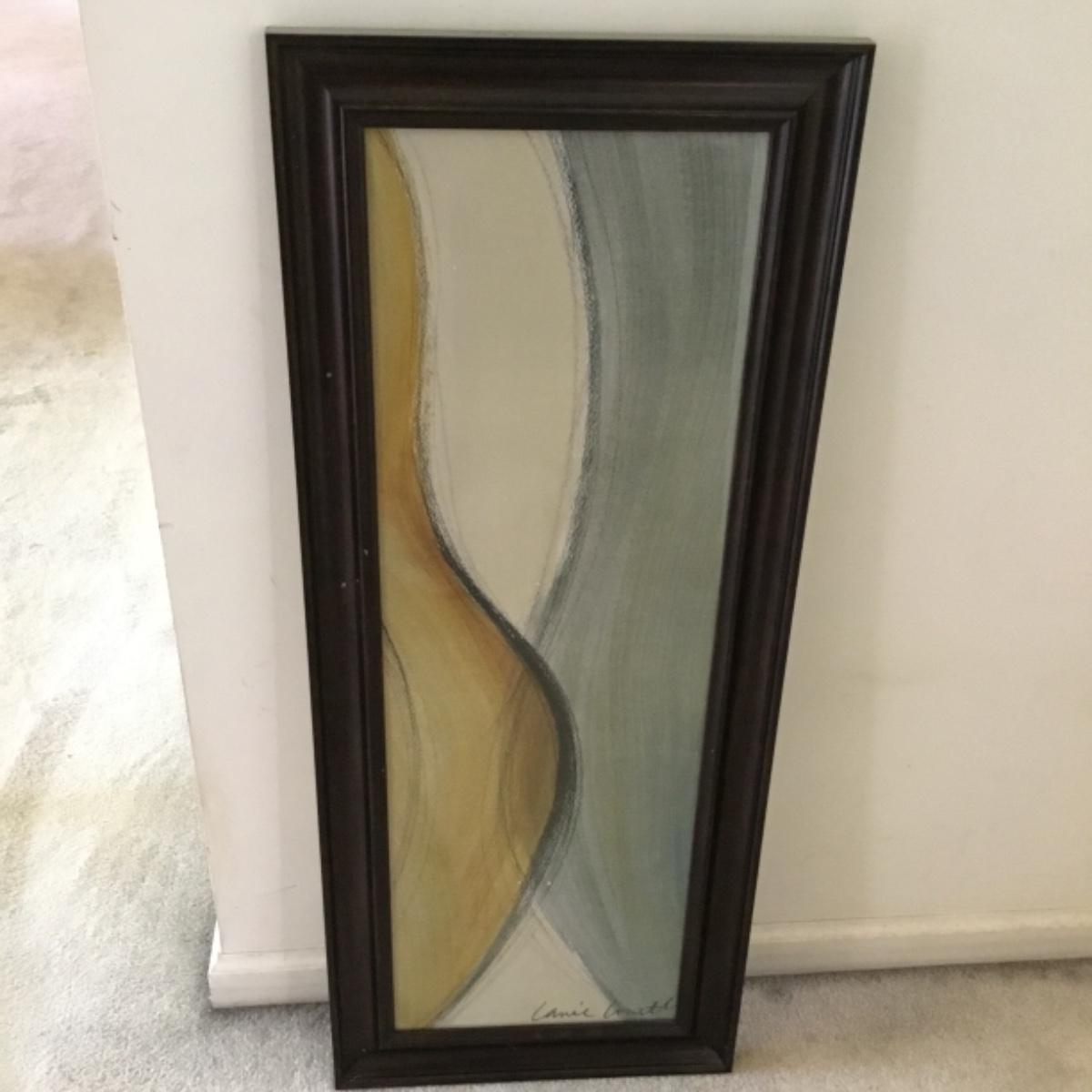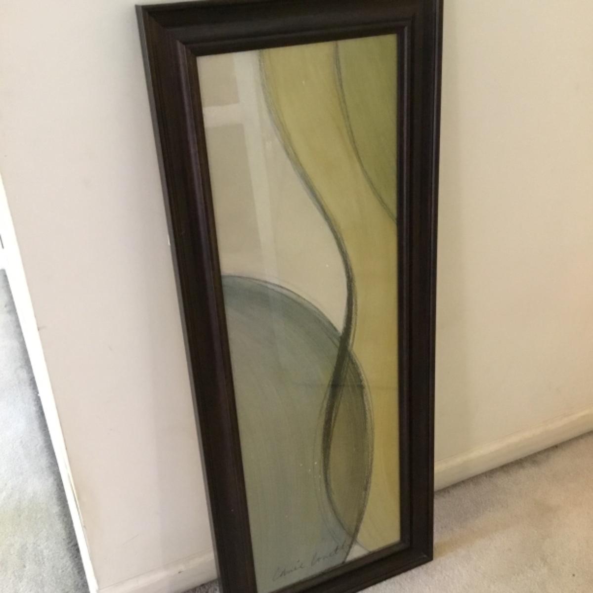 Lot includes two cohesive pieces of framed art. Frames both measure out to approx. 16.5”x40.5”. Notice the modern art design and colors of blue, green, orange and black sketching. “˜Jamie Loreth’ at the bottom of the art pieces. These are both prints. See photos for details. Local pickup only.