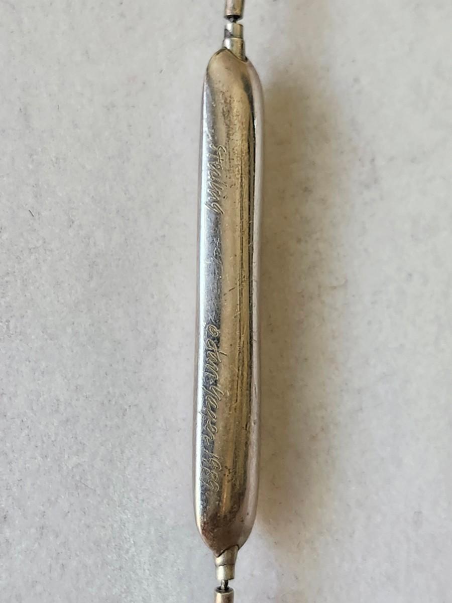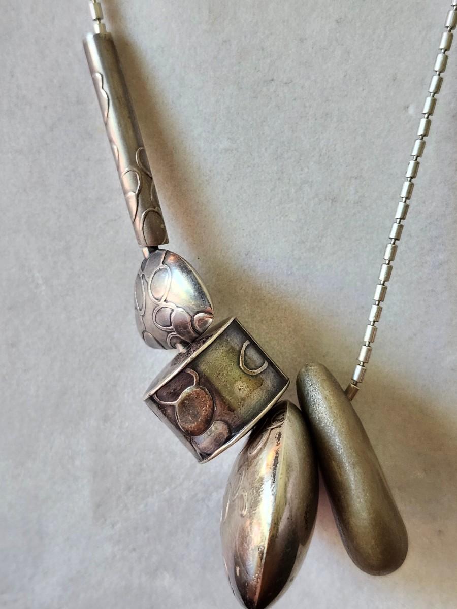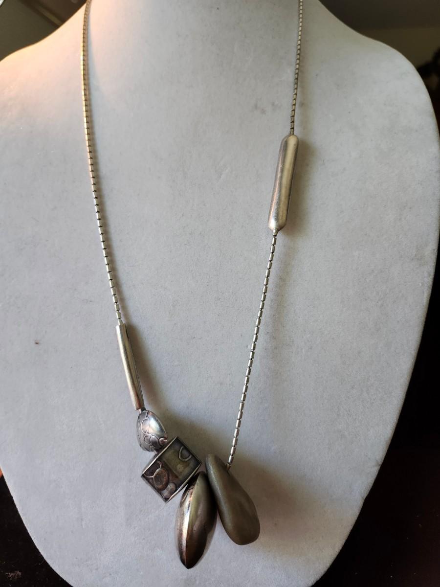 1989 30 Inch necklace with embossed pillow charms, hollow fabricated silver forms. Signed.