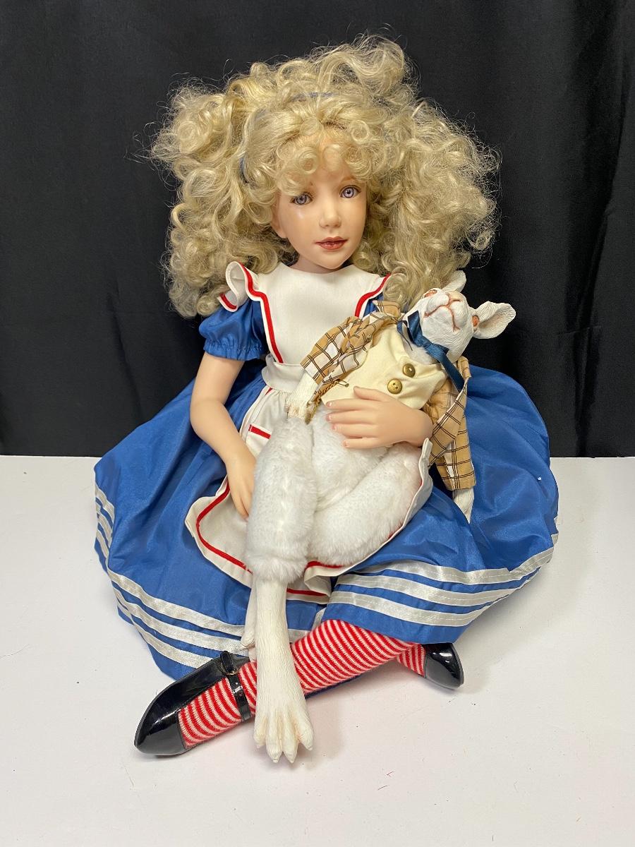 2001 Jane Bradbury Alice in Wonderland doll with white rabbit. Hard vinyl doll is in sitting position. Numbered #0253/1500. In good displayed condition. About 24" sitting.
