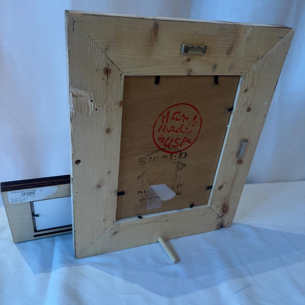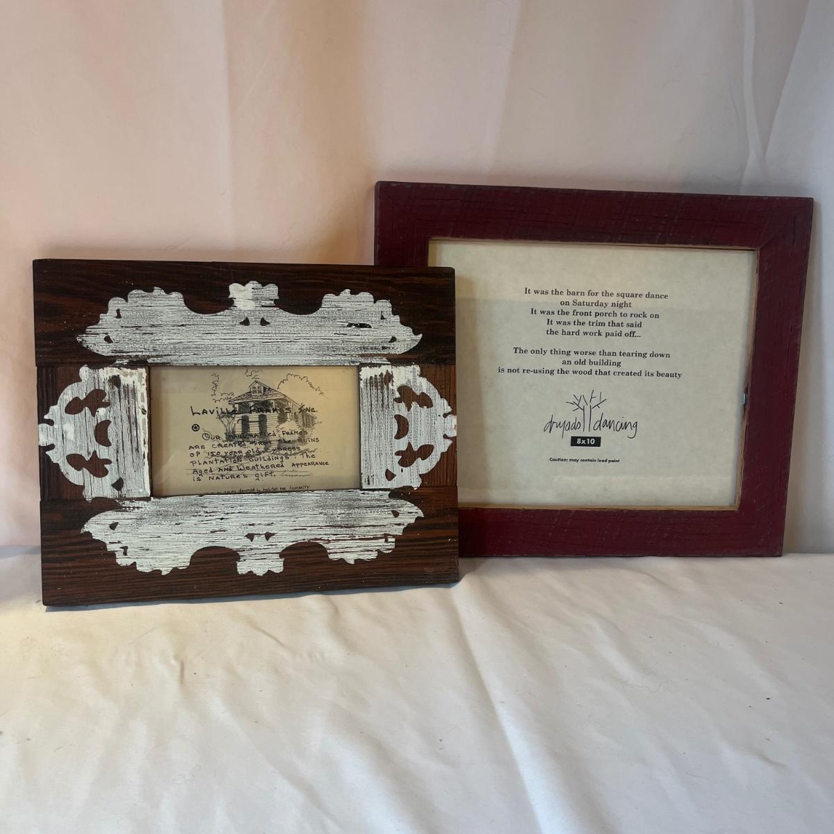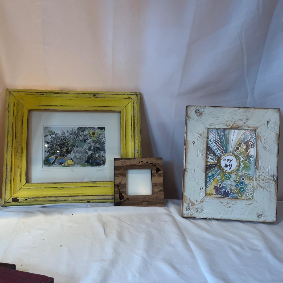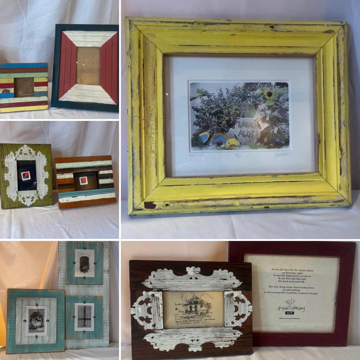 Lot includes a Jana Epstein wooden framed colored photograph and ten more rustic wooden picture frames. Largest piece measures 13” x 29”H.