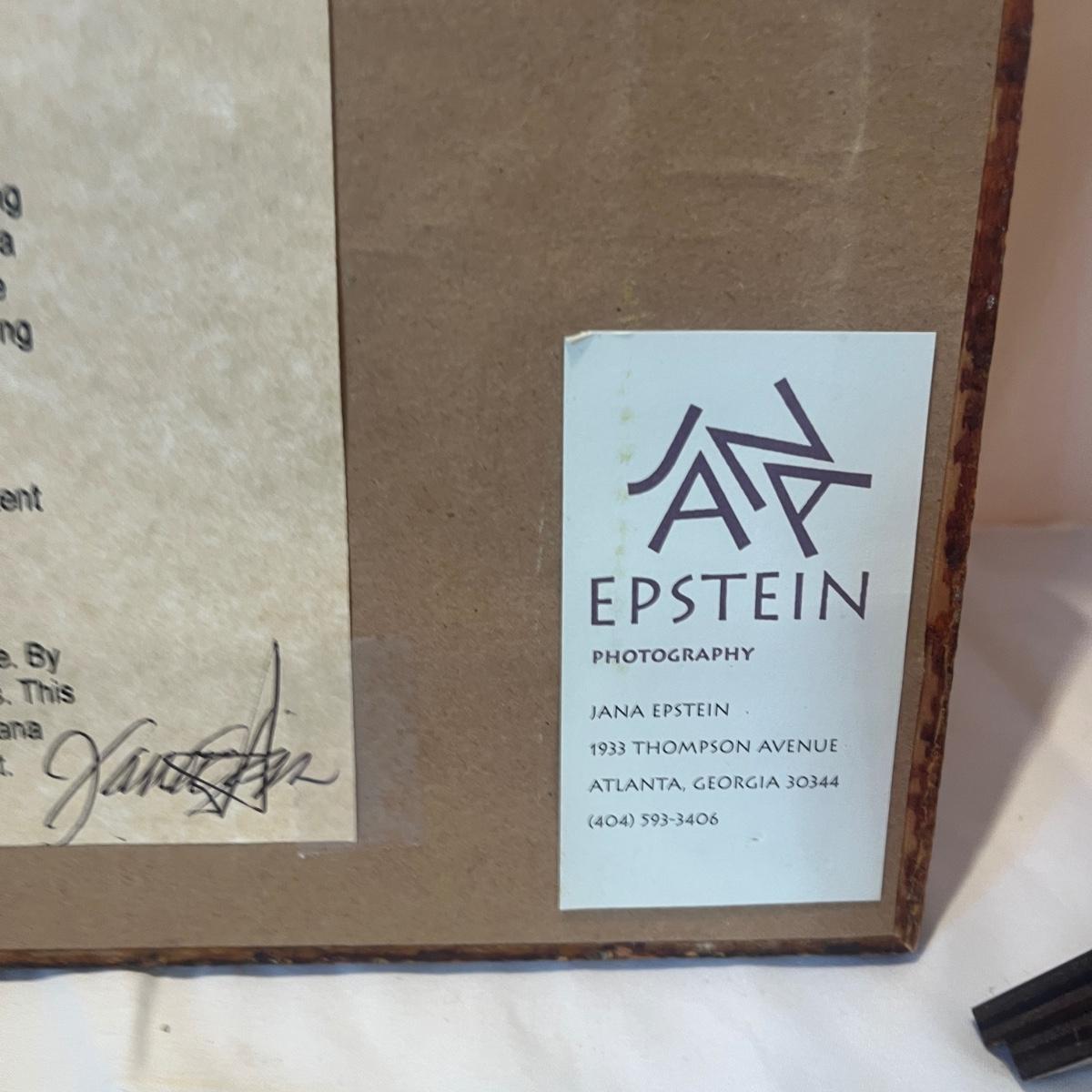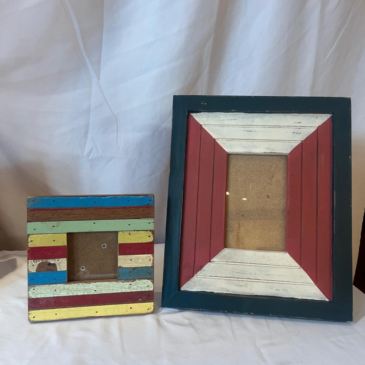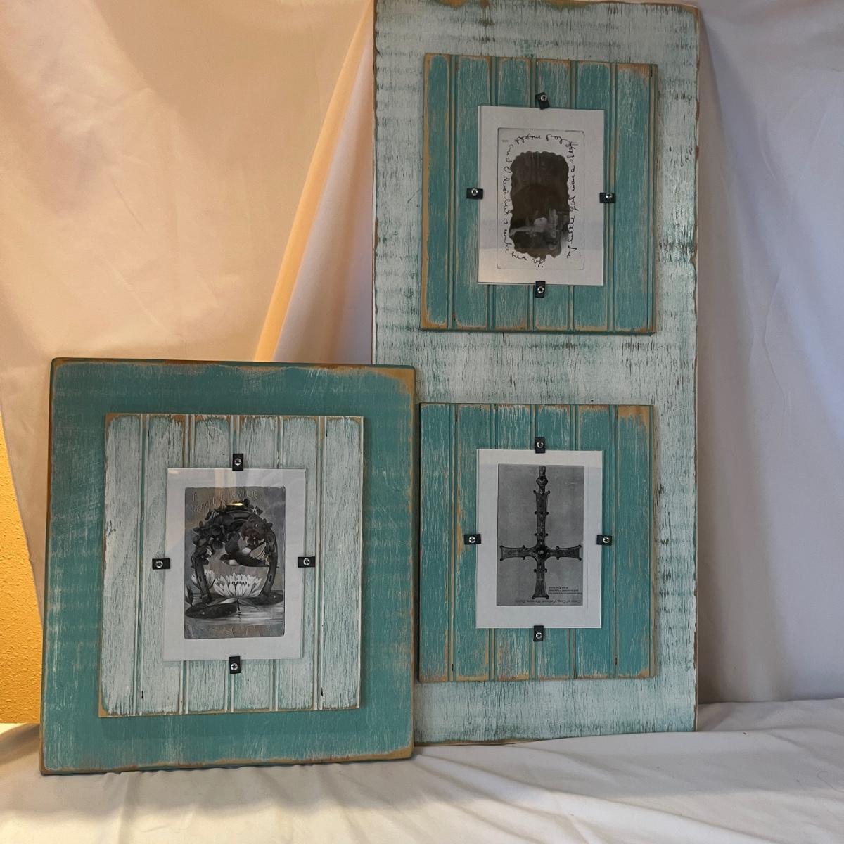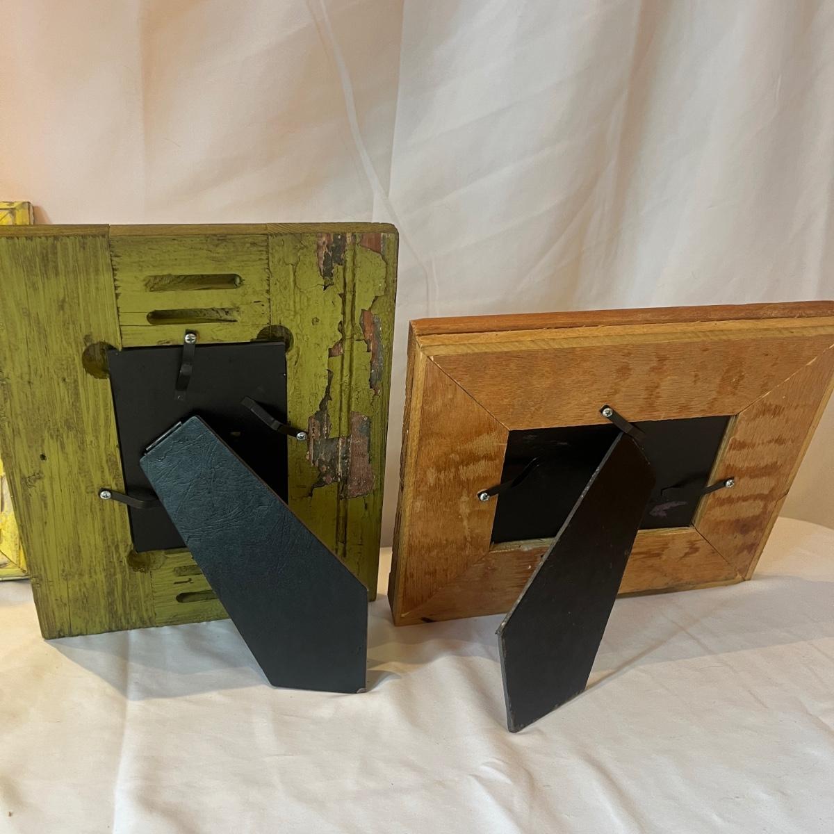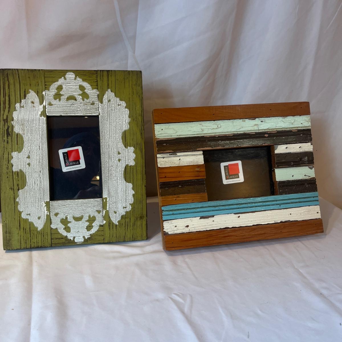 Lot includes a Jana Epstein wooden framed colored photograph and ten more rustic wooden picture frames. Largest piece measures 13” x 29”H.