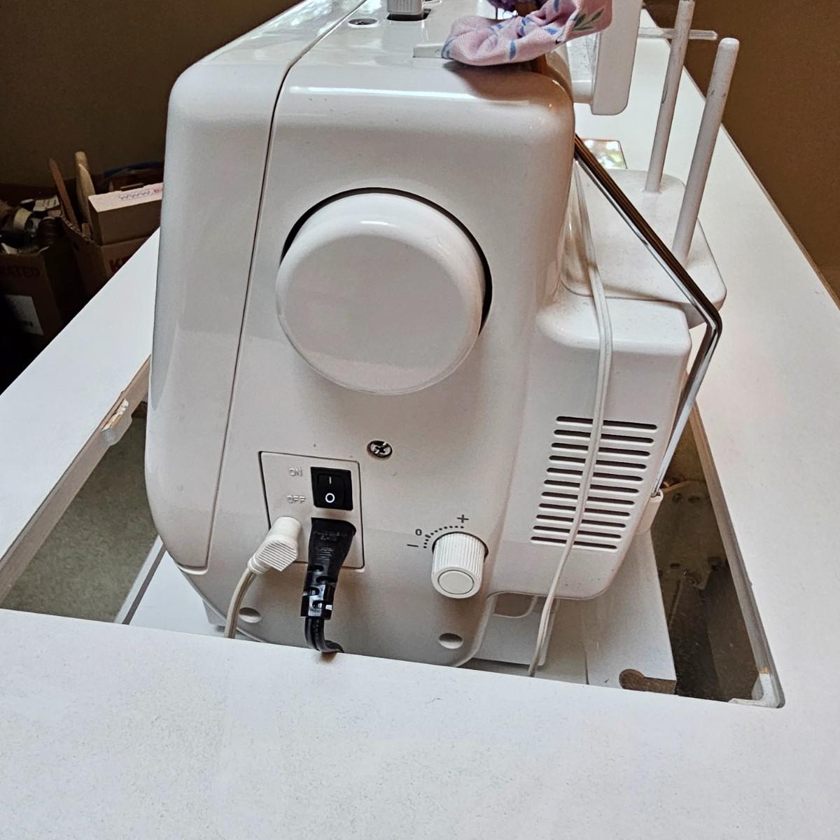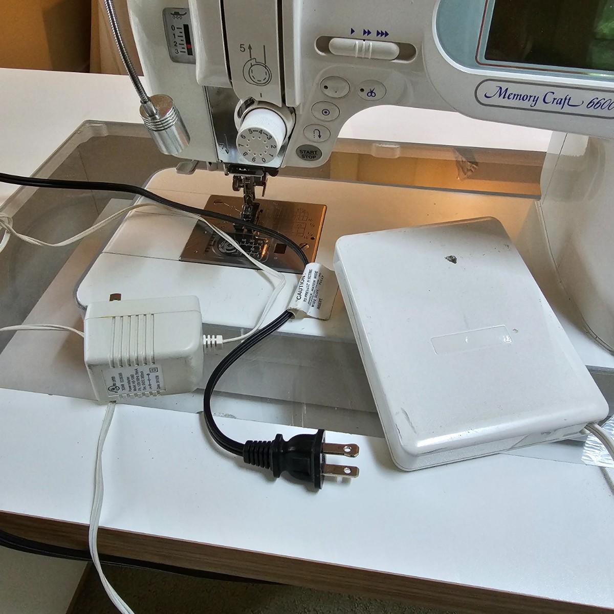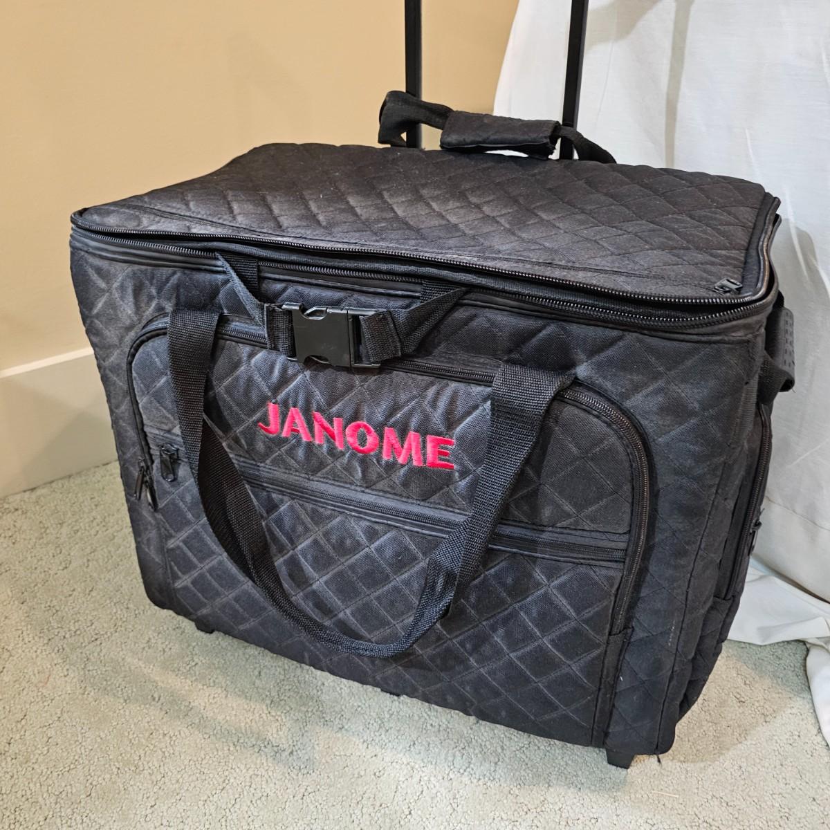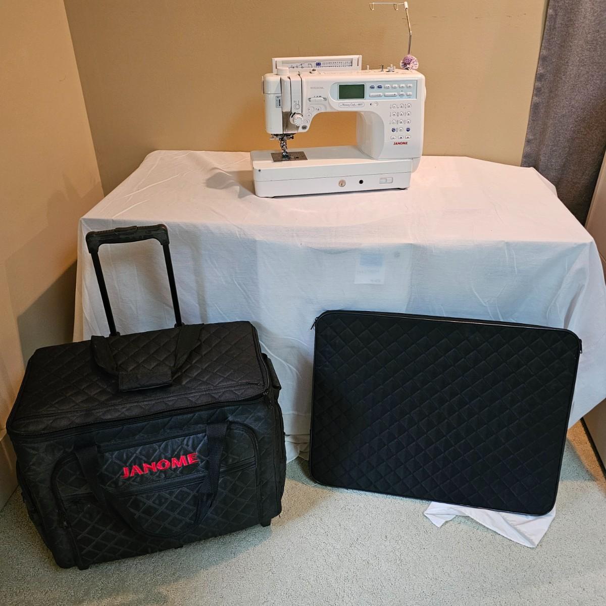 One Janome Professional 6600 P sewing machine with carry case and slide on table, also with case. This machine will sew hundreds of different stitches and patterns, has LED screen on front, auto needle threader, auto thread cutter and more. It powered on when plugged in. Comes with cushioned/padded carry case on wheels, and an auxiliary sewing table with its own padded case. Also has power cord, foot pedal, accessory kit and an additional high intensity light above the needle area. Case measures approximately 24” x 14” x 18”H. This lot does not include the large Horn of America sewing station or the lucite panel to fit the Janome. These items are listed in a separate lot. in this auction. See photos for details. Shipping available. Shipping can be costly. We suggest contacting our preferred local shipping provider, Postage Express, with dimensions and getting an estimate before bidding: (828) 670-5501 or postageexpress@yahoo.com.