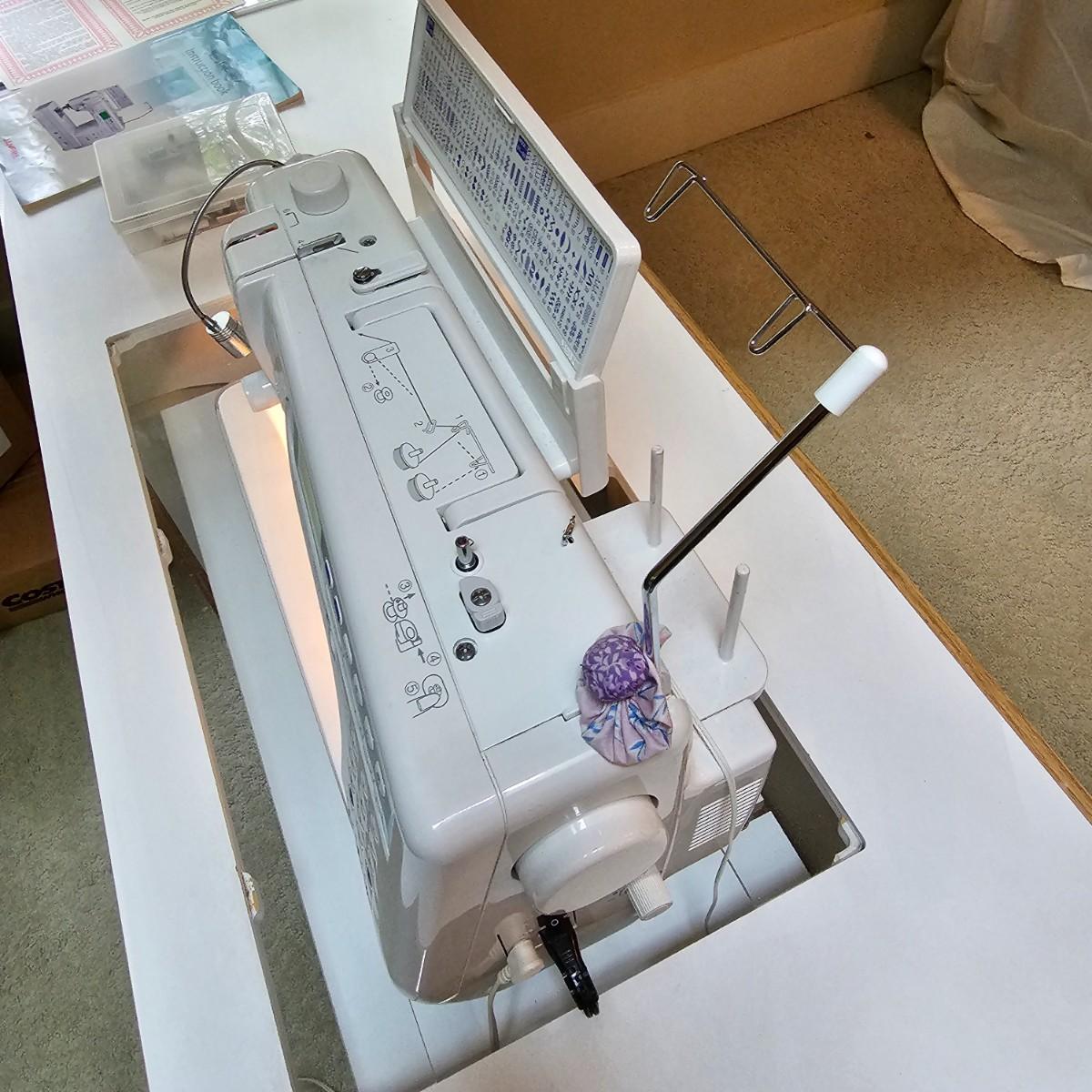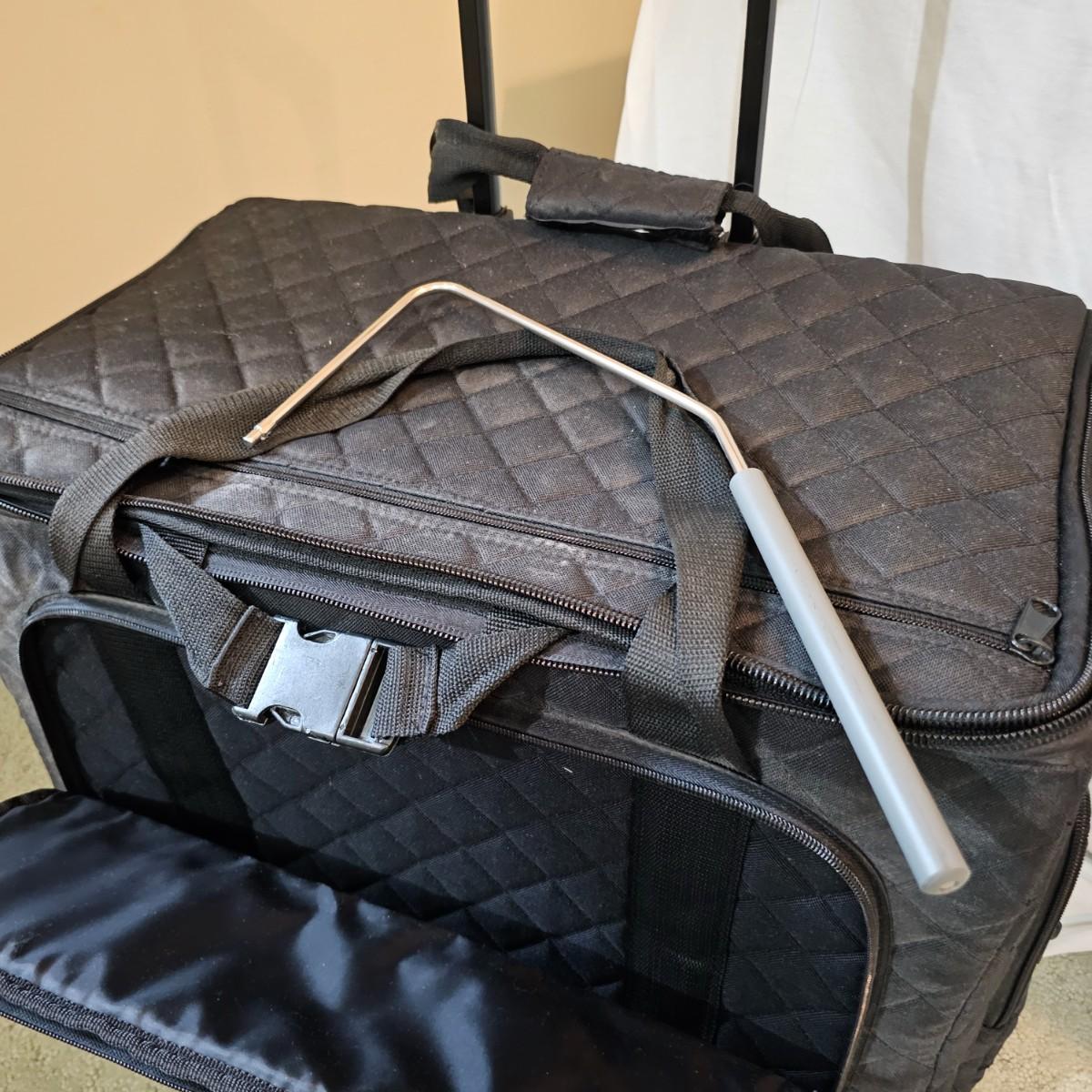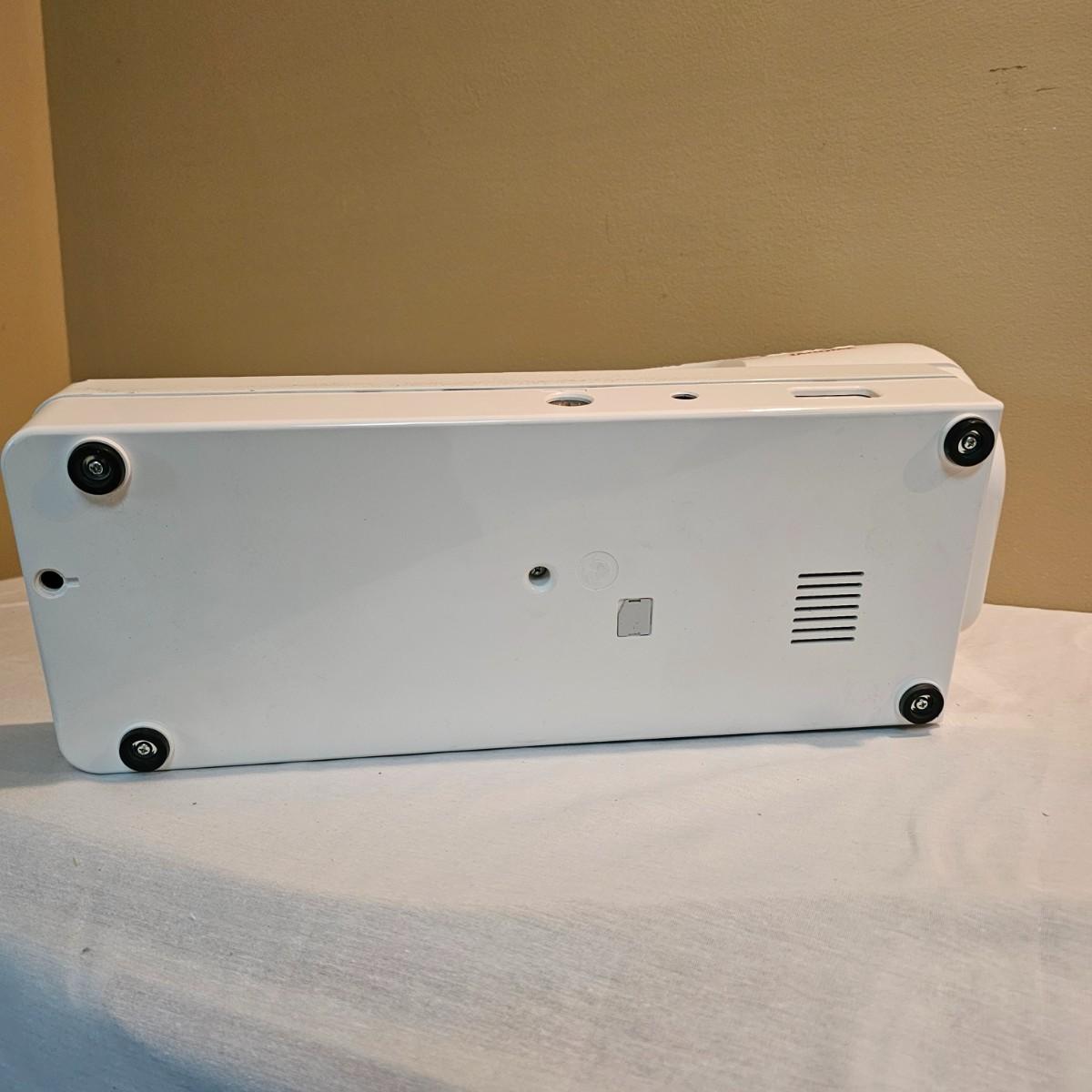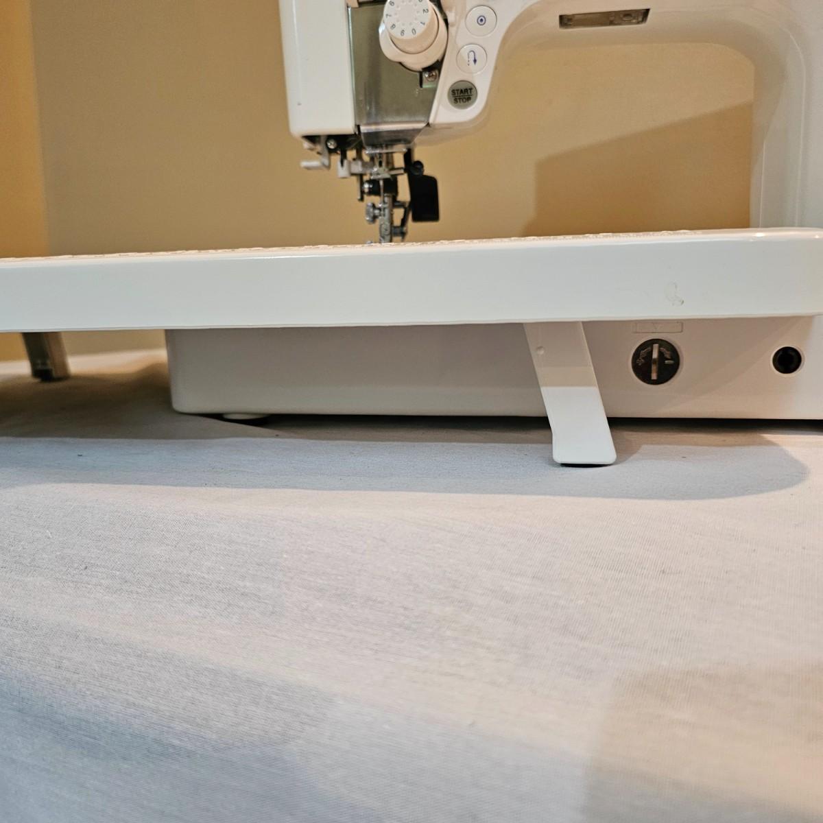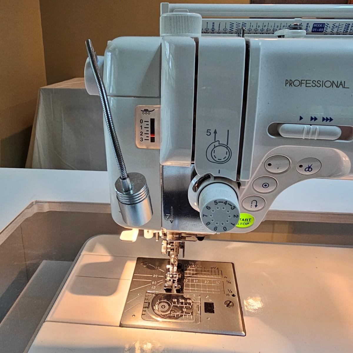 One Janome Professional 6600 P sewing machine with carry case and slide on table, also with case. This machine will sew hundreds of different stitches and patterns, has LED screen on front, auto needle threader, auto thread cutter and more. It powered on when plugged in. Comes with cushioned/padded carry case on wheels, and an auxiliary sewing table with its own padded case. Also has power cord, foot pedal, accessory kit and an additional high intensity light above the needle area. Case measures approximately 24” x 14” x 18”H. This lot does not include the large Horn of America sewing station or the lucite panel to fit the Janome. These items are listed in a separate lot. in this auction. See photos for details. Shipping available. Shipping can be costly. We suggest contacting our preferred local shipping provider, Postage Express, with dimensions and getting an estimate before bidding: (828) 670-5501 or postageexpress@yahoo.com.
